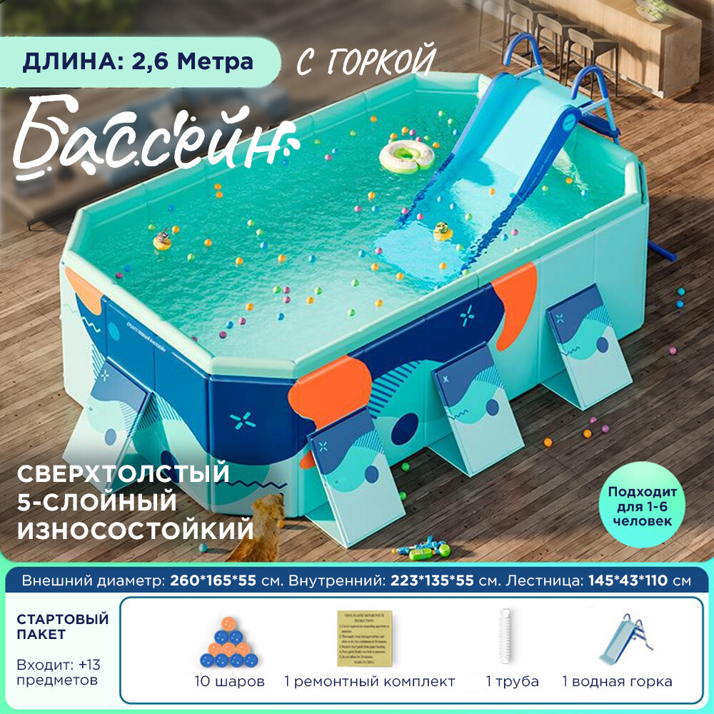 Складной детский плавательный бассейн домашний, 2.6 м, титановая алюминиевая опорная сталь стандарт + горка