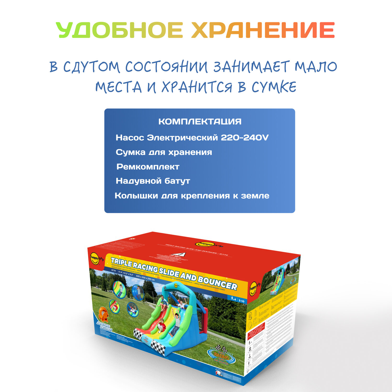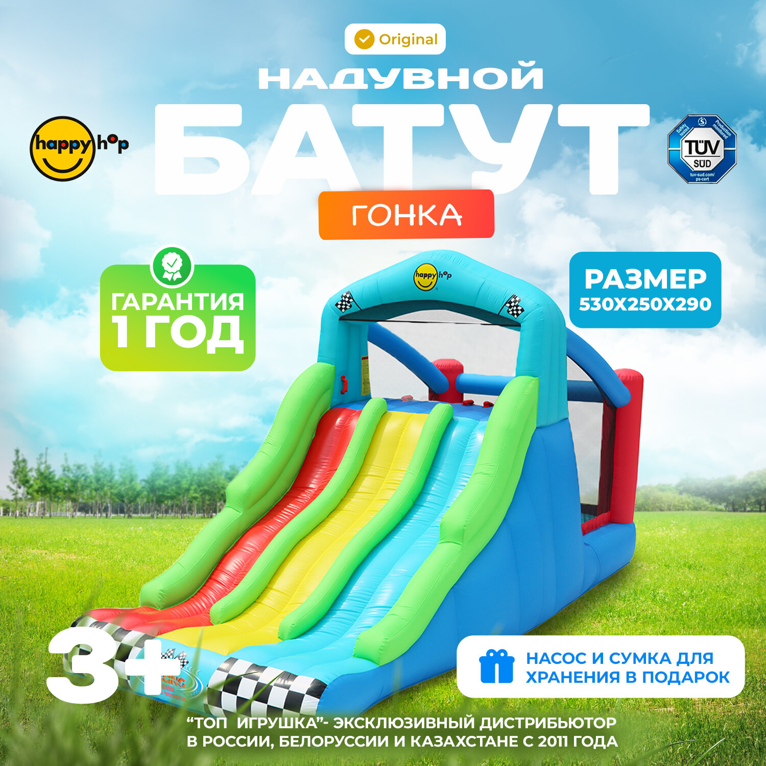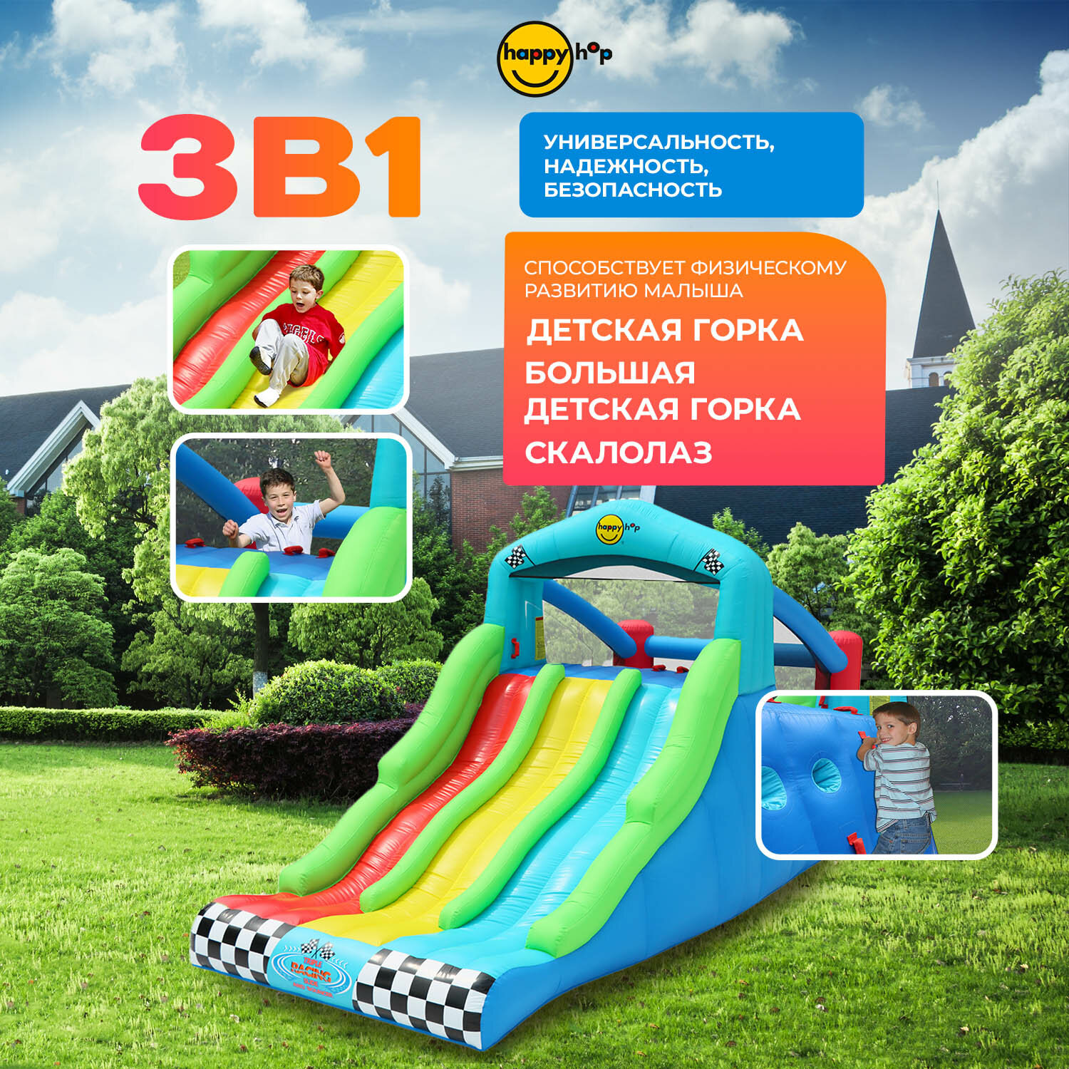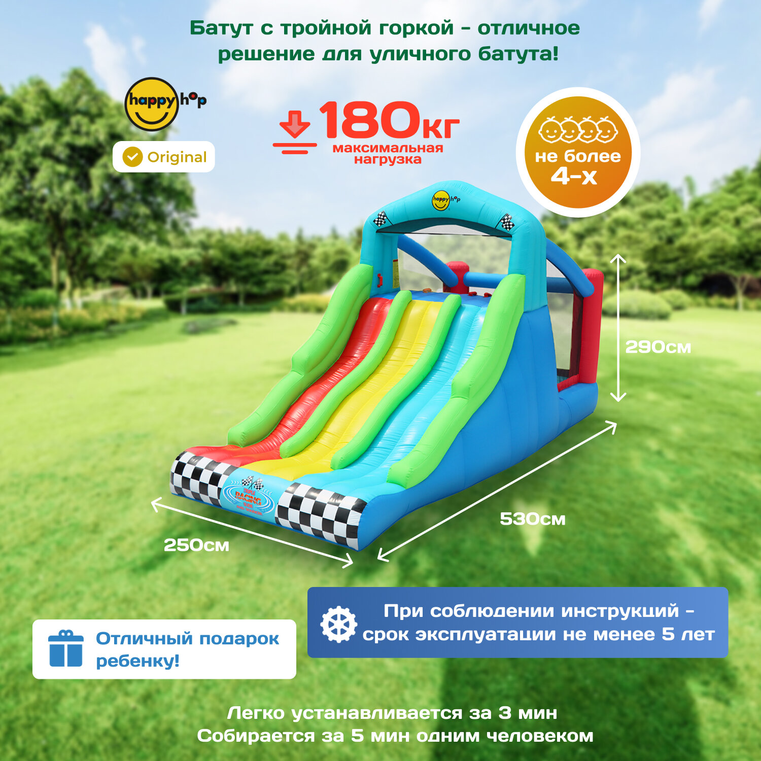 Купить Детский надувной батут Happy Hop с защитной сеткой для дома и дачи, с тройной большой горкой "Гонка", 600х215х285 см
