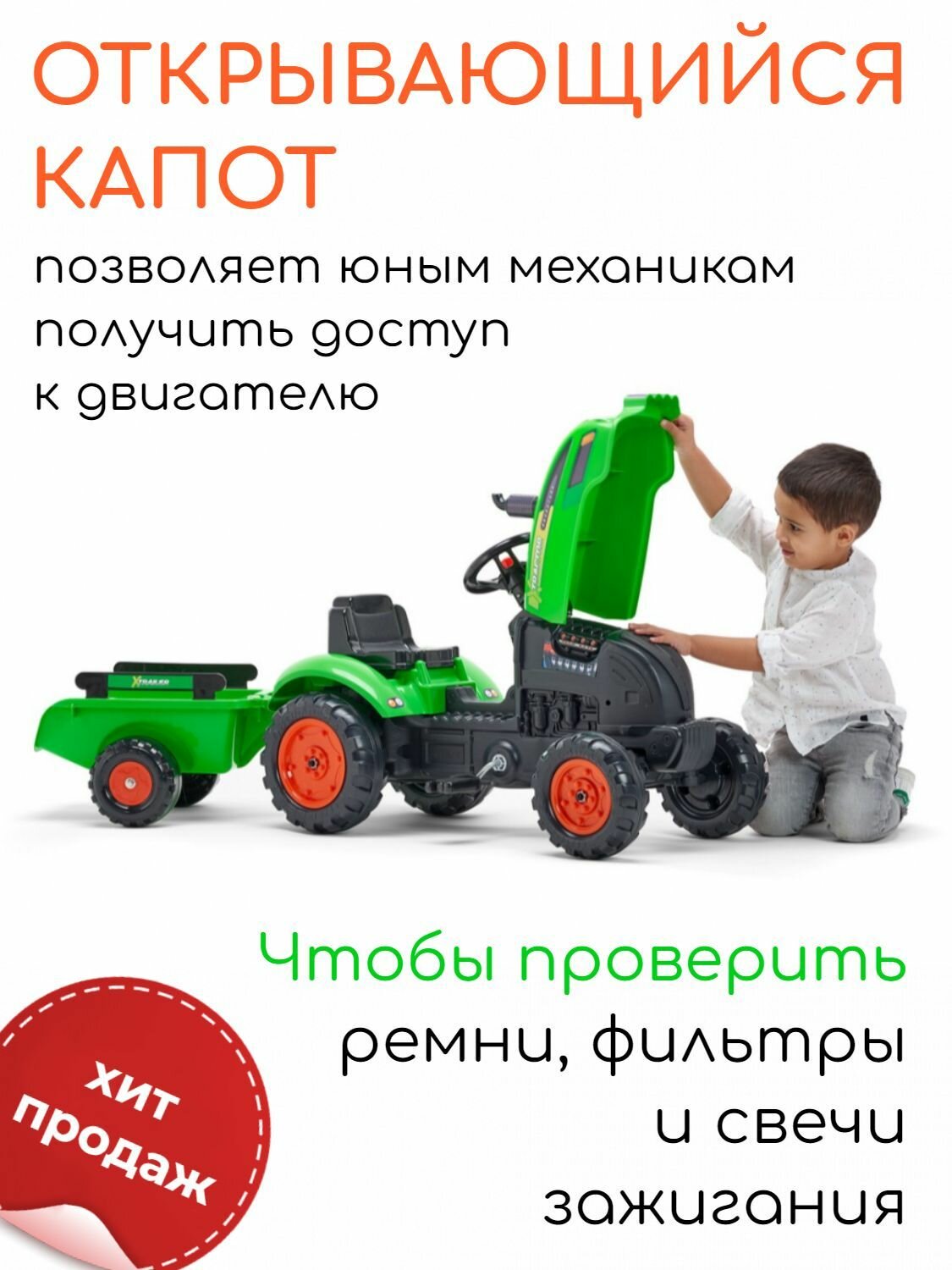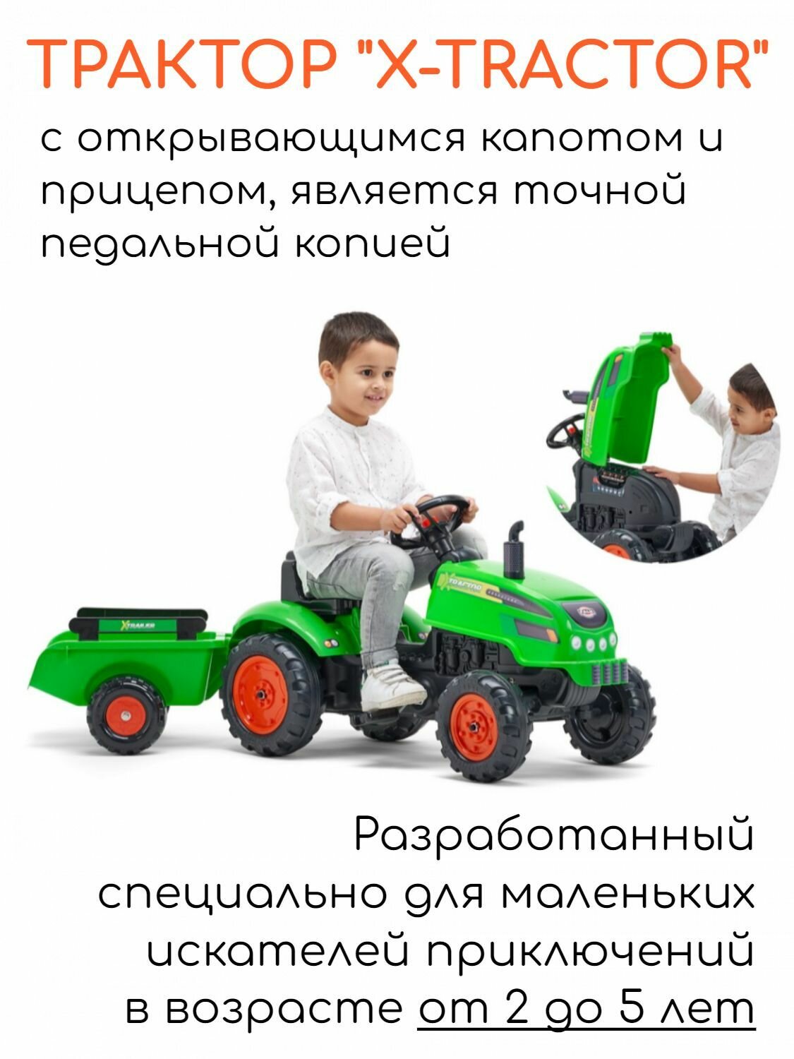 Трактор с педалями, открывающимся капотом и прицепом FALK; зеленый интересное: