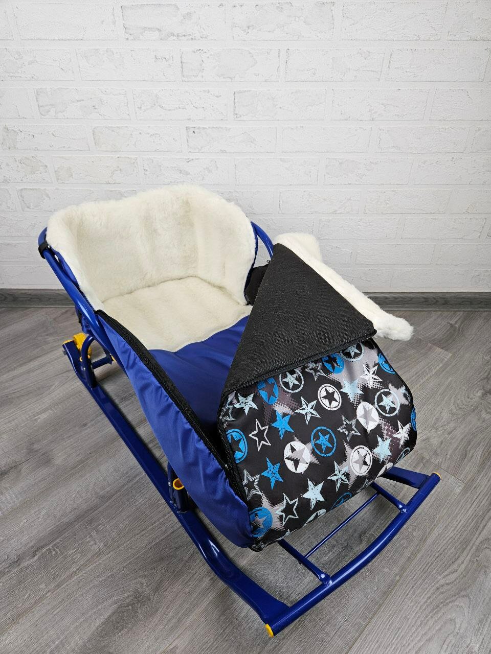 Матрасик для санок меховой 3 в 1 Краски бок темно-синий мех белый