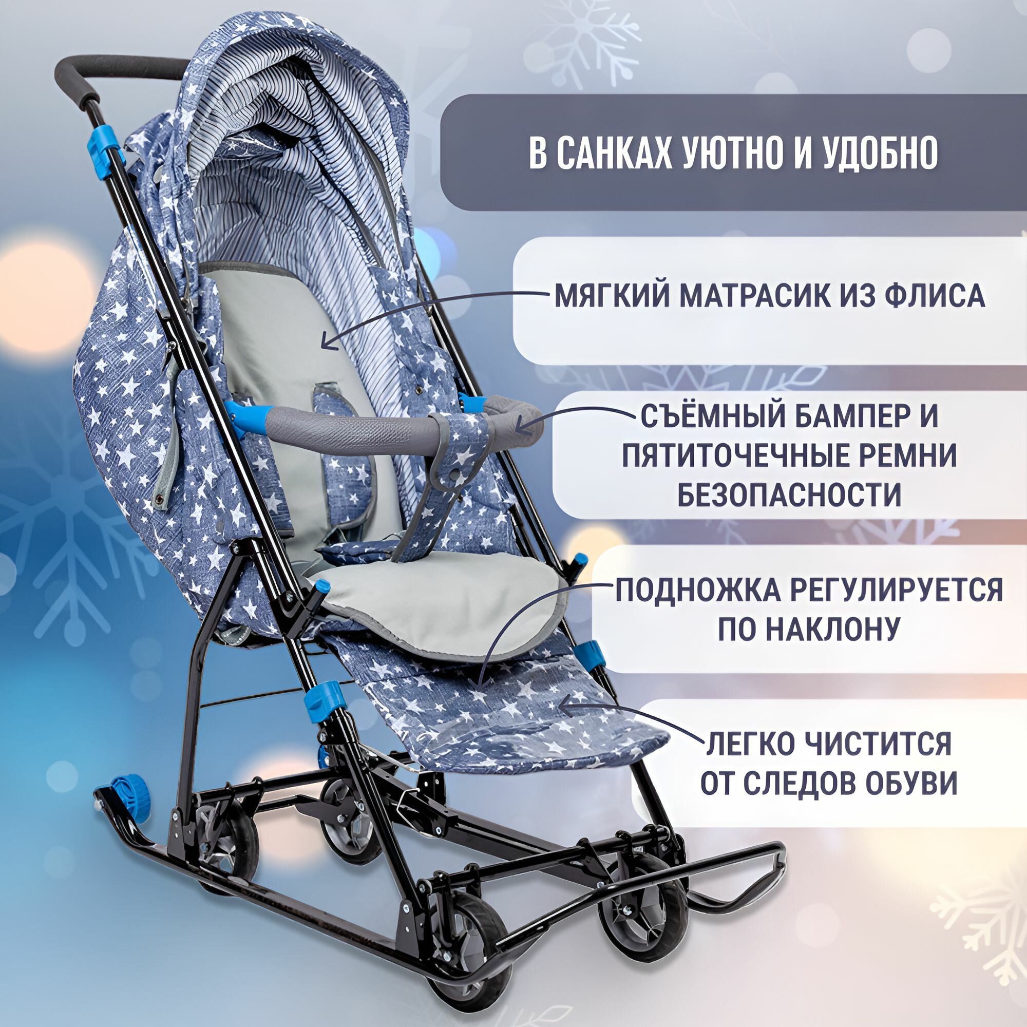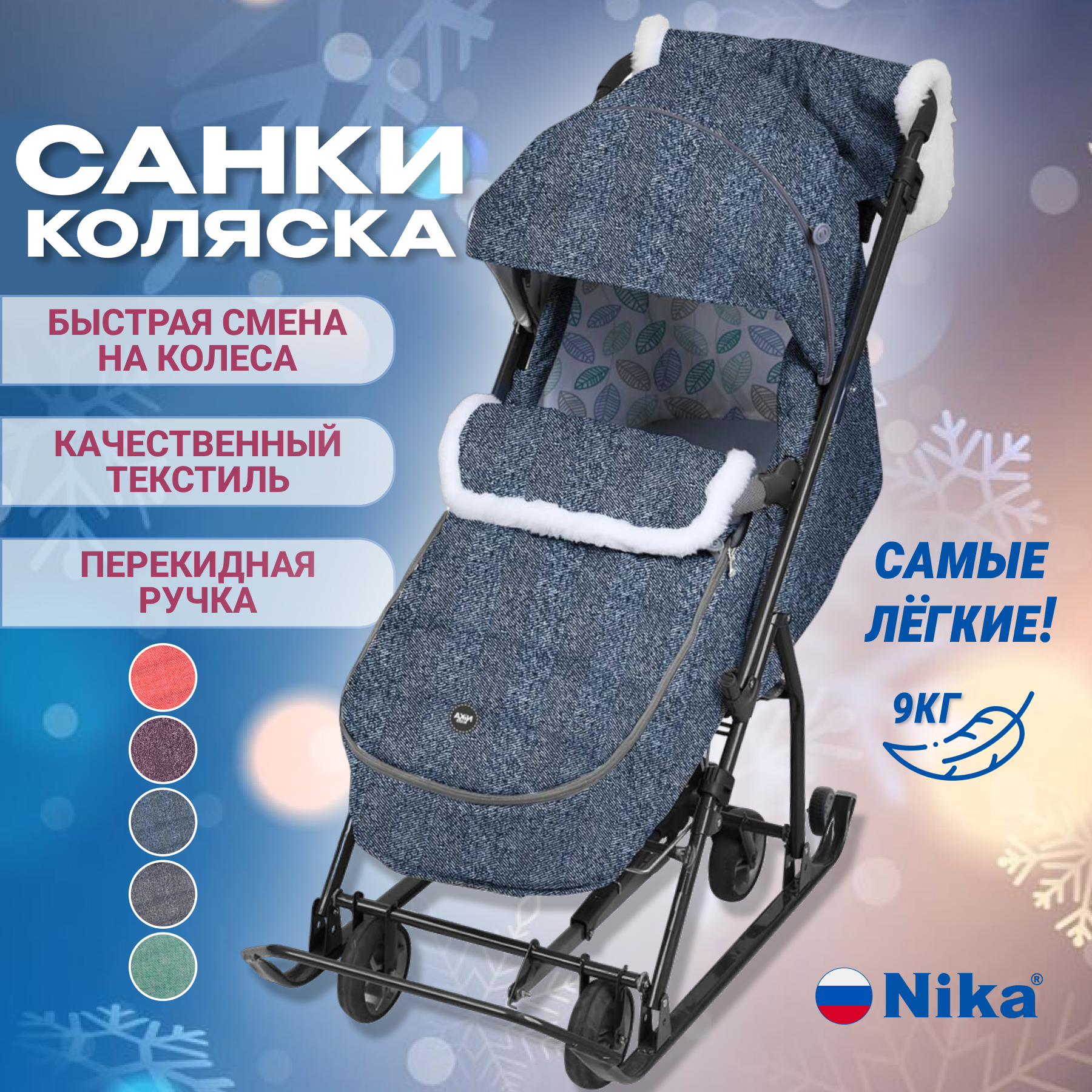Санки коляска зимние на колесах Ника НДТ-6, легкие, перекидная ручка, муфта, сумка, положение лежа интересное: