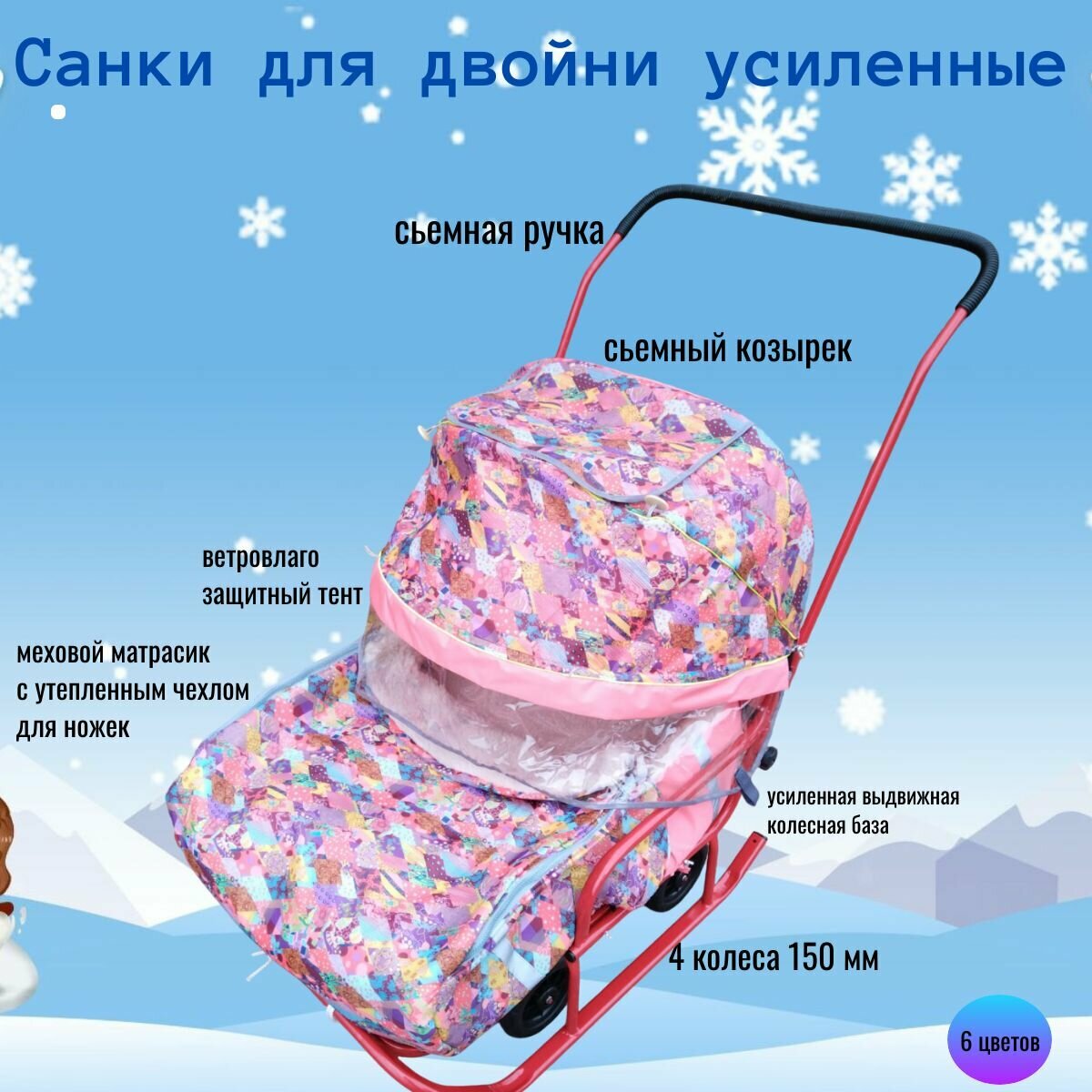 Купить Санки для двойни усиленные с выдвижной колесной базой 4 колеса/с козырьком