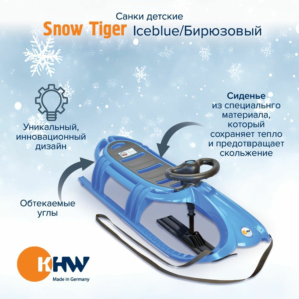 Санки детские с рулем, KHW "Snow Tiger De Luxe", производство Германия, цвет бирюзовый интересное:
