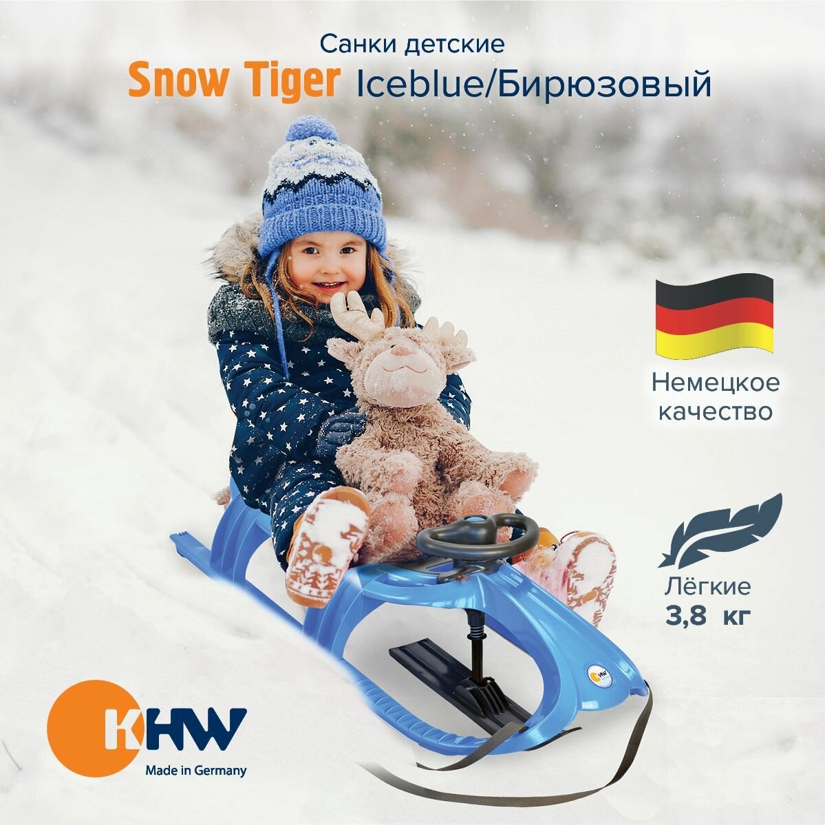 Купить Санки детские с рулем, KHW "Snow Tiger De Luxe", производство Германия, цвет бирюзовый