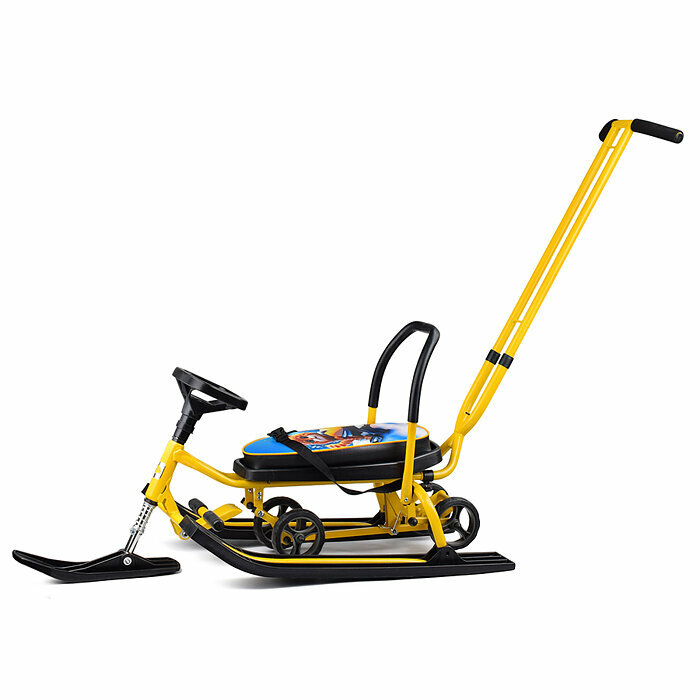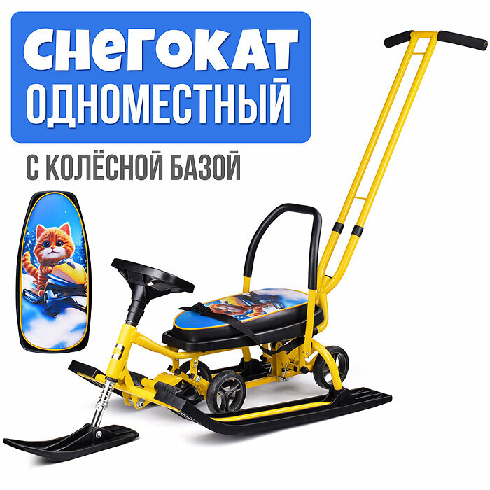 Купить Снегокат детский 111 "Mobile" с Т-образным толкателем и колесной базой (Котик на желтом снег