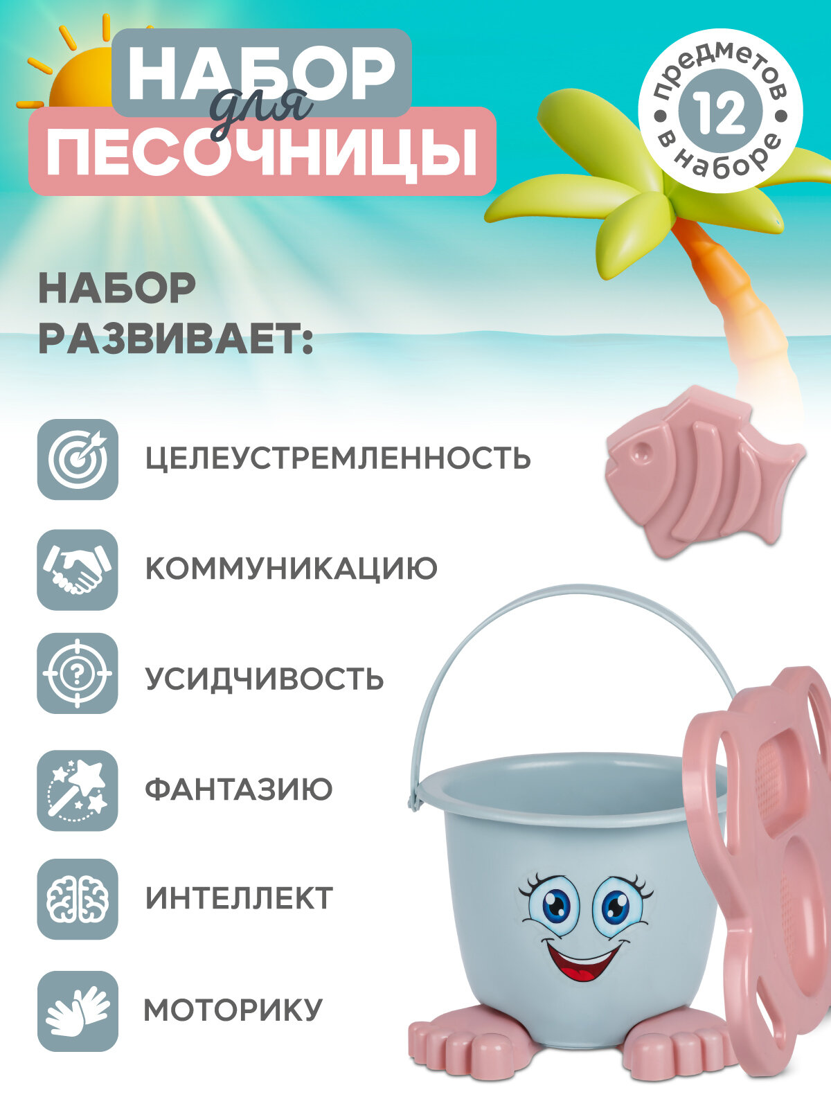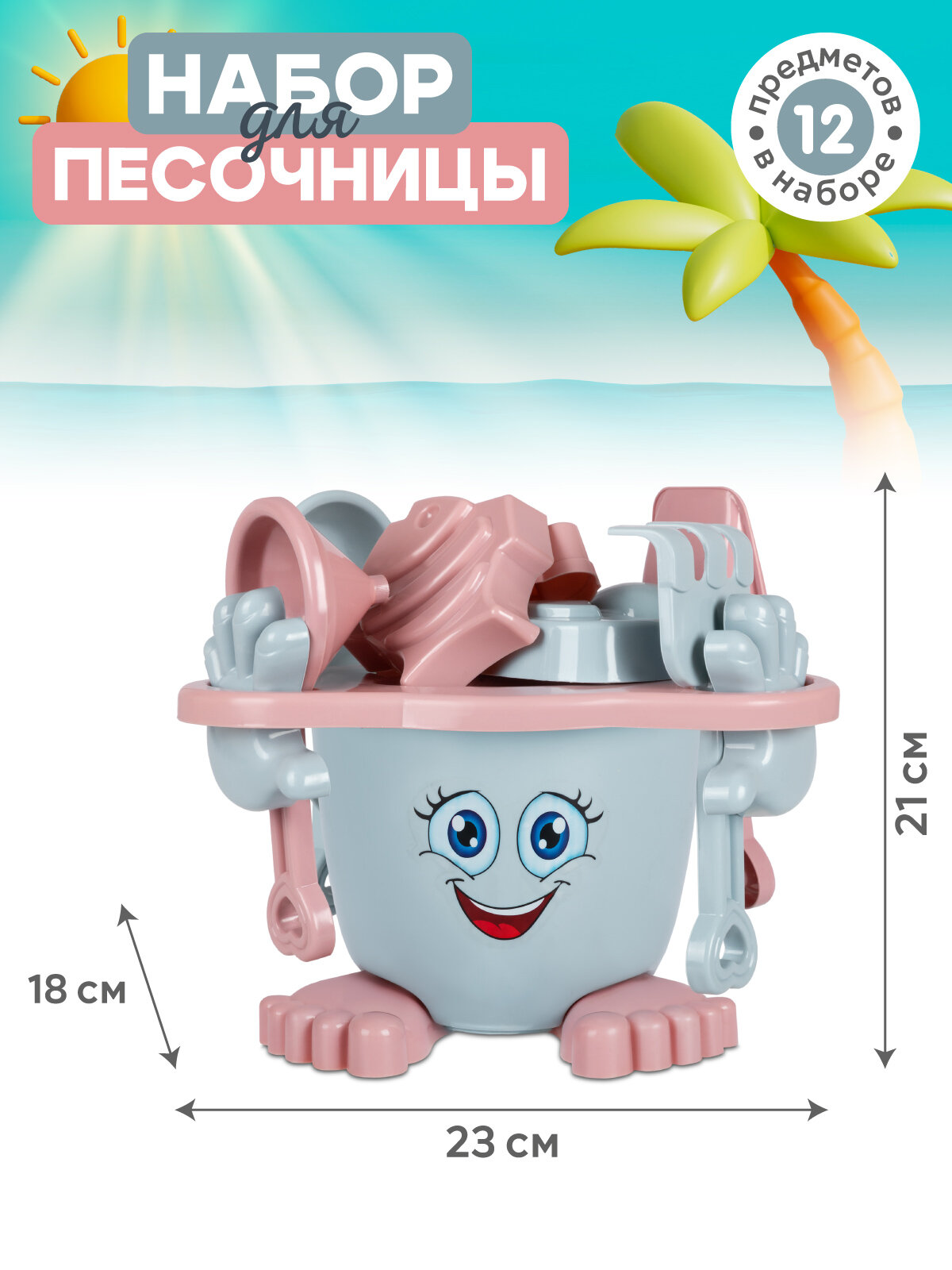 Купить Песочный набор "Человечек", ведёрко с крышкой, лопатка, грабли, воронка, сито, формочки, JB5300905