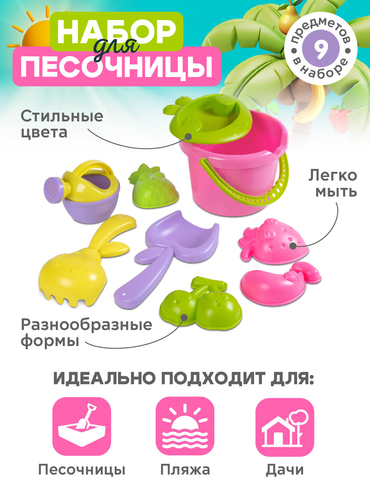 Купить Песочный набор "Фрукты", ведёрко, сито, леечка, лопатка, грабли и 4 формочки, JB5300921