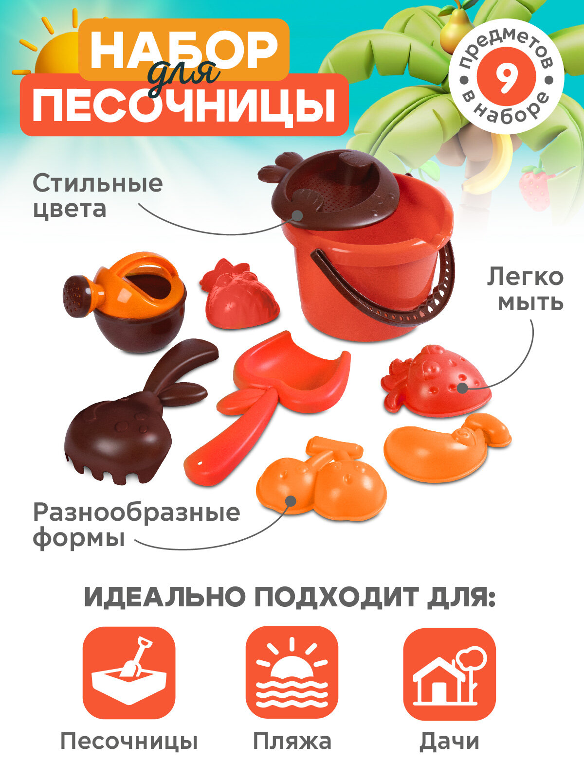 Купить Песочный набор "Фрукты", ведёрко, сито, леечка, лопатка, грабли и 4 формочки, JB5300922