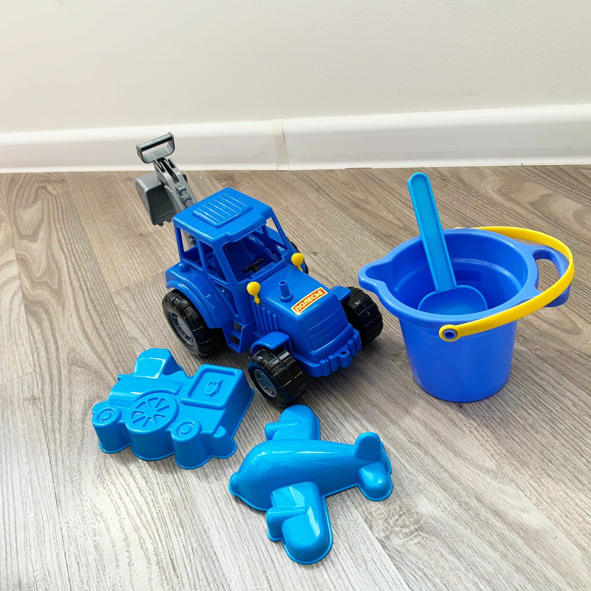Набор для песочницы с синим трактором 21 см с копалкой, 2-мя формочками, ведерком и совком / Полесье интересное:
