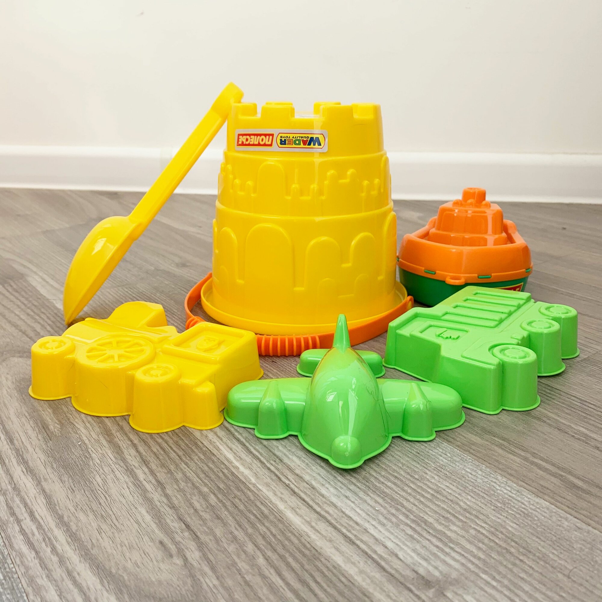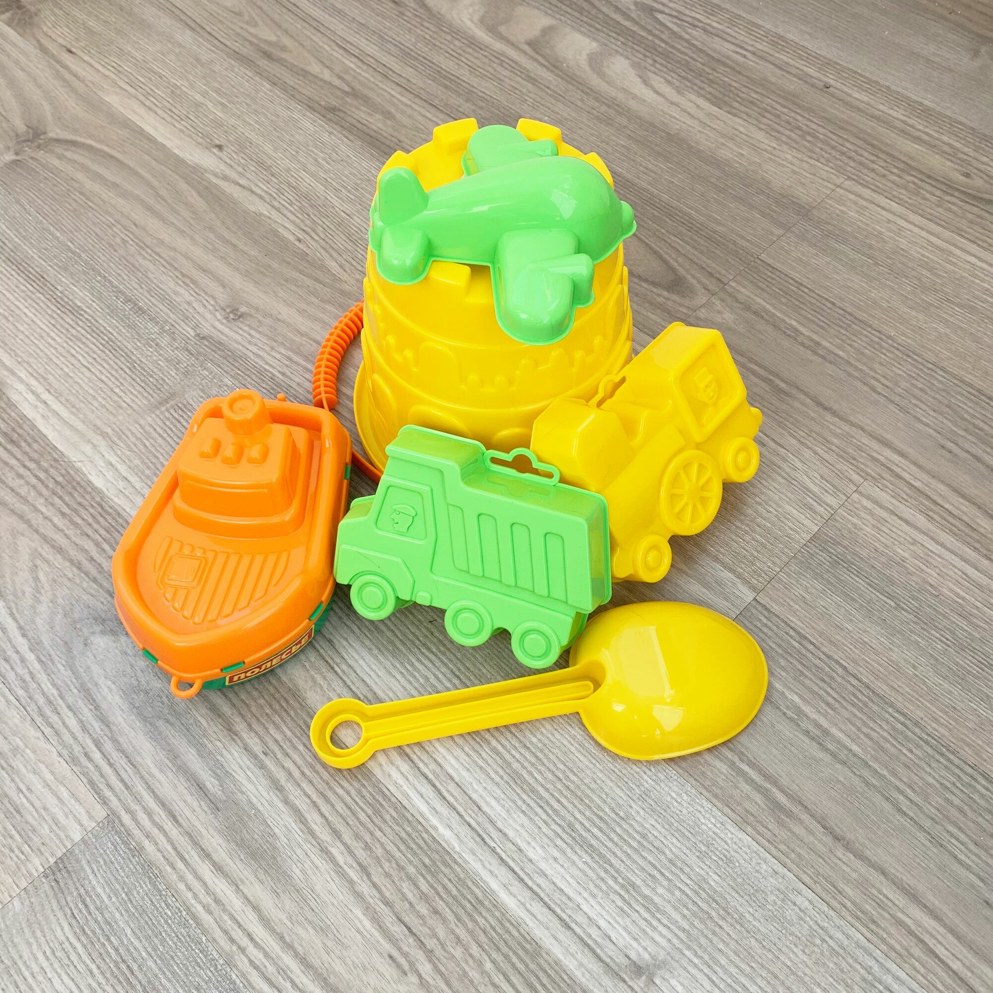 Набор для песочницы: формочки самосвал паровоз, кораблик, совок и ведро Замок 16,5х15 см, 1,9 л. / Полесье интересное: