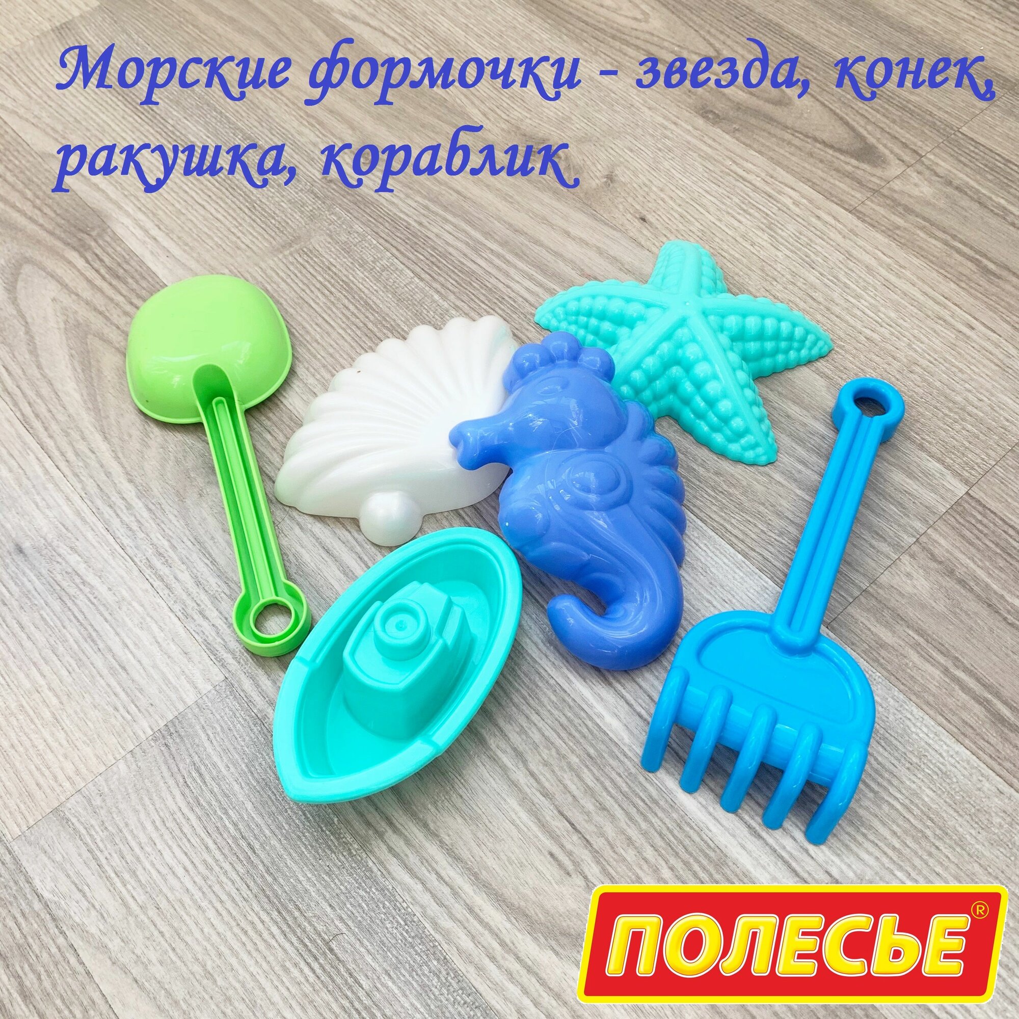 Купить Игрушки для песочницы: Морские формочки (6 эл.) - конёк, звезда, ракушка, кораблик, совок, грабельки (голубые) / Полесье