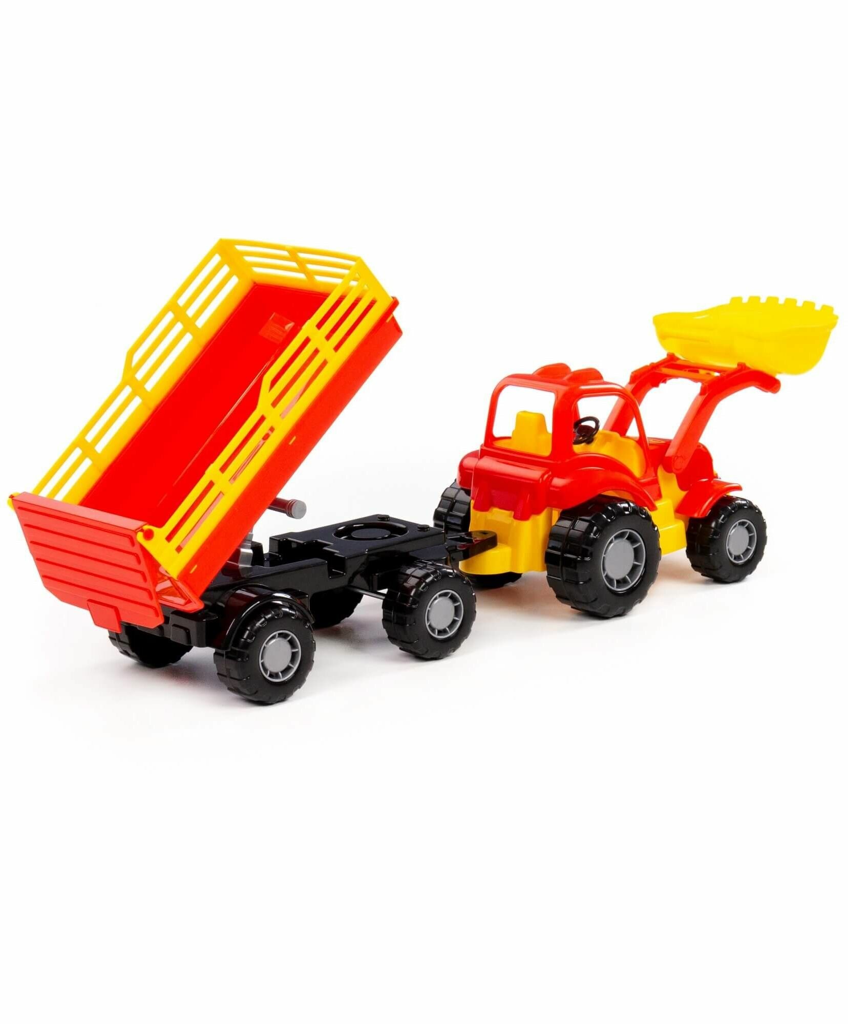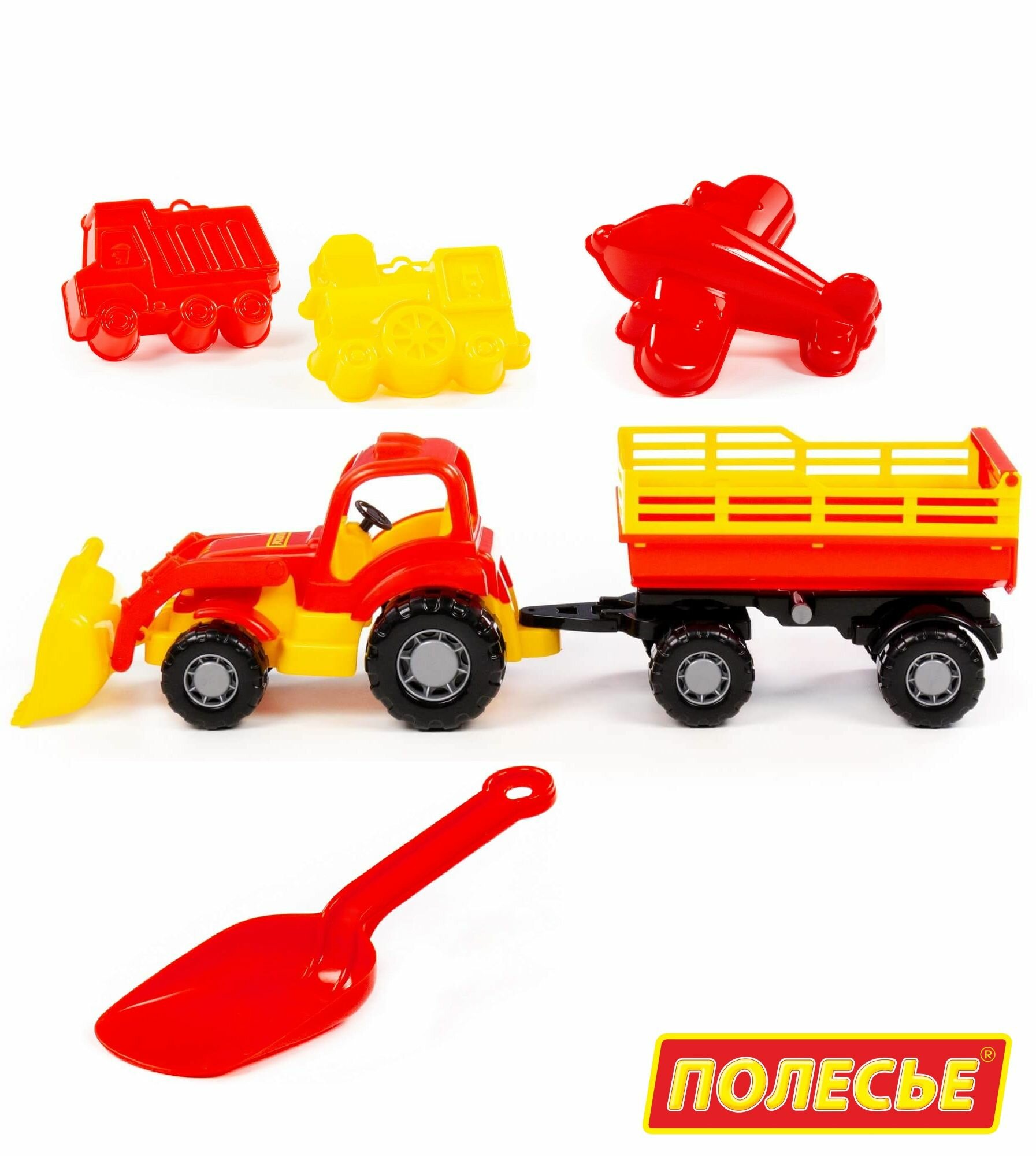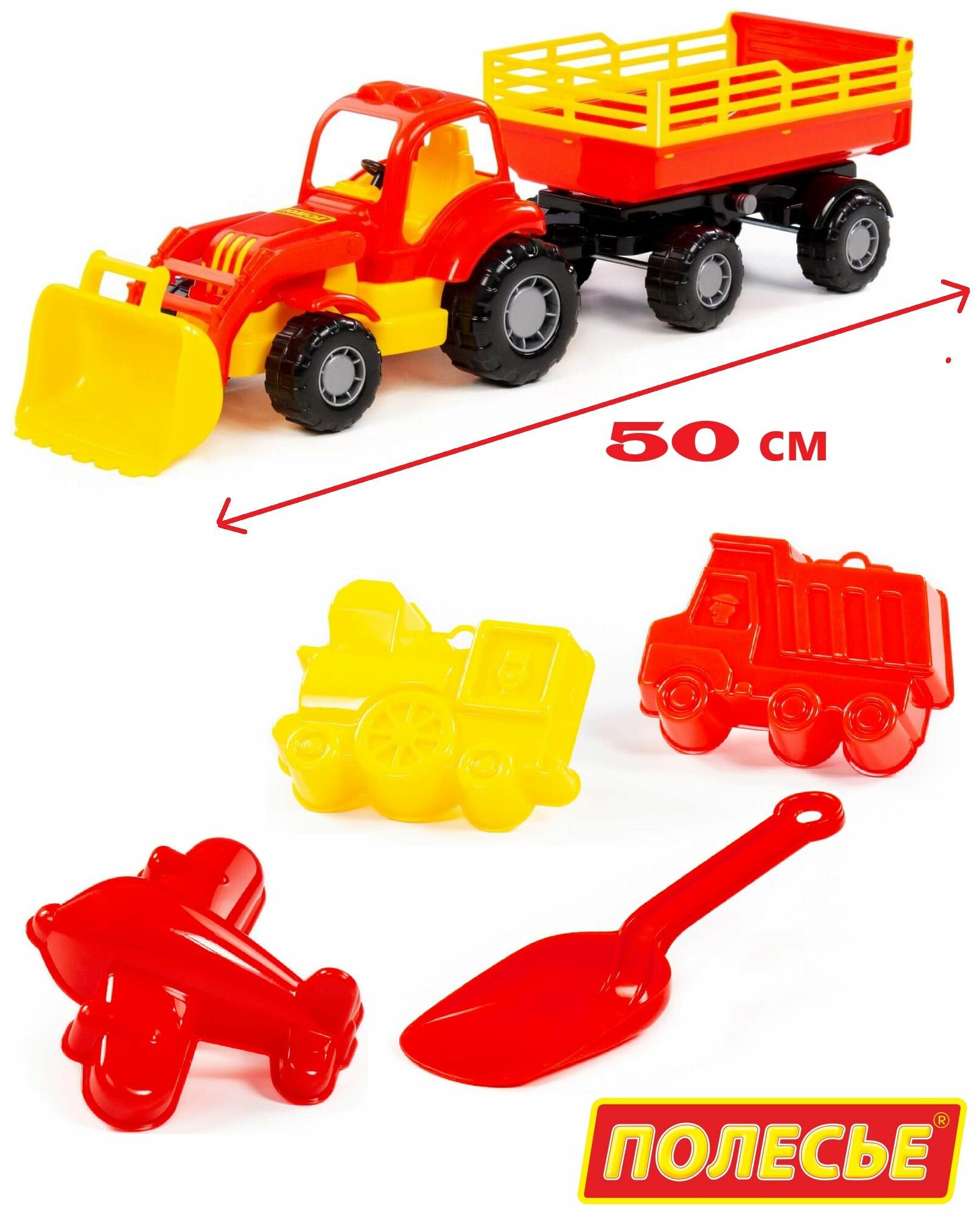 Набор для песочницы: Трактор с грейдером и прицепом (50 см) + 3 формочки, совок / Полесье (красно-желтый) интересное: