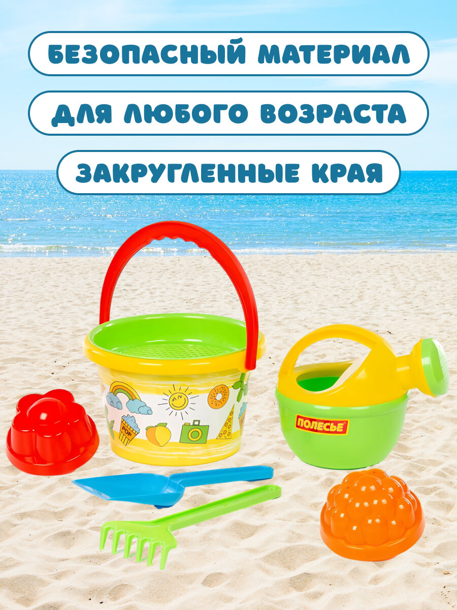 Купить 0658 Набор 224: ведро средн. с наклейкой, ситечко, лопатка, грабельки, 2 формочки, лейка малая 4