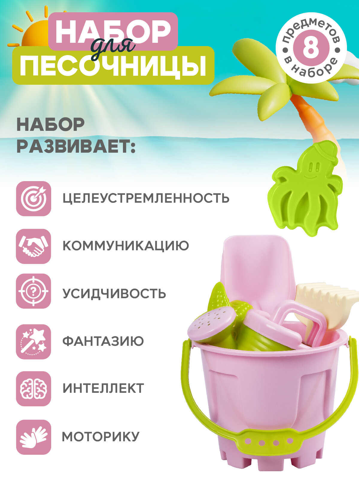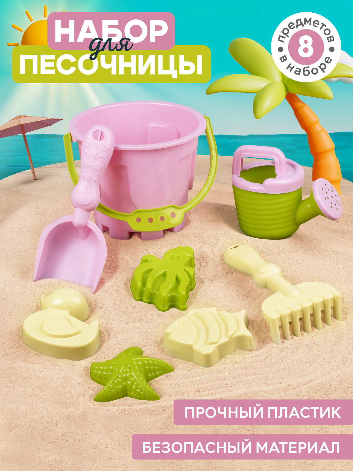Песочный набор, ведерко, лопатка/грабельки, лейка, формочки, бирюзовый/розовый, JB5300538