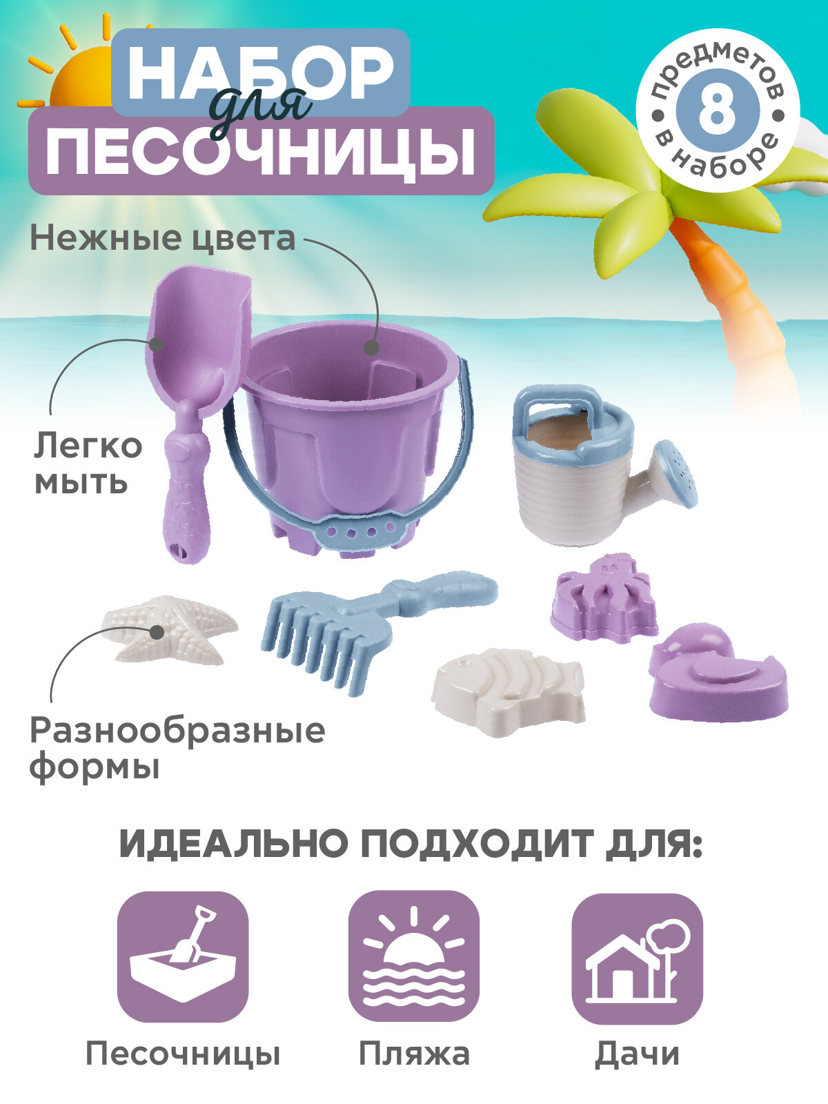 Песочный набор, ведерко, лопатка/грабельки, лейка, формочки, желто-фиолетовый, JB5300539