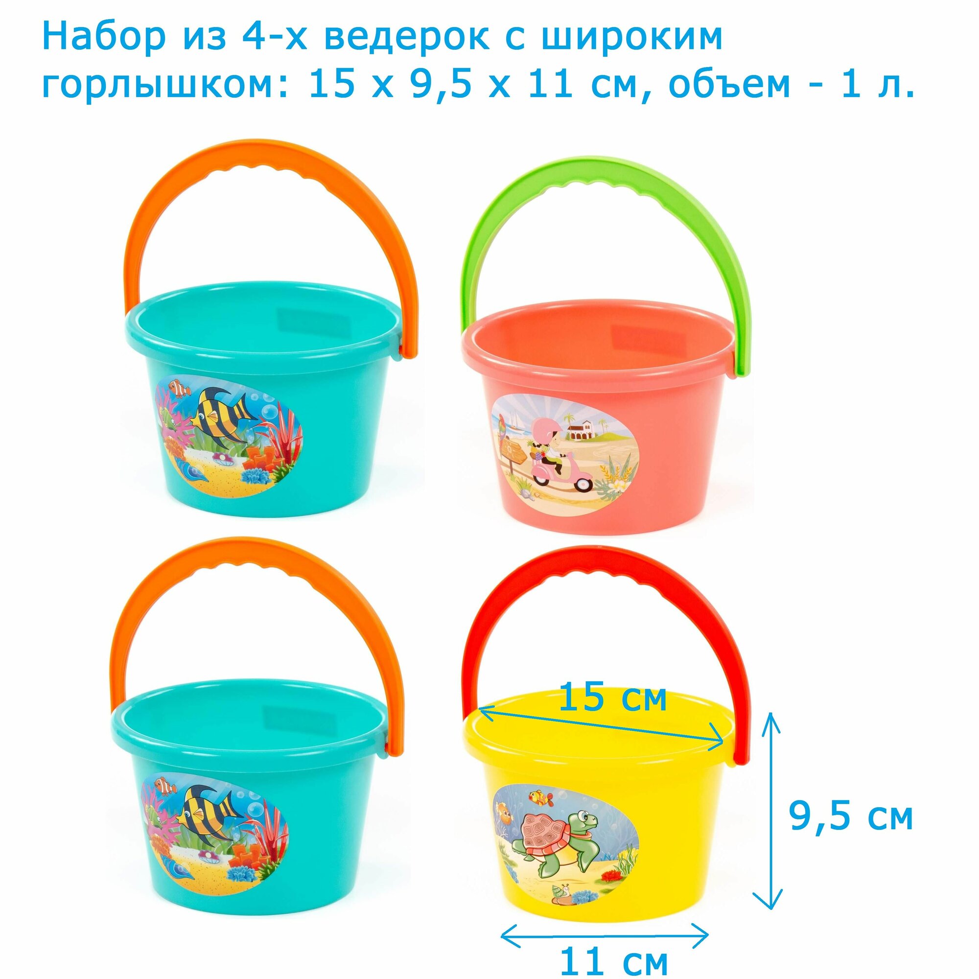 Купить Набор 4 шт. детских ведерок с наклейкой (широкое горлышко) - 15 х 9,5 х 11 см - 1 л