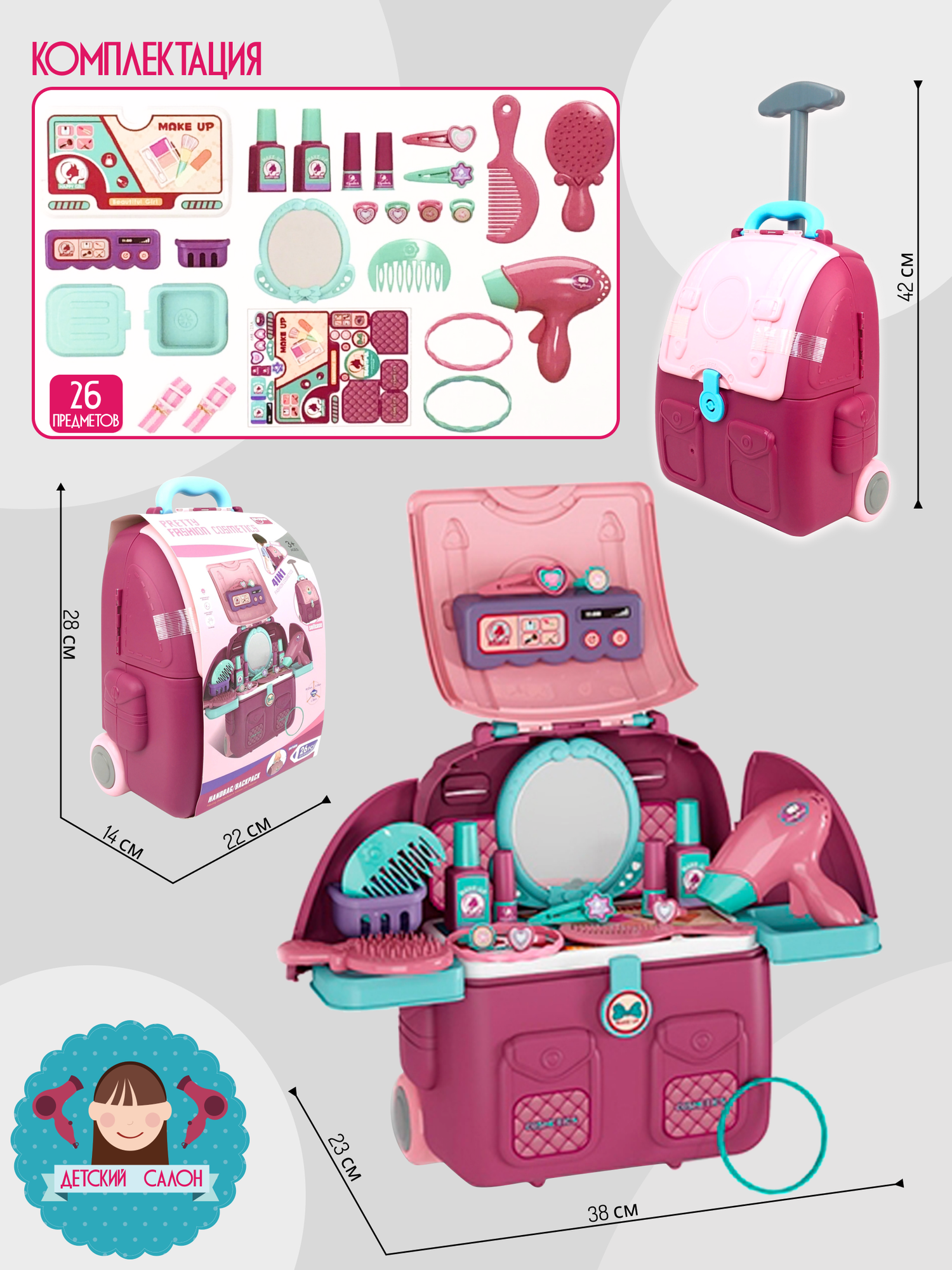 СохранитьДетский игровой набор парикмахера 38 х 23 х 38 см в чемодане, игрушечный салон красоты с 26 аксессуарами, интересное: