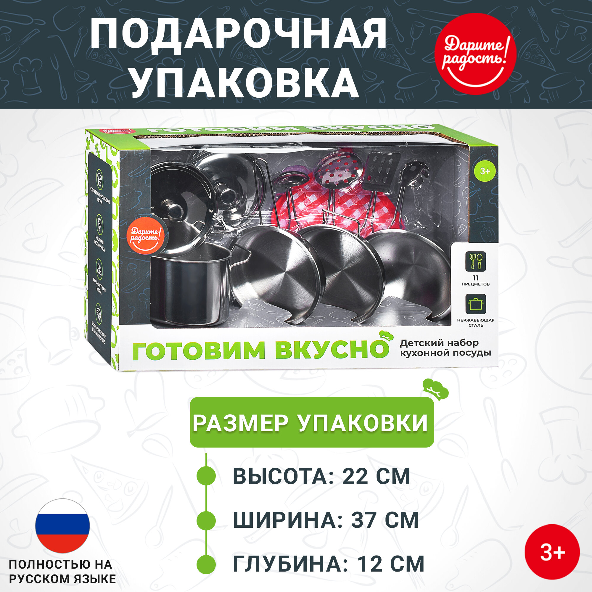 Игрушечная посуда 11 предметов "Готовим вкусно-1" в подарочной коробке. Нержавейка