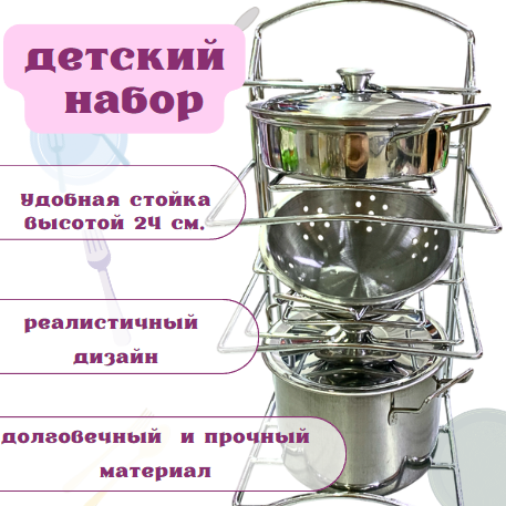 Ниже Вы можете прочитать отзывы на Игровой набор металлической посуды, для детей, на подставке, 7 элементов, ознакомится с подробными характеристиками, посмотреть интересные обзоры и фотографии на Игровой набор металлической посуды, для детей, на подставке, 7 элементов.