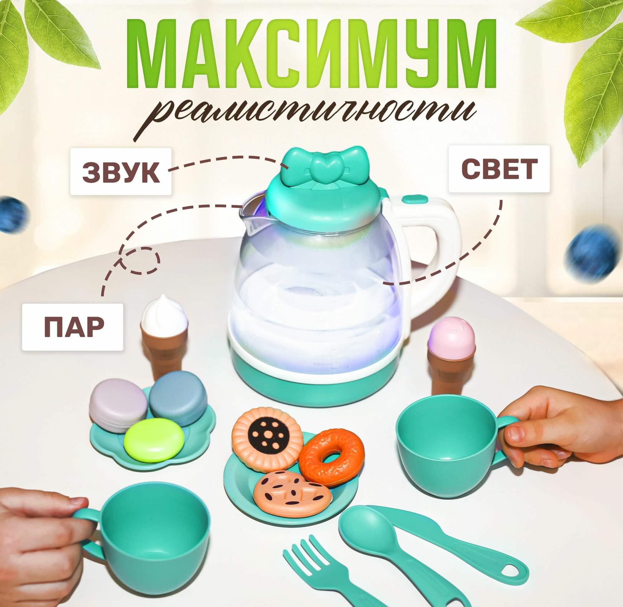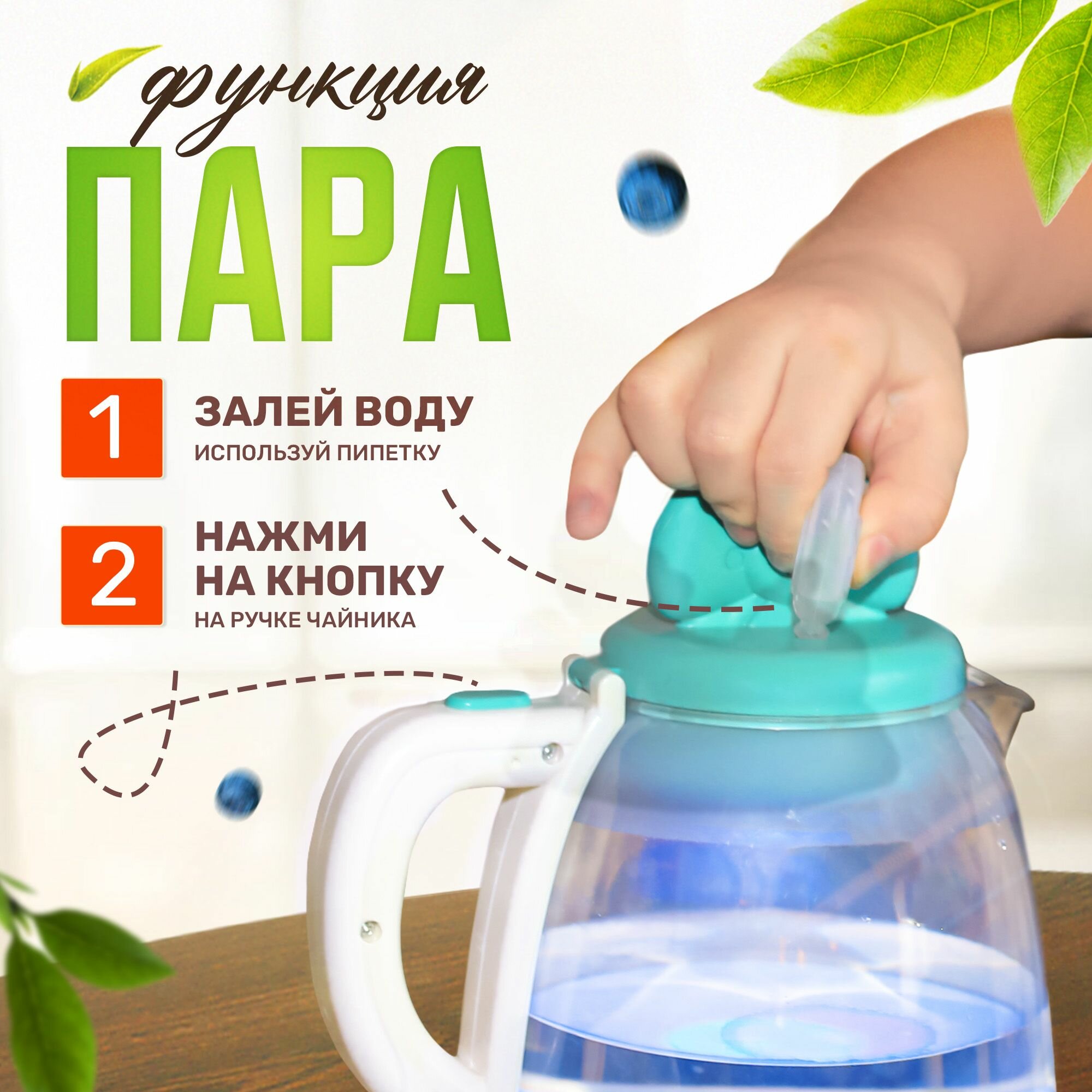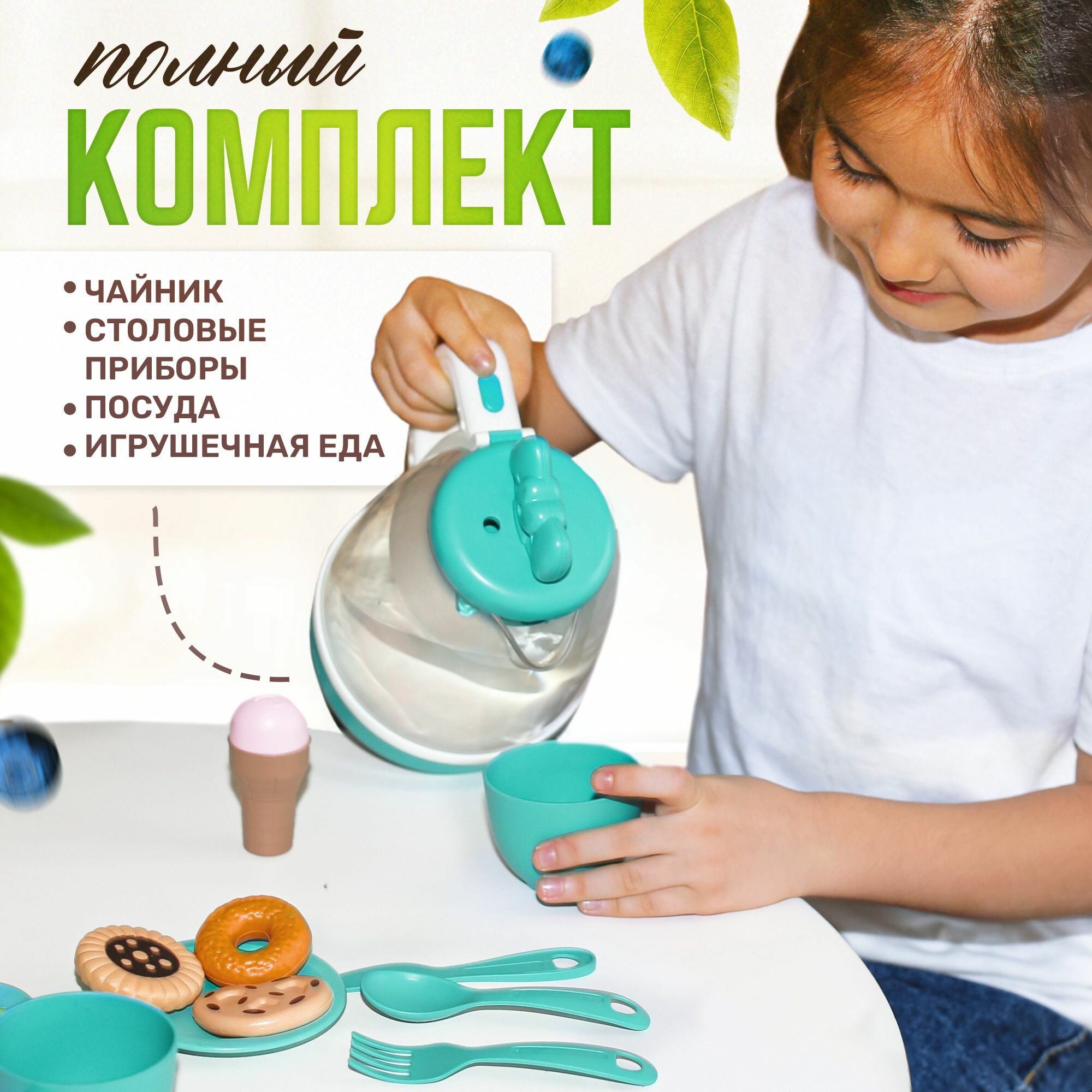 Игровой набор детской посуды, игрушечный чайник с паром, сервизом и продуктами интересное: