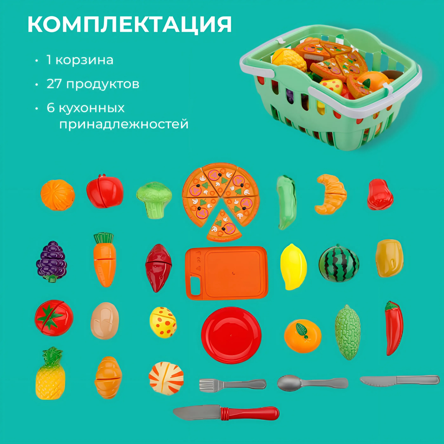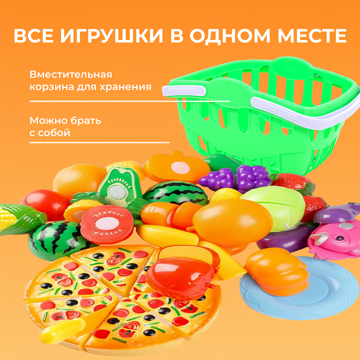 Купить Игрушечная еда фрукты овощи на липучках TrendToys, Набор игрушечные продукты в корзинке 33 предмета
