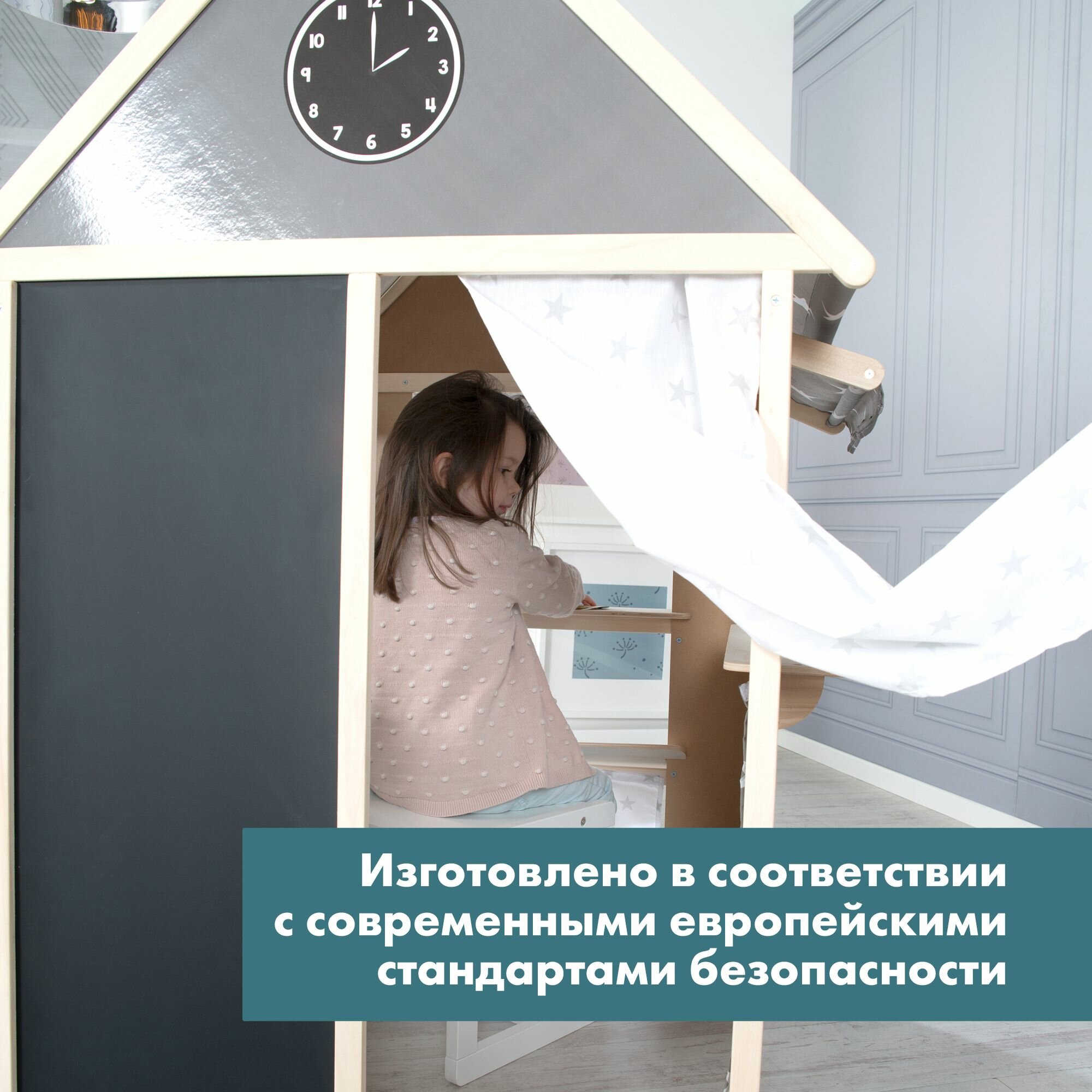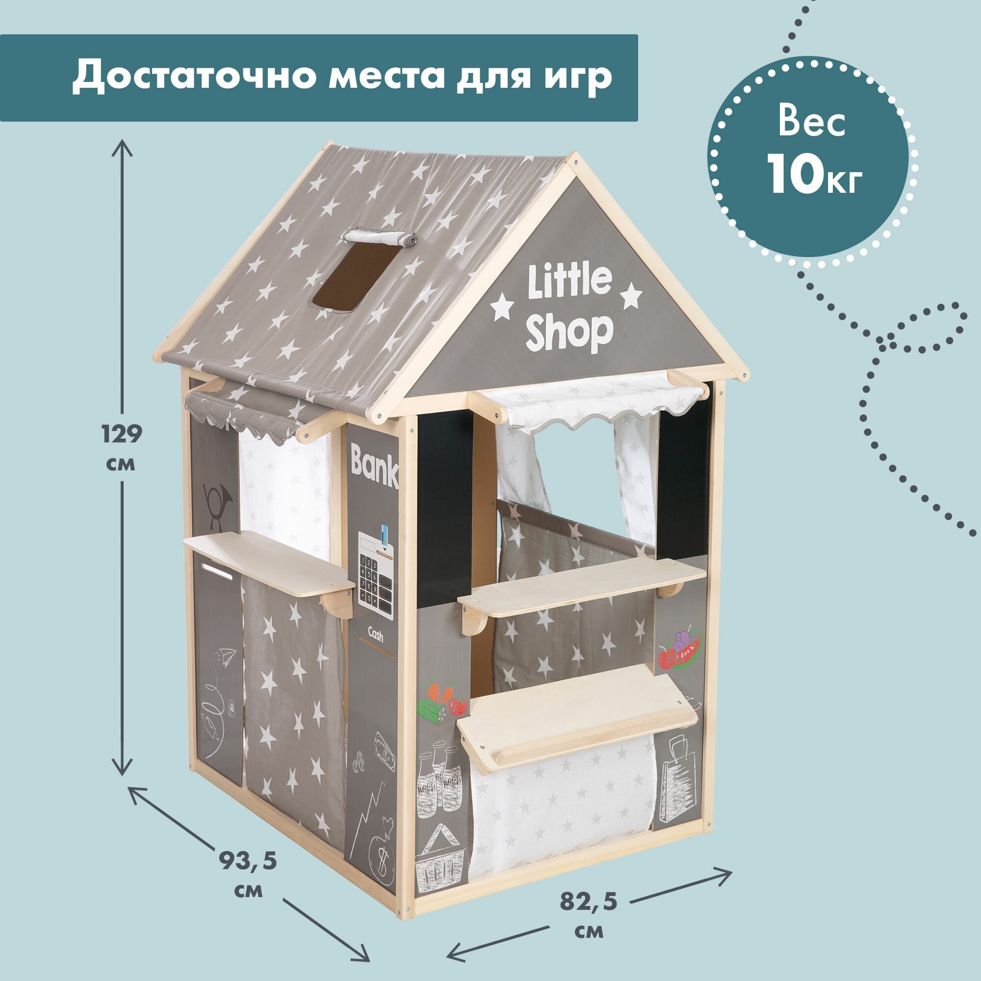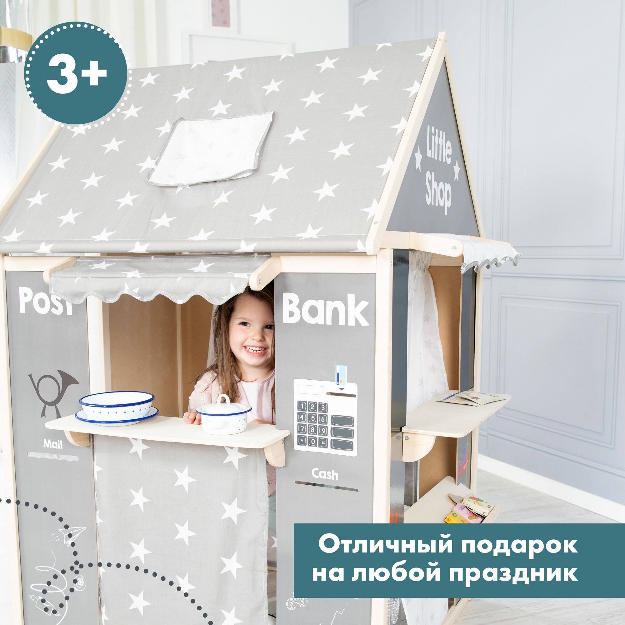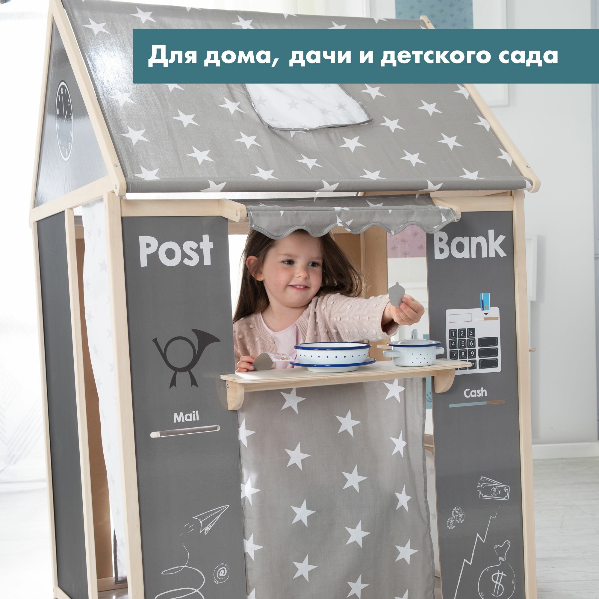 Домик для детей игровой Roba (4 в 1: кукольный театр, магазин, почта, банк), деревянный, серый/звезды интересное: