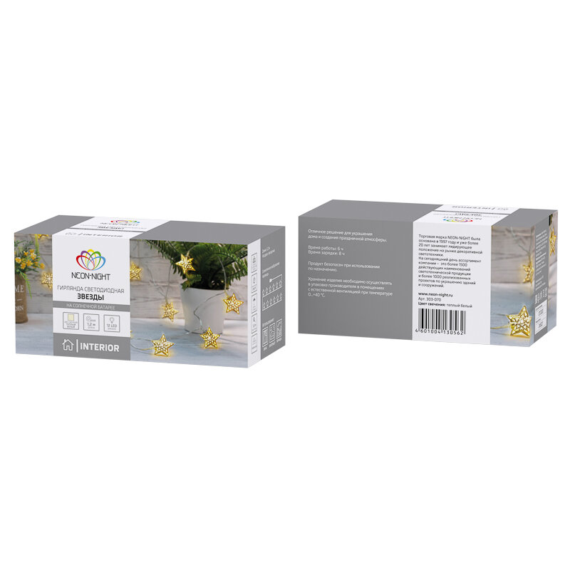 NEON-NIGHT Гирлянда светодиодная на солнечной батарее "Звезды" 12 LED теплый белый 1,2 метра