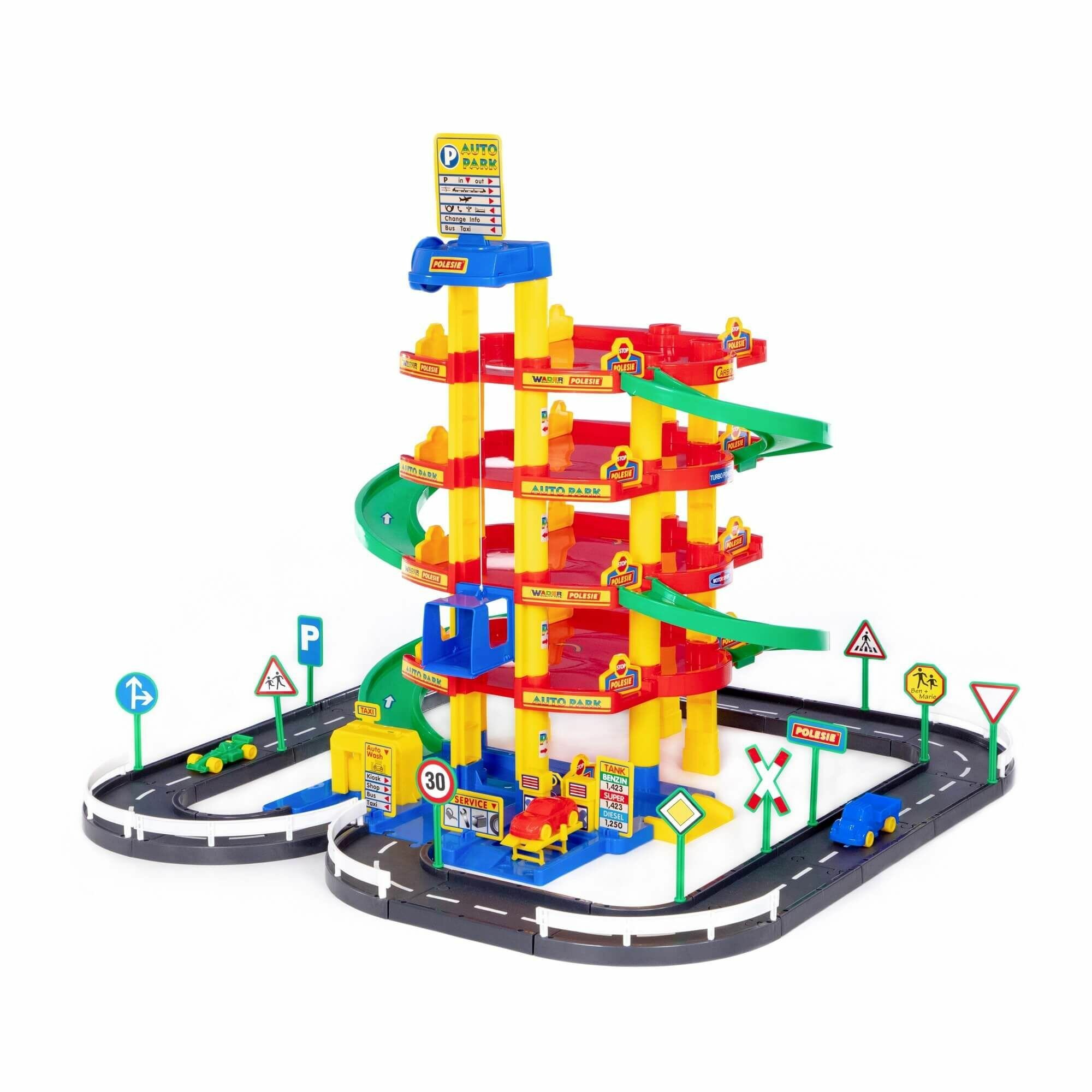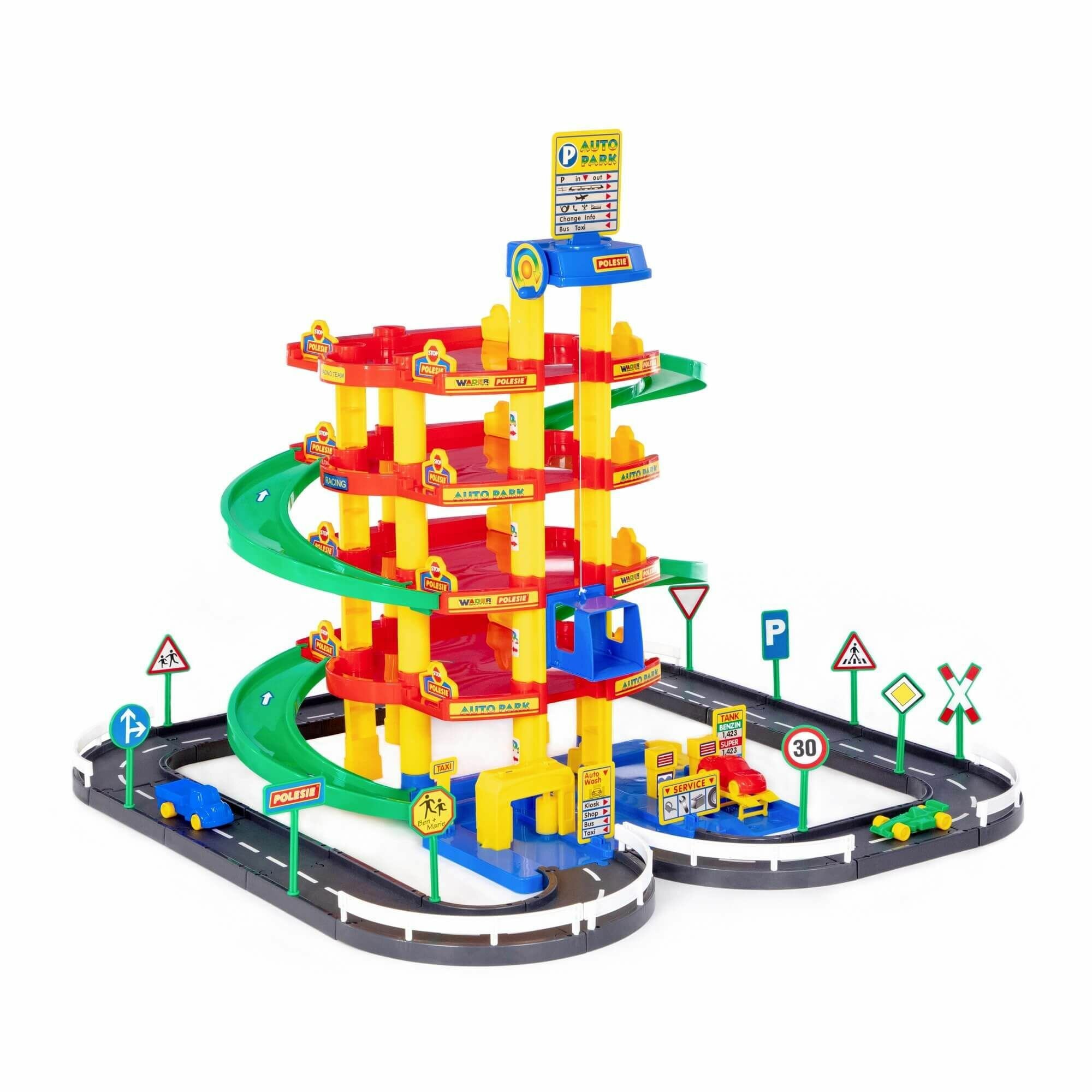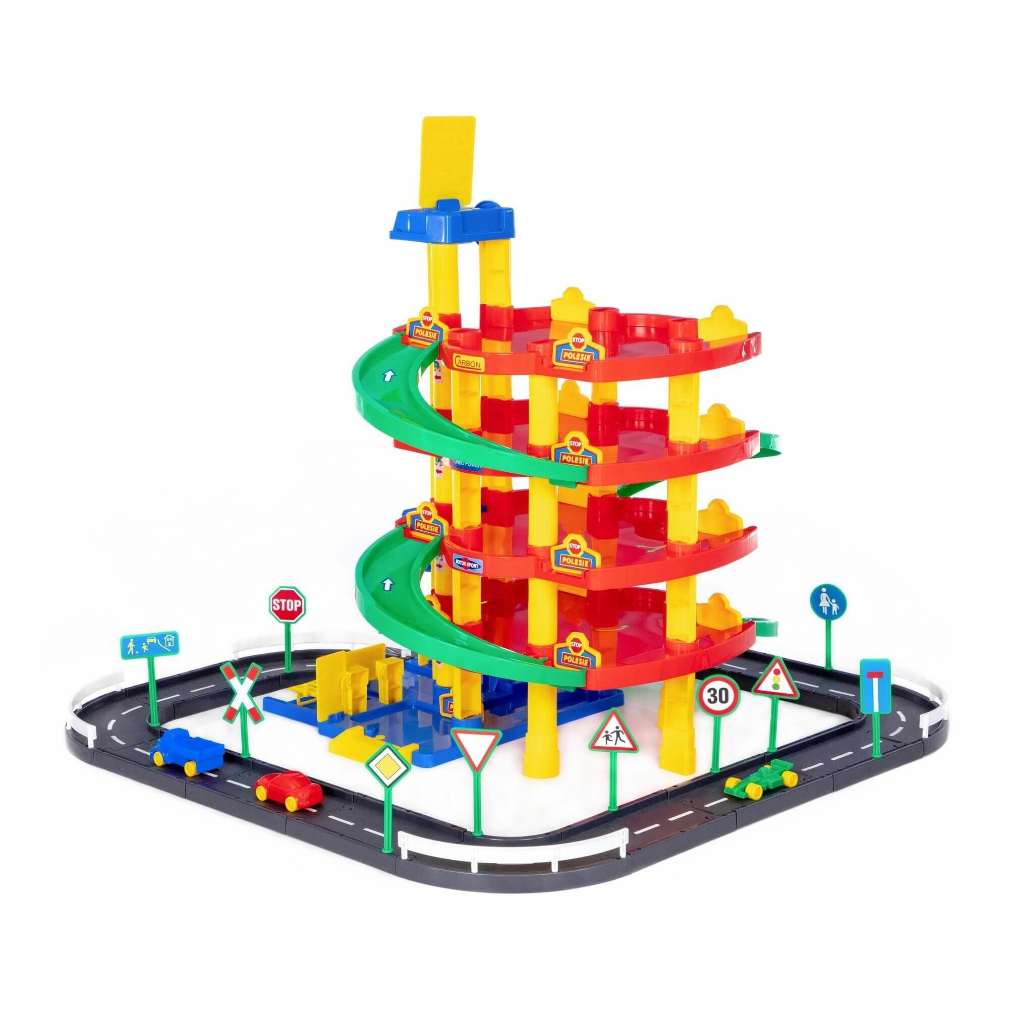 Паркинг 5-уровневый с дорогой автомойка игрушечная автотрек "Полесье" интересное: