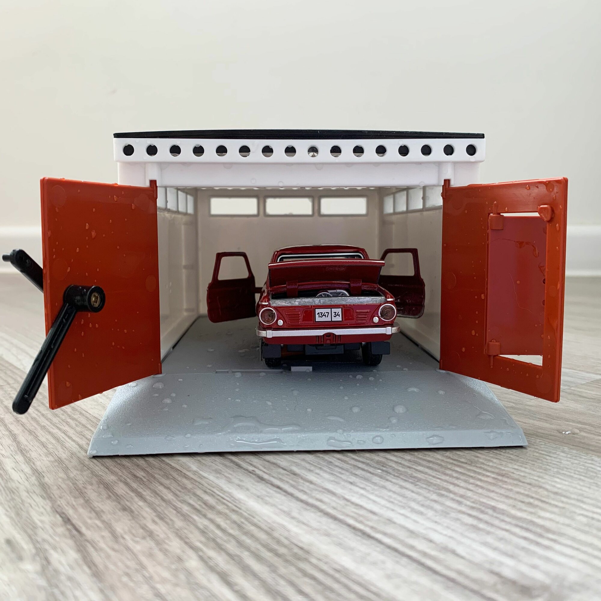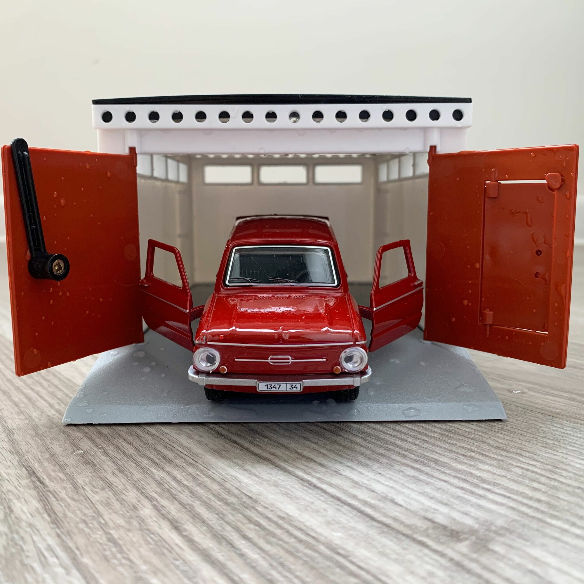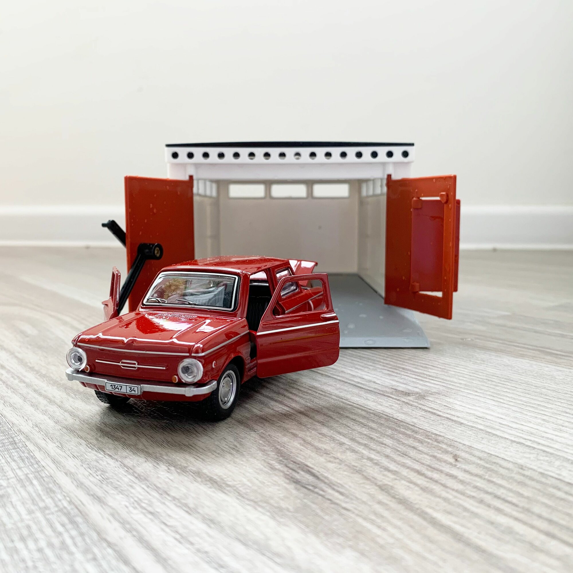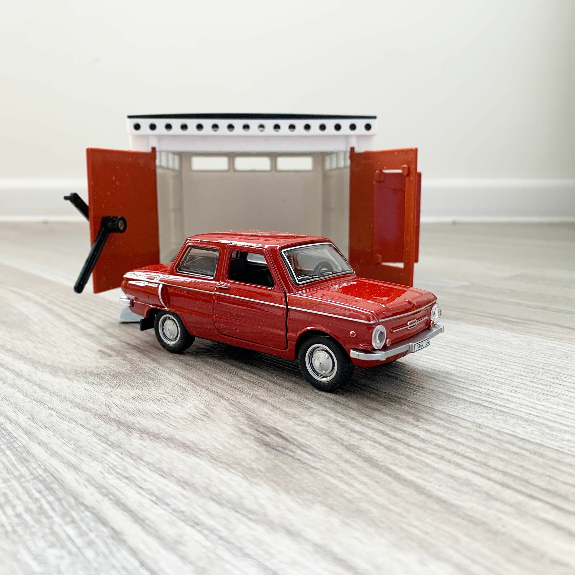 Гараж + машинка модель Запорожец ЗАЗ-968А (12 см, метал, инерция, открытие 2-х дверей, багажника) - белый