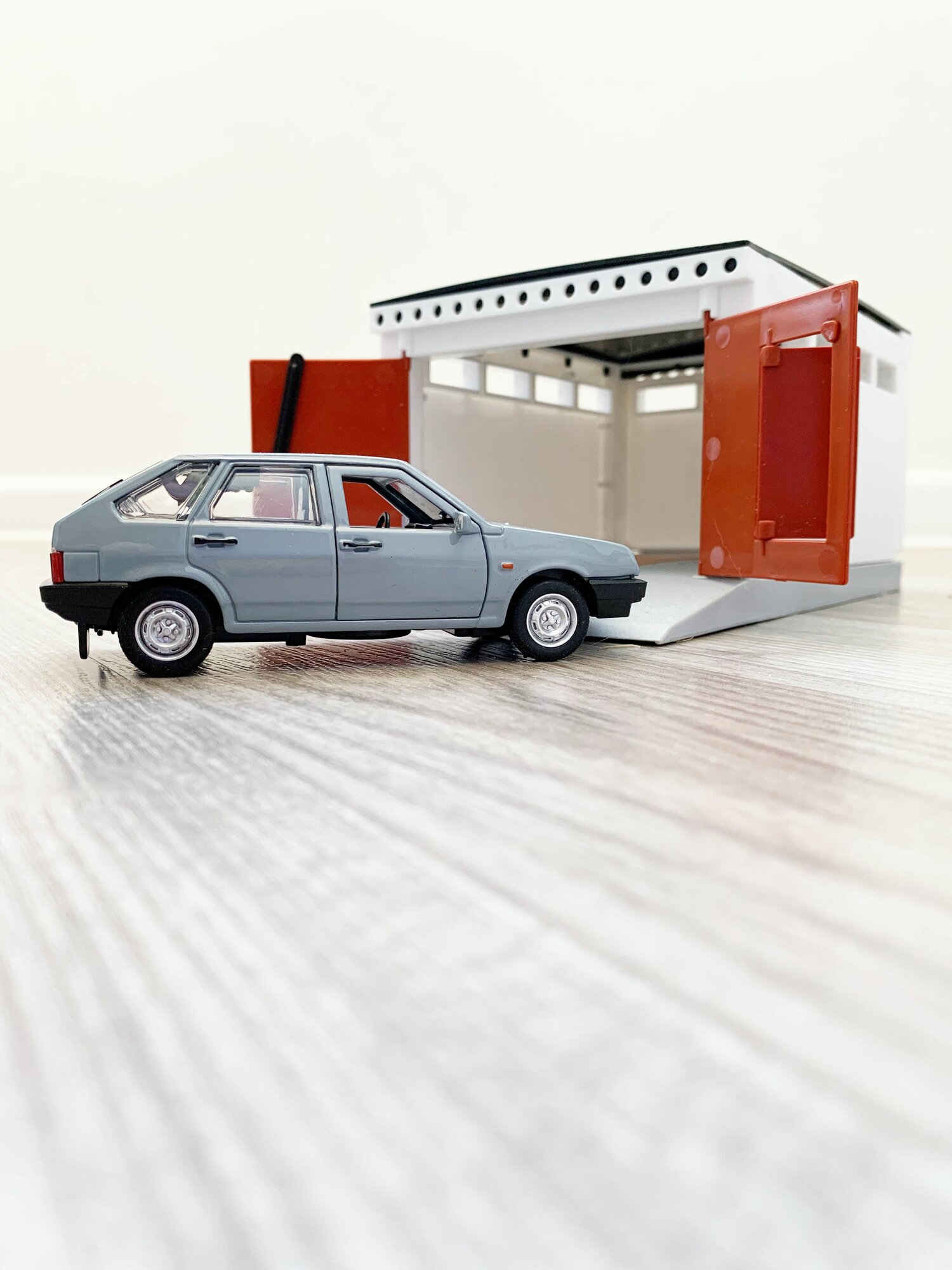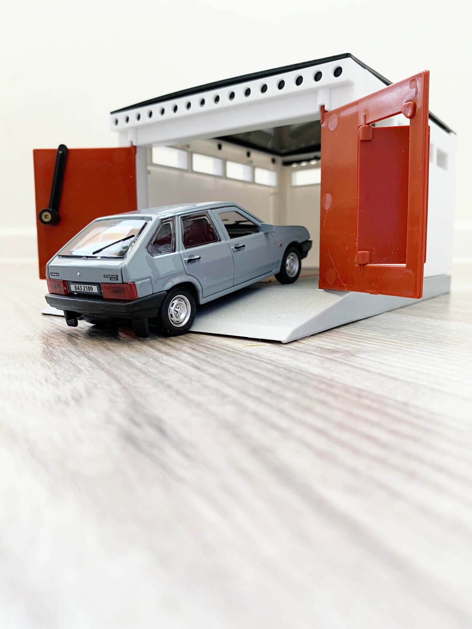 Гараж + машинка модель ВАЗ 2109 (12 см, метал, инерция, открытие 2-х дверей, багажника) - белый