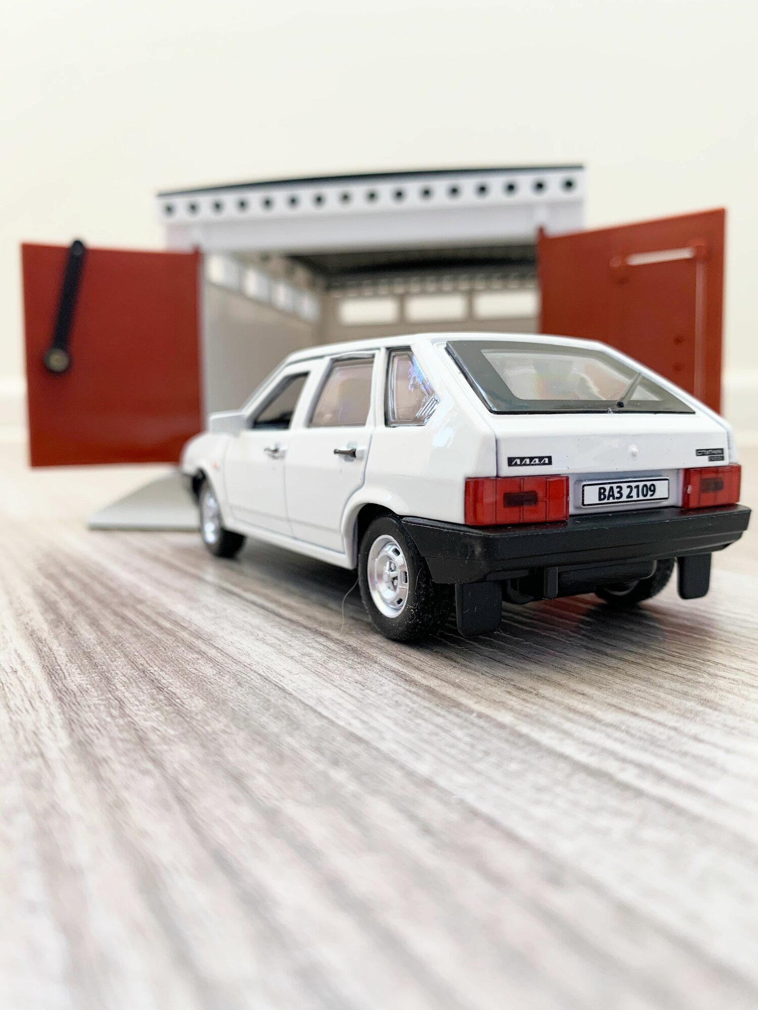 Гараж + машинка модель ВАЗ 2109 (12 см, метал, инерция, открытие 2-х дверей, багажника) - алый