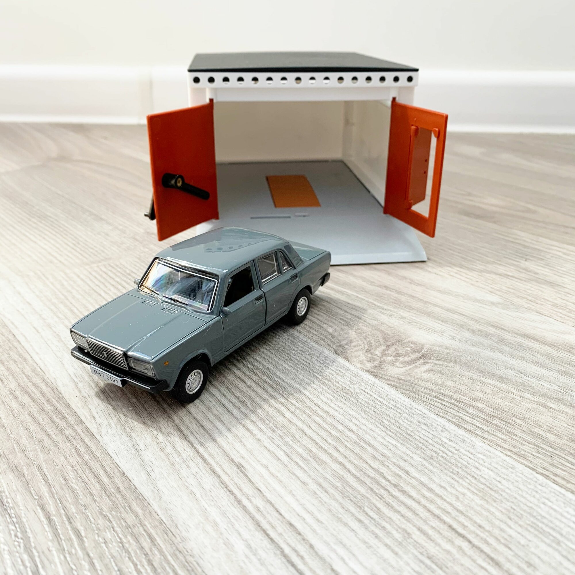 Купить Гараж с распашными воротами и металлическая машинка 12 см модель ВАЗ 2107 (инерция, 2 откр. двери и багажник) - серая