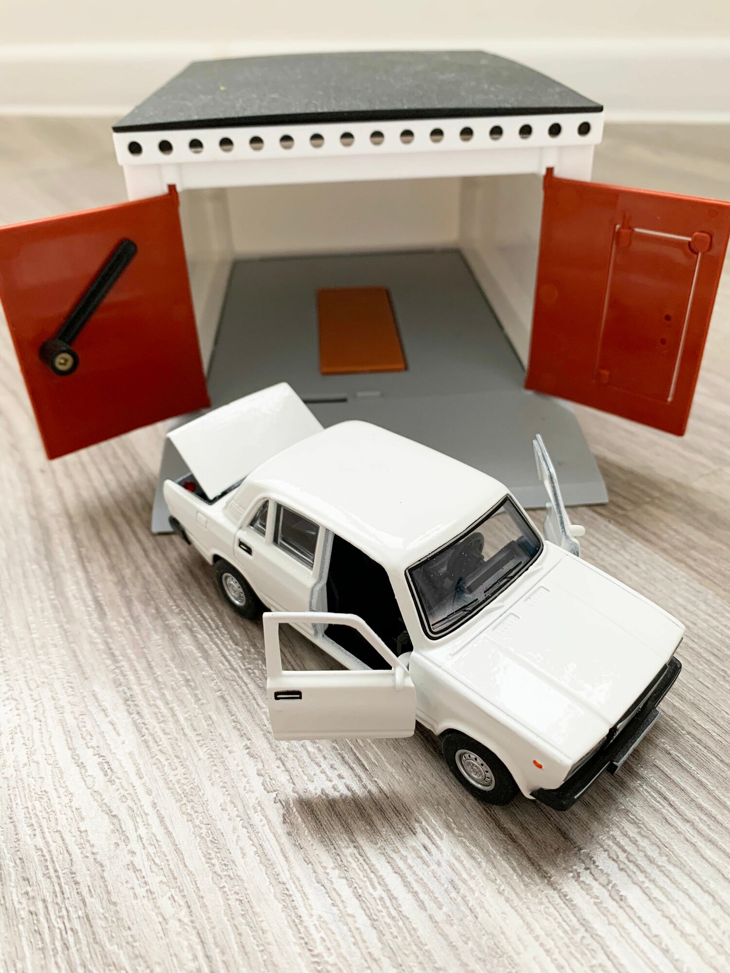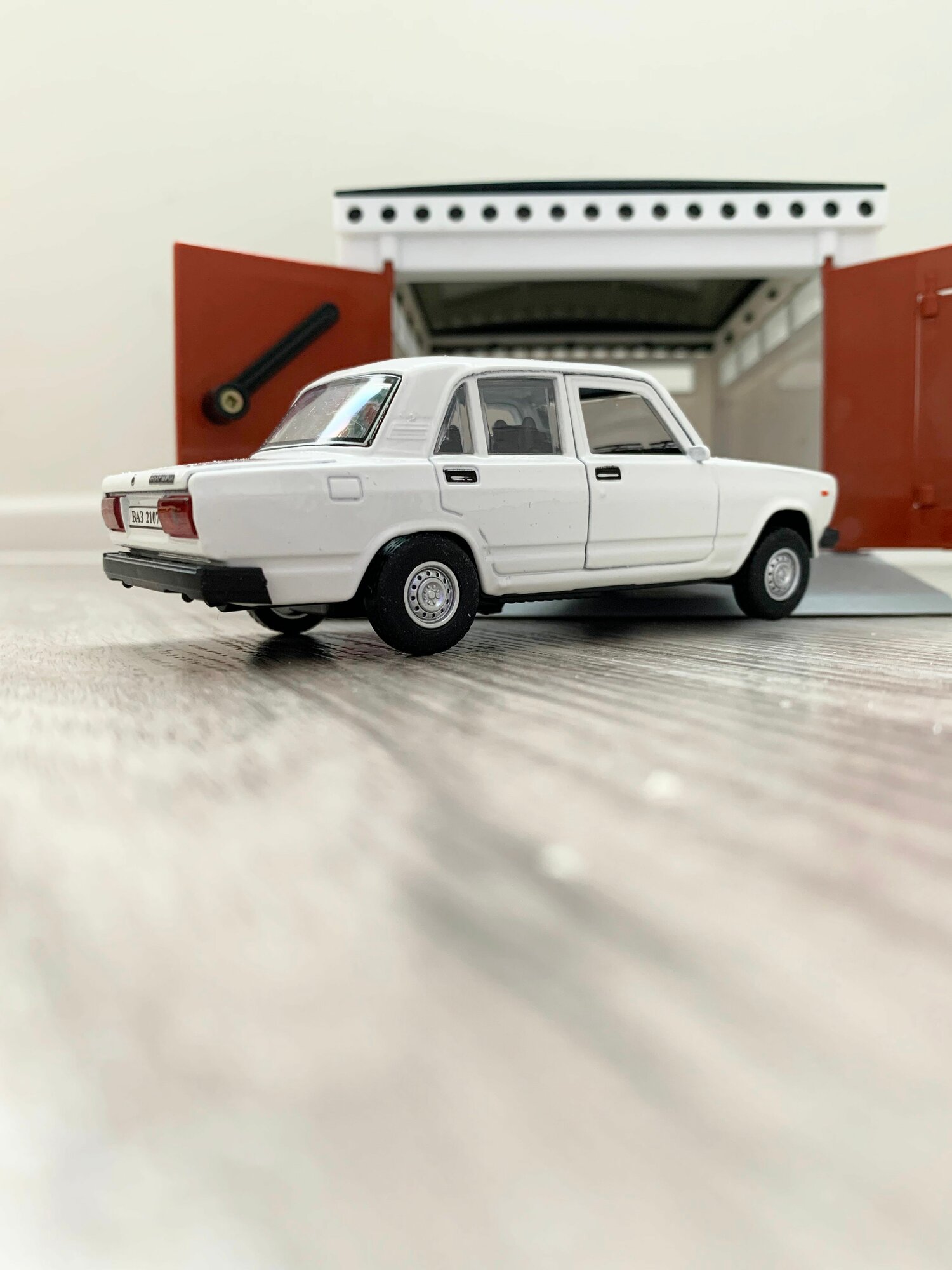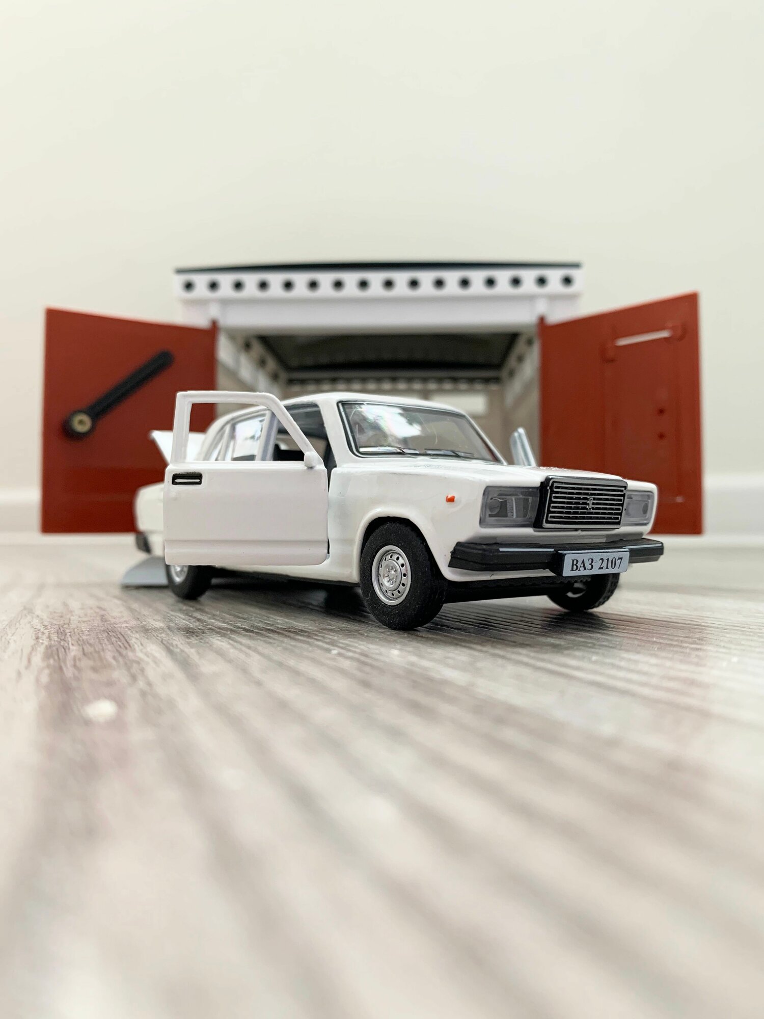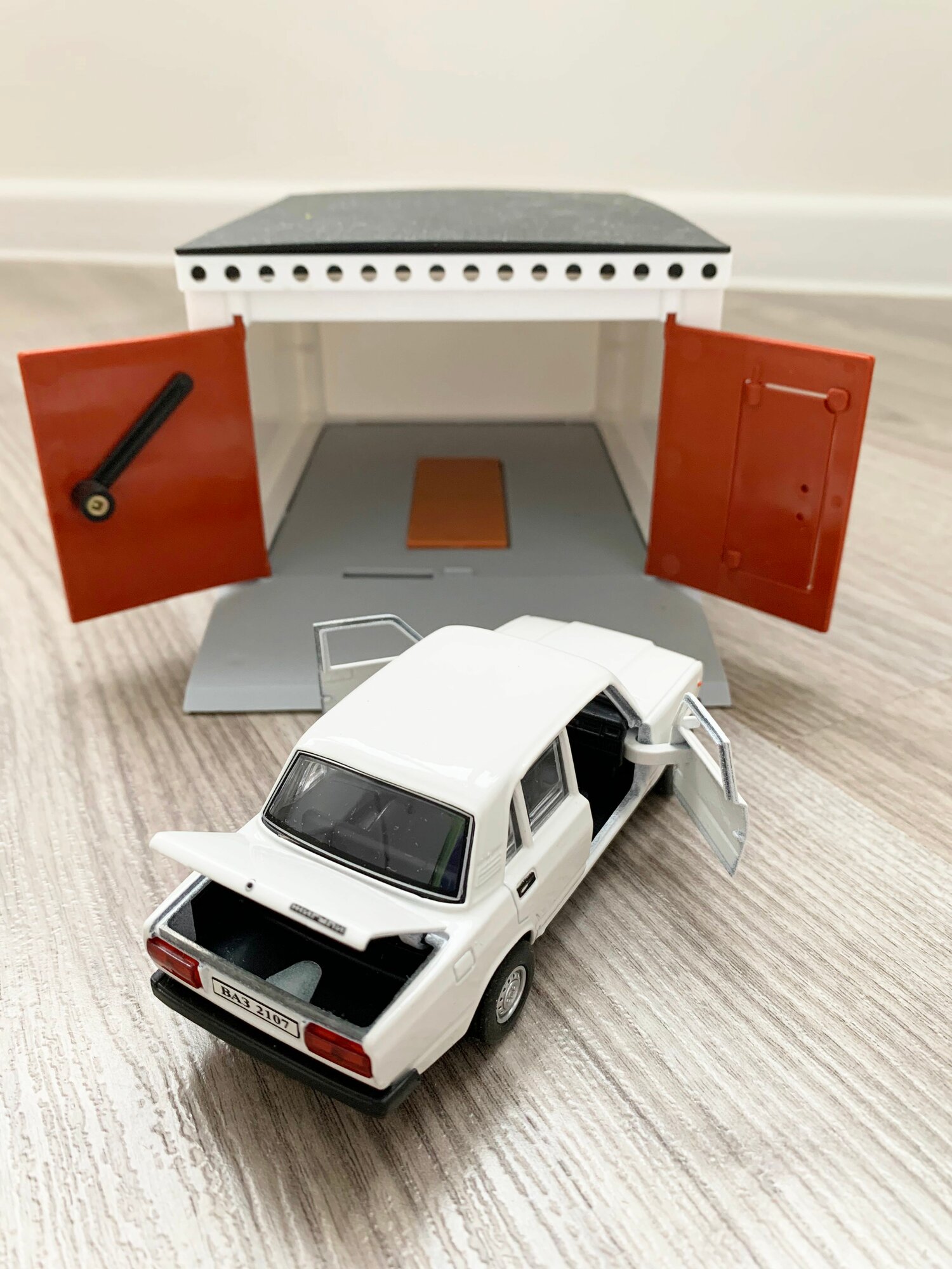 Купить Гараж + машинка модель ВАЗ 2107 (12 см, метал, инерция, 2 откр. двери и багажник) - белая