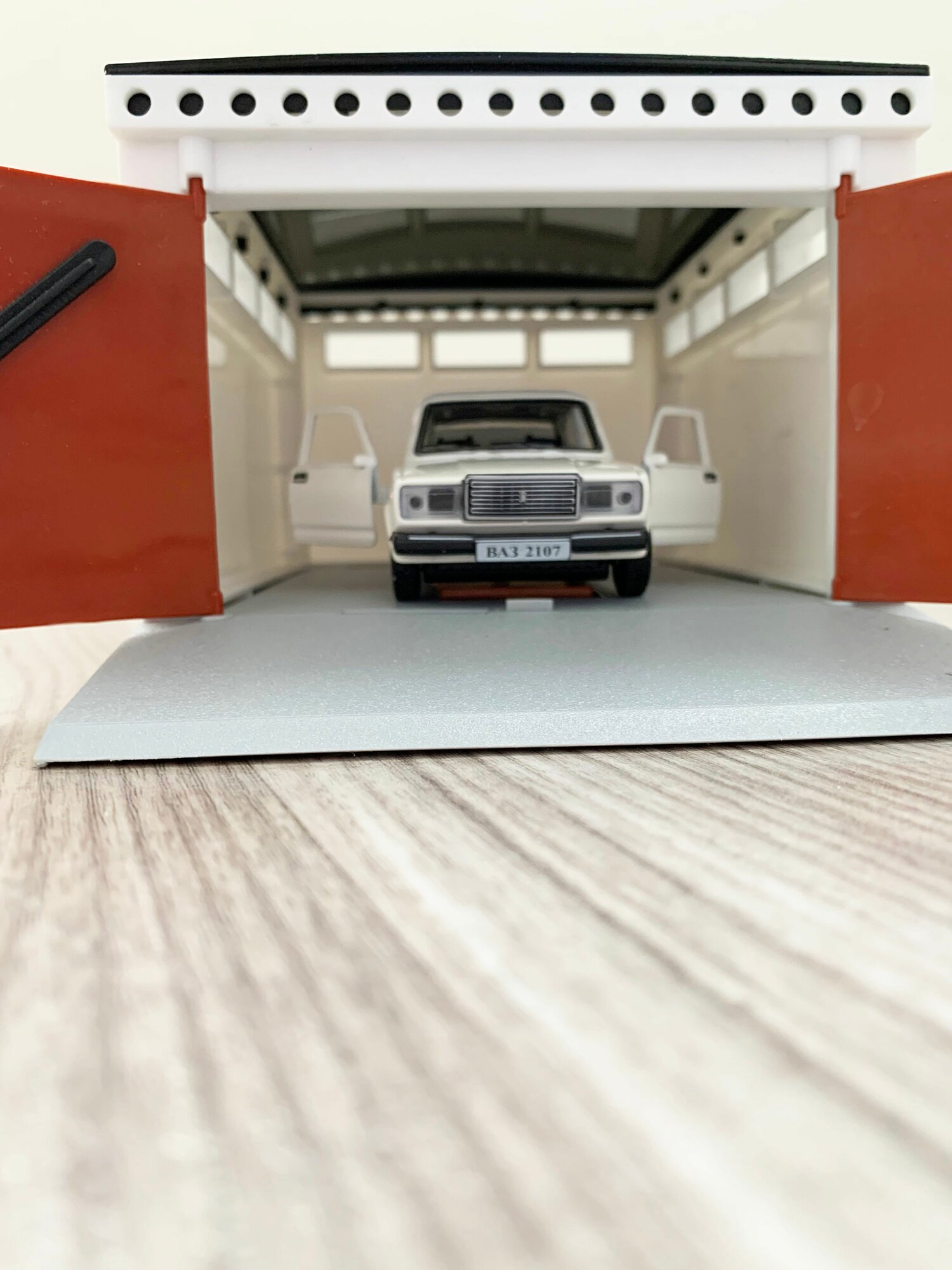 Гараж с распашными воротами и металлическая машинка 12 см модель ВАЗ 2107 (инерция, 2 откр. двери и багажник) - серая