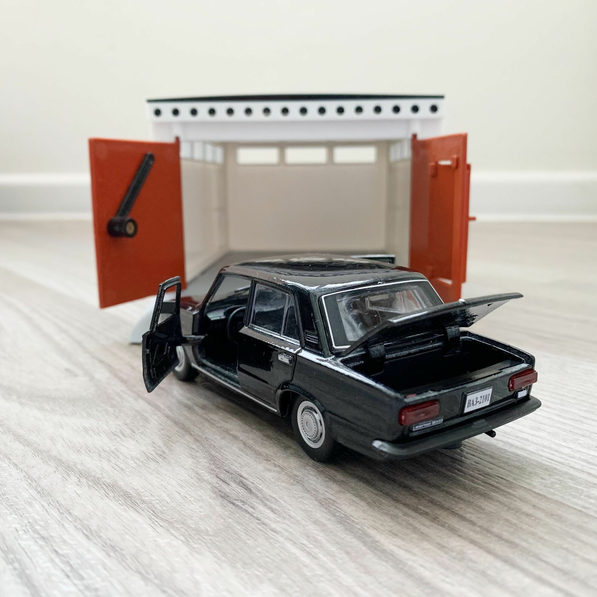 Гараж ретро и машинка ВАЗ 2115 (метал, 12 см, инерция, открытие 2-х дверей и багажника) - синяя