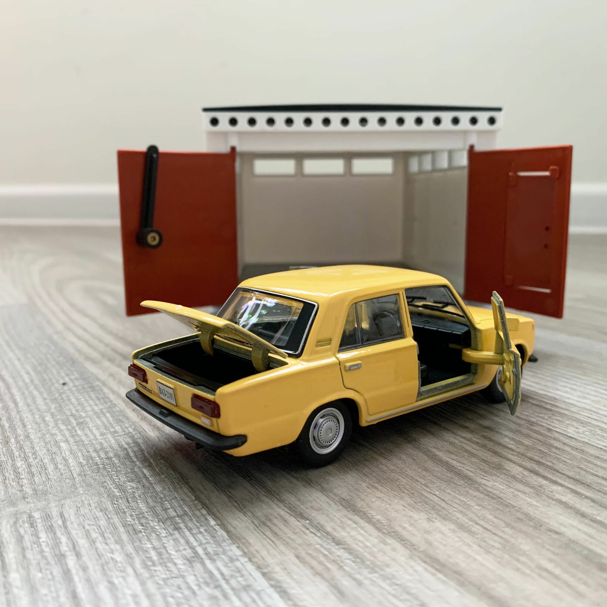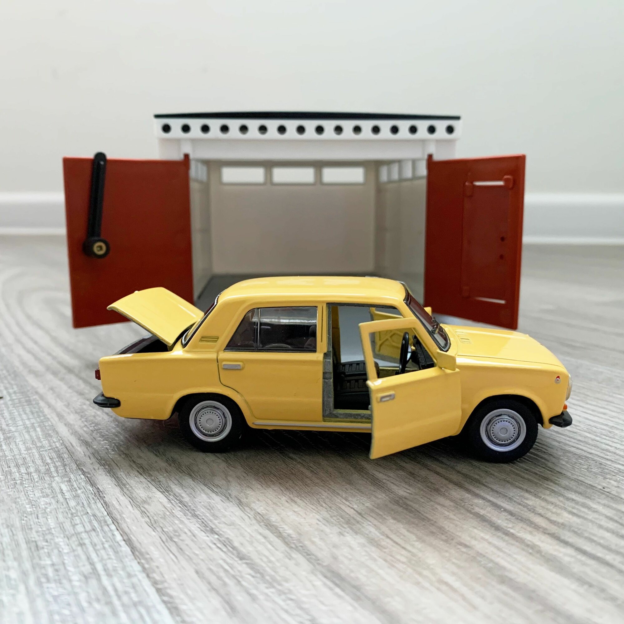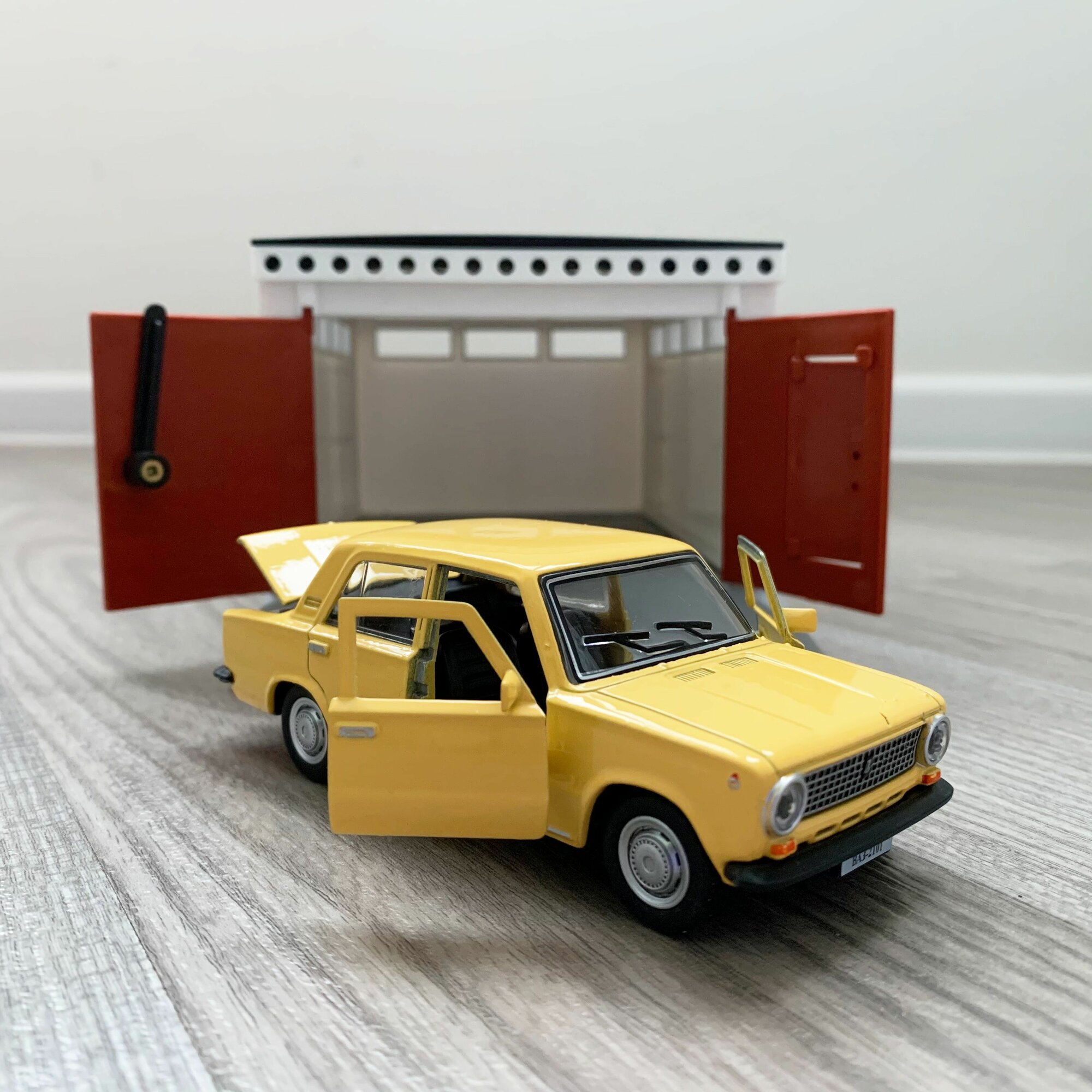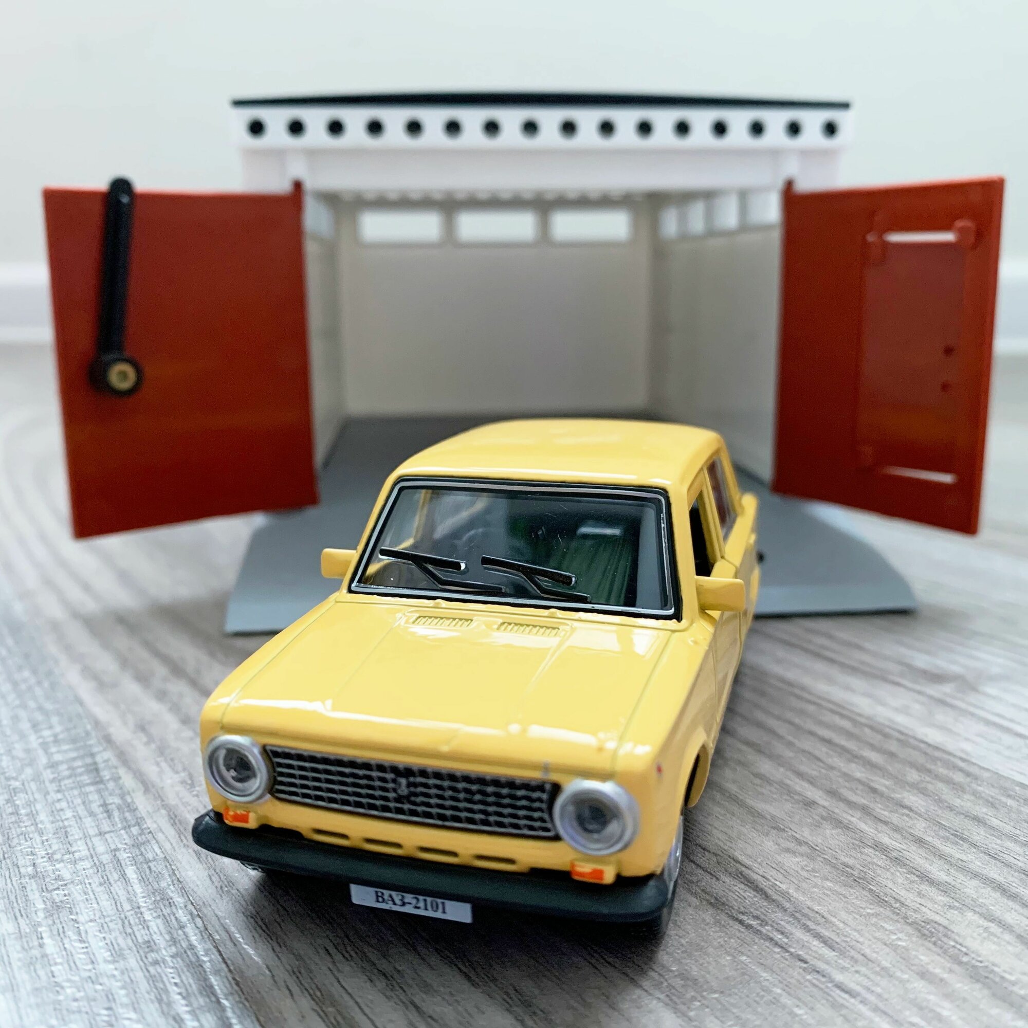 Купить Гараж + машинка модель ВАЗ 2101 (метал, 12 см, инерция, открытие 2-х дверей и багажника) -желтая