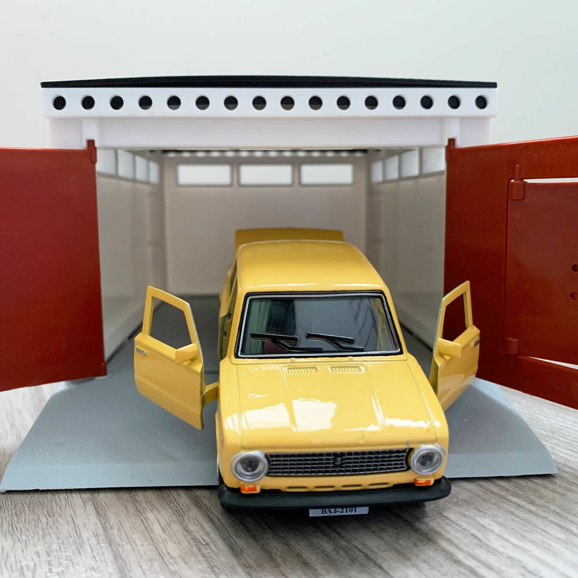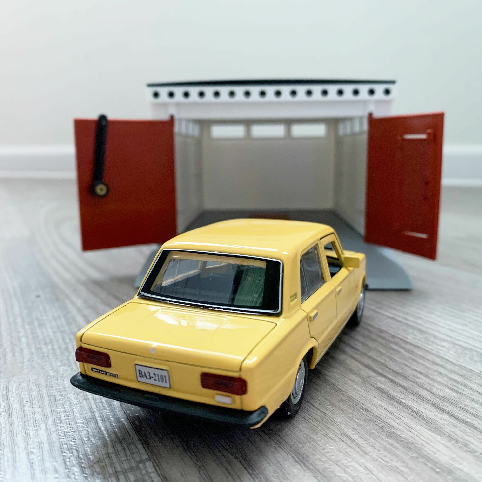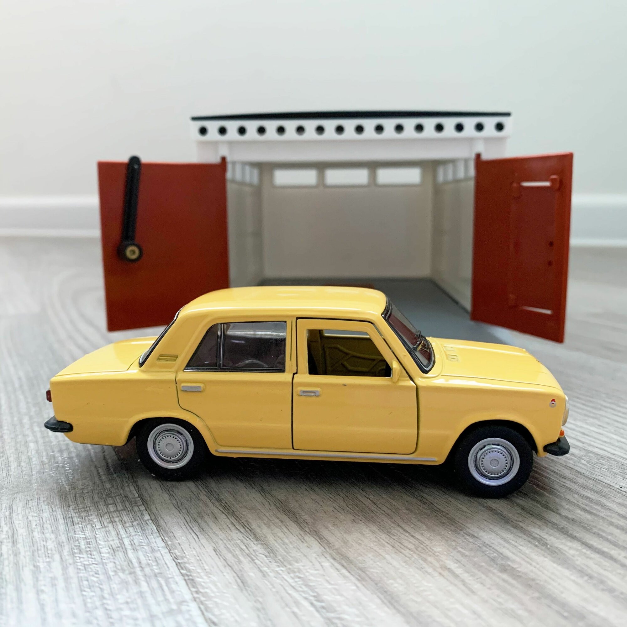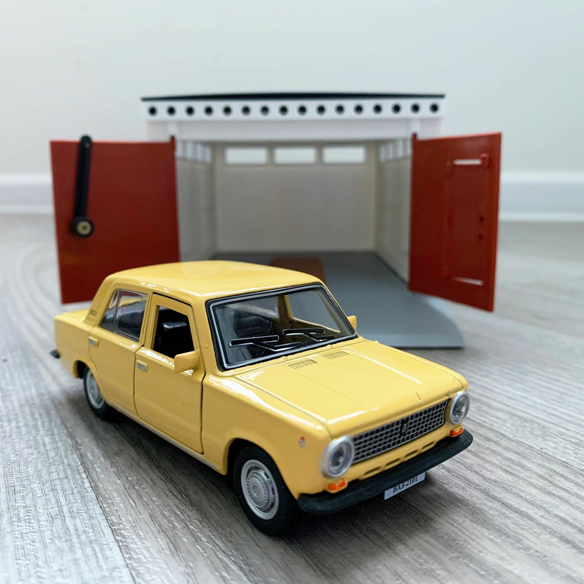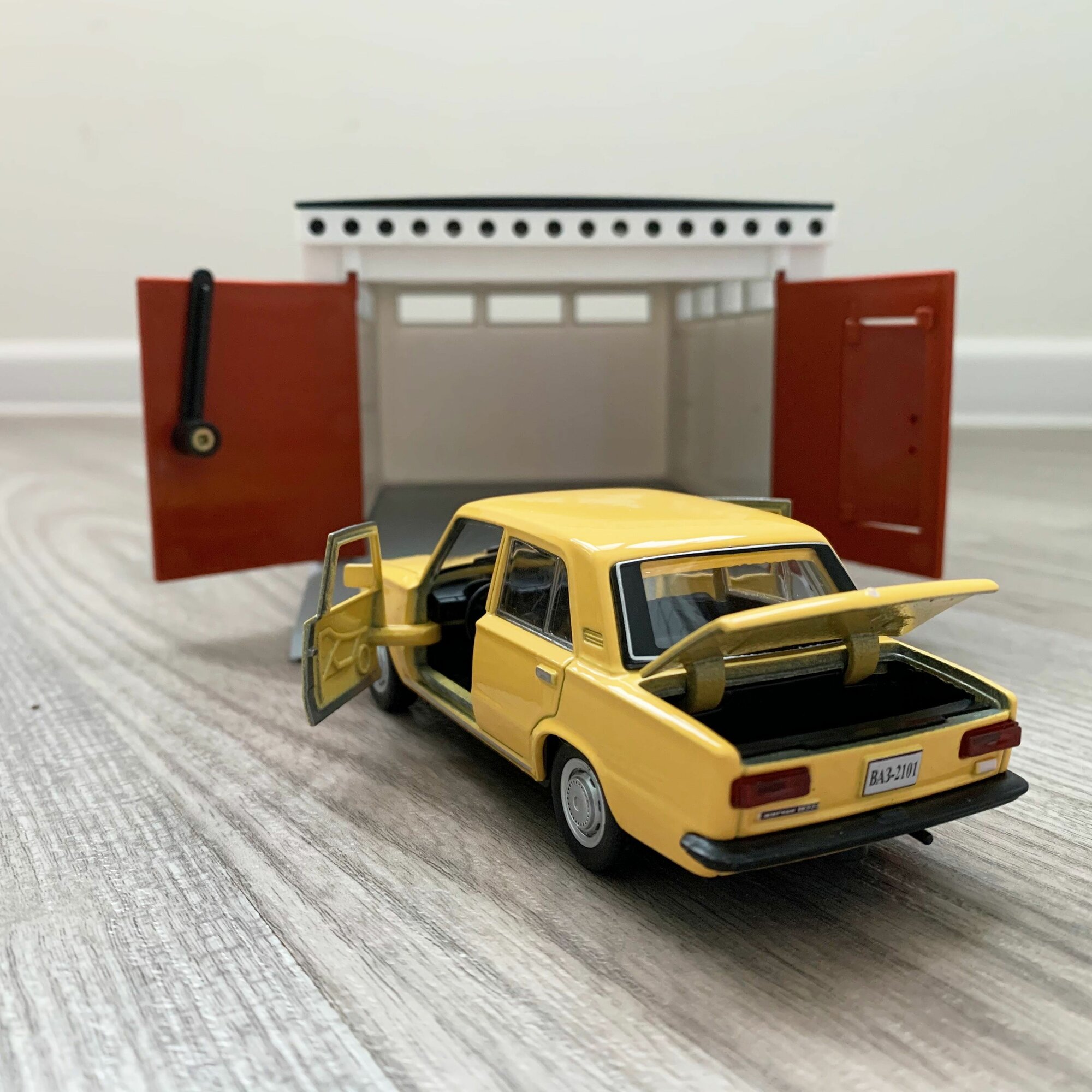 Купить Гараж + машинка модель ВАЗ 2101 (метал, 12 см, инерция, открытие 2-х дверей и багажника) -желтая