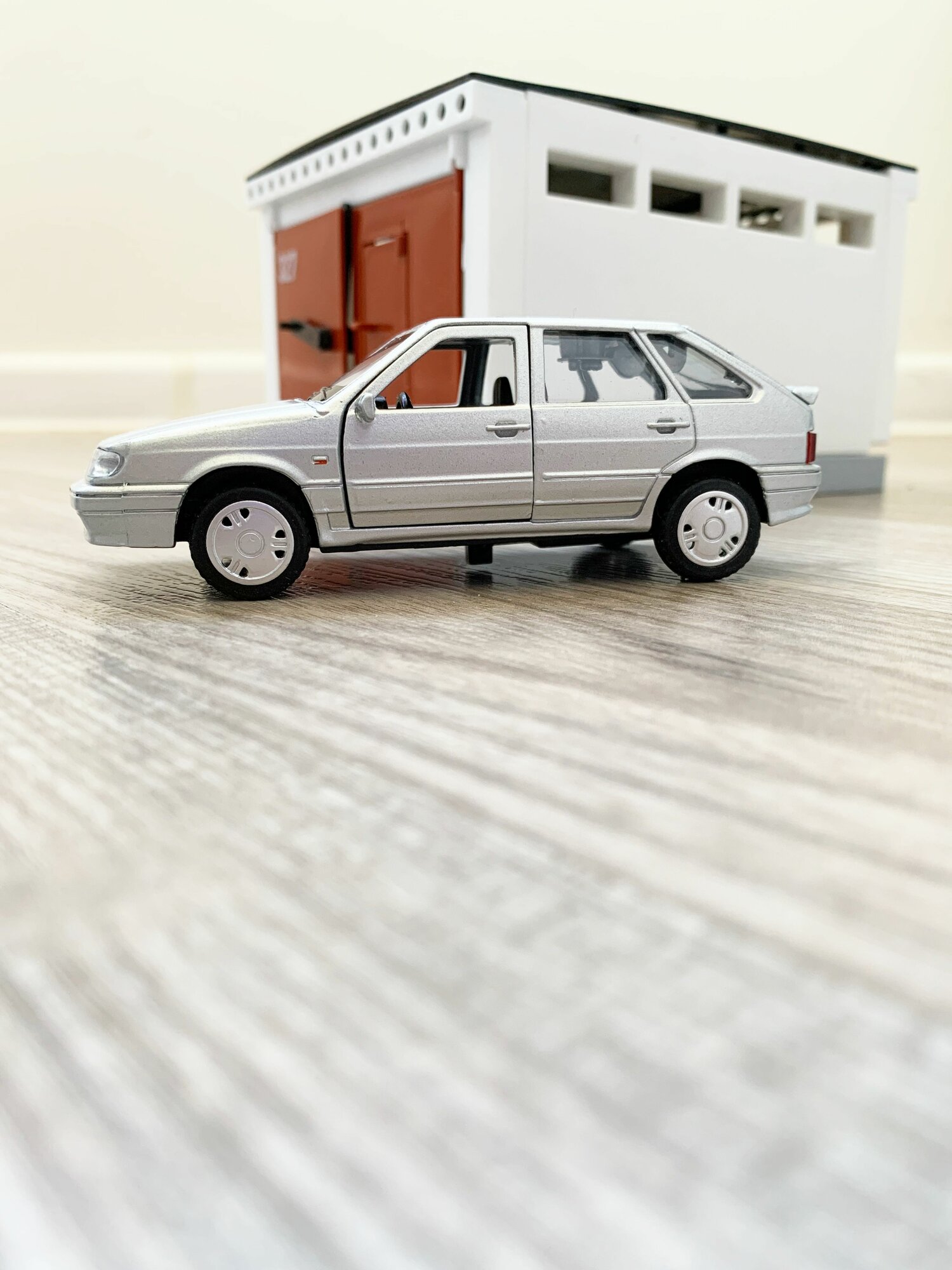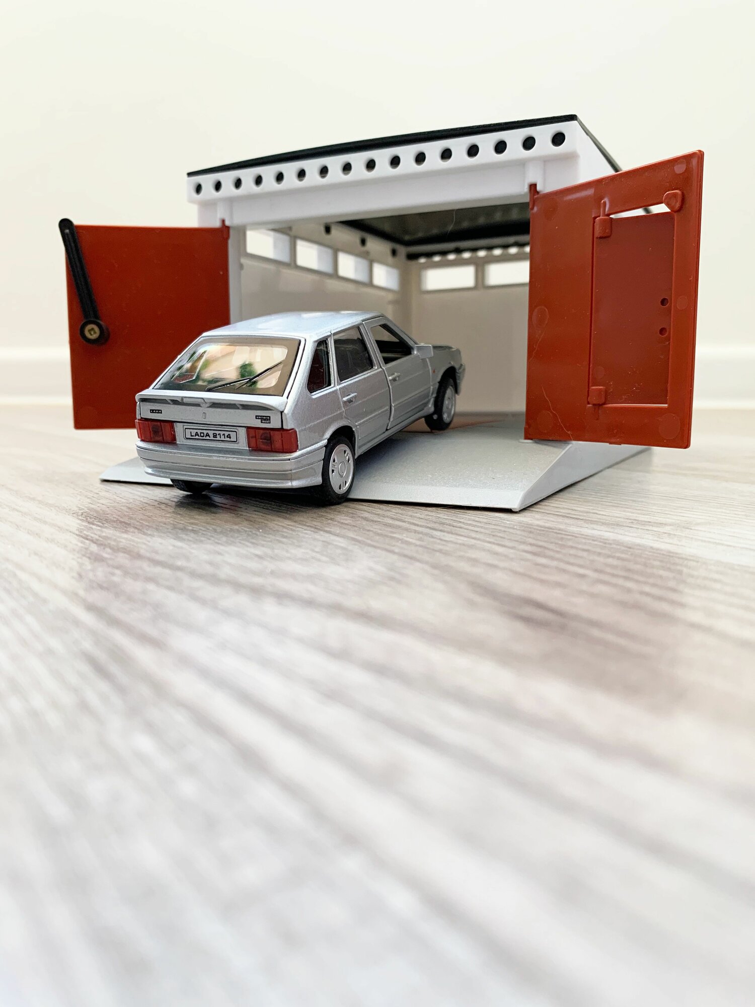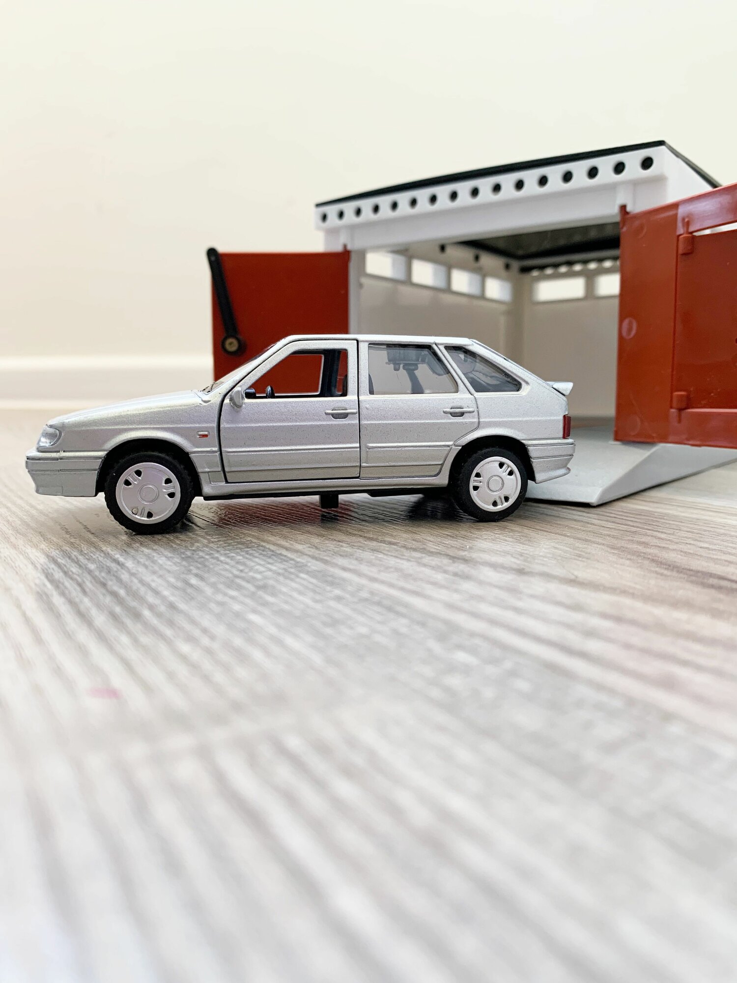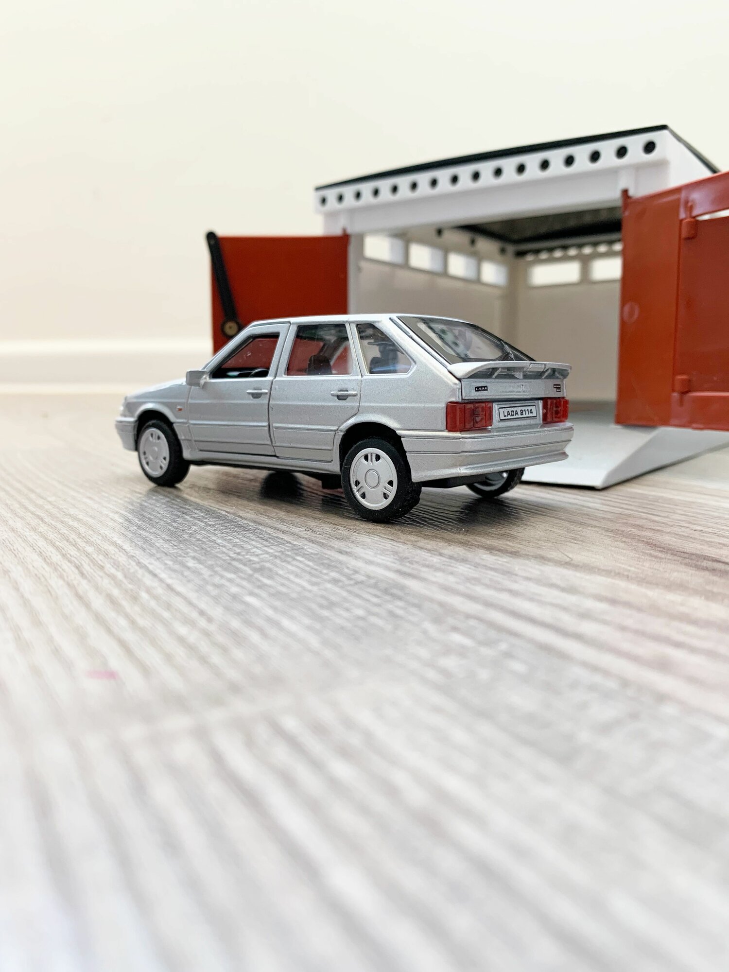 Гараж + машинка ВАЗ 2114 (металл, 12 см, инерция, открытие 2-х дверей и багажника) - серая