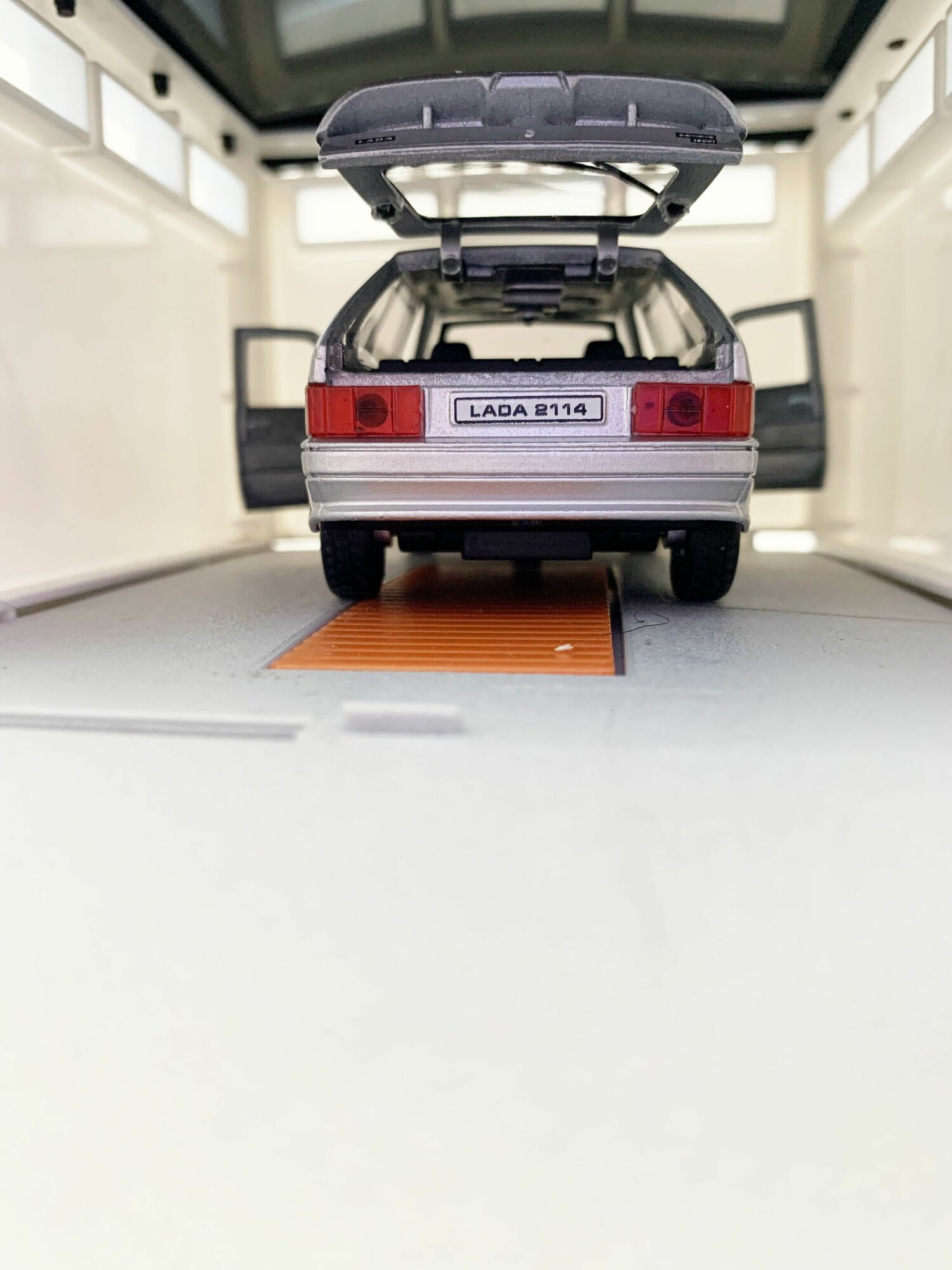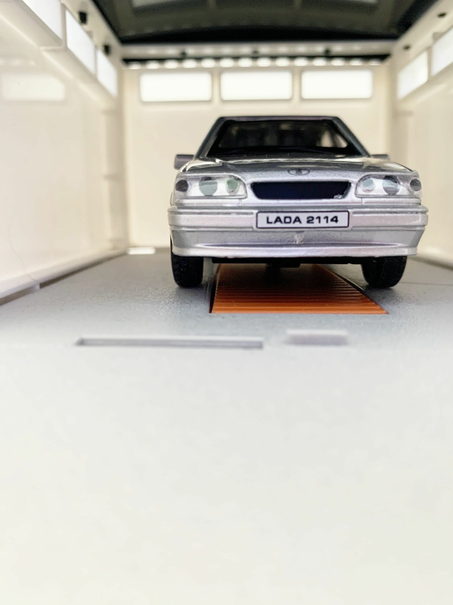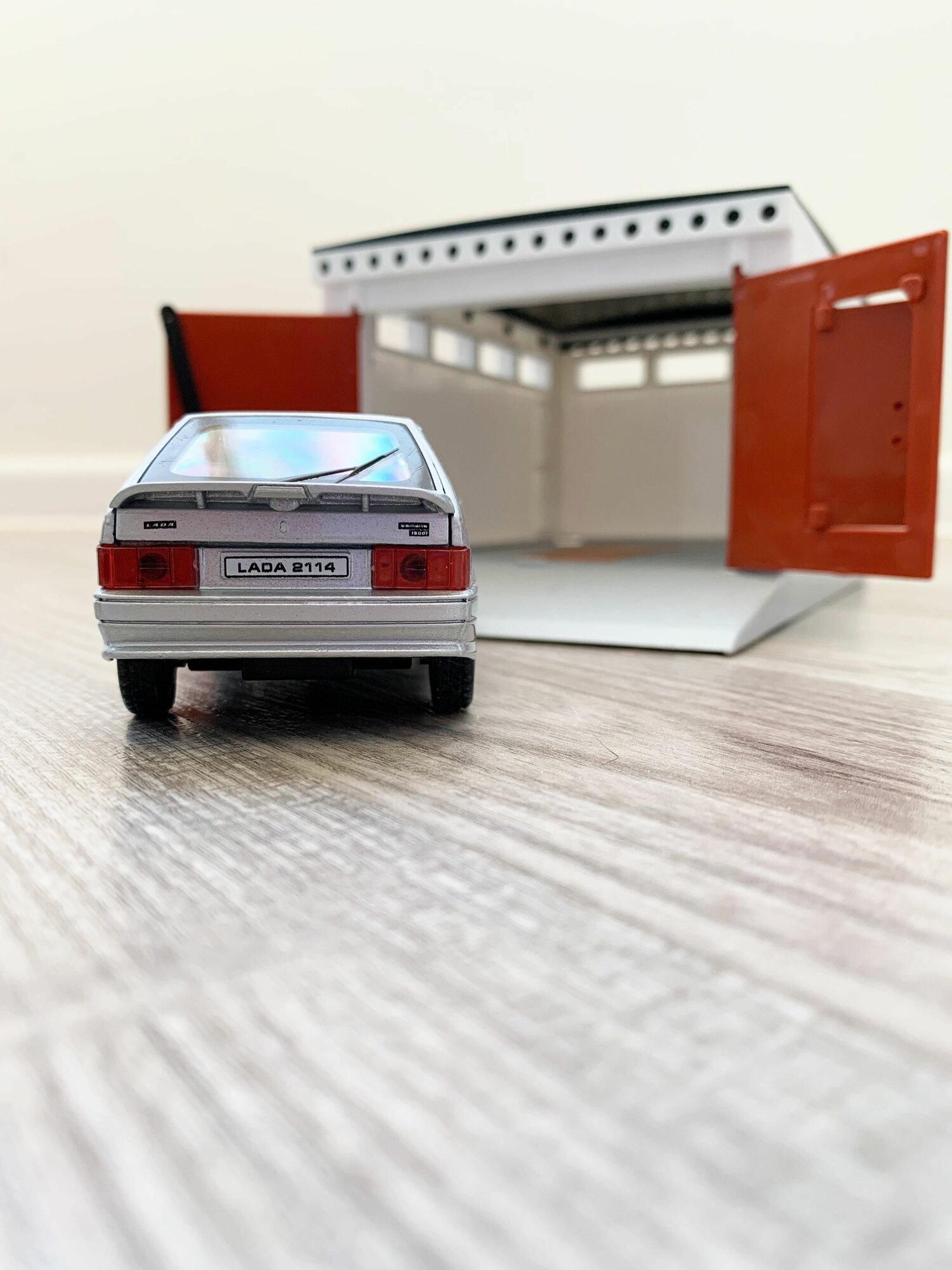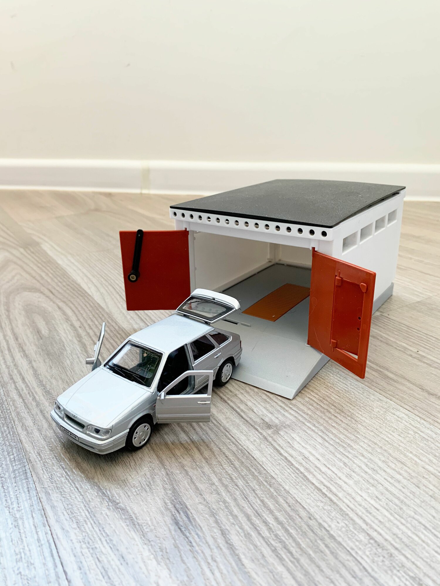 Гараж + машинка ВАЗ 2114 (металл, 12 см, инерция, открытие 2-х дверей и багажника) - серая