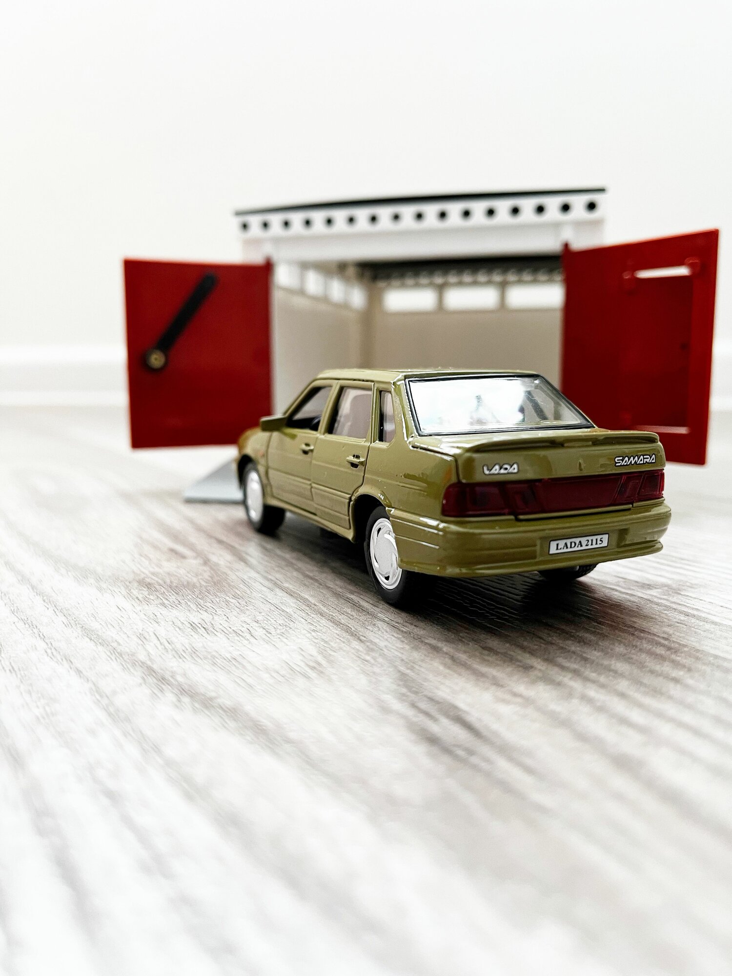 Купить Гараж + LADA 2115 (метал, 12 см, инерция, открытие 2-х дверей и багажника) - оливковый