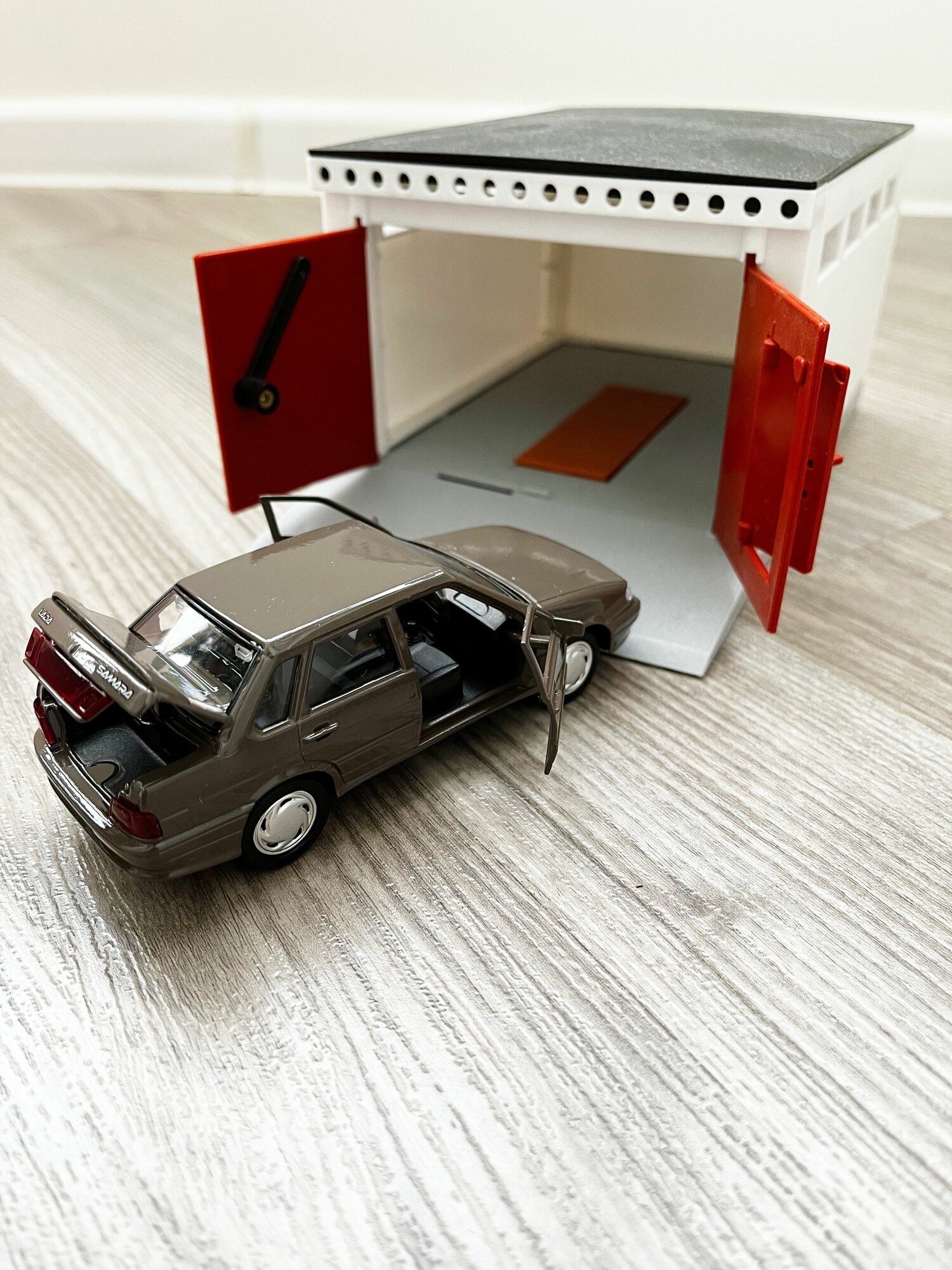 Гараж + машинка ВАЗ 2114 (металл, 12 см, инерция, открытие 2-х дверей и багажника) - серая