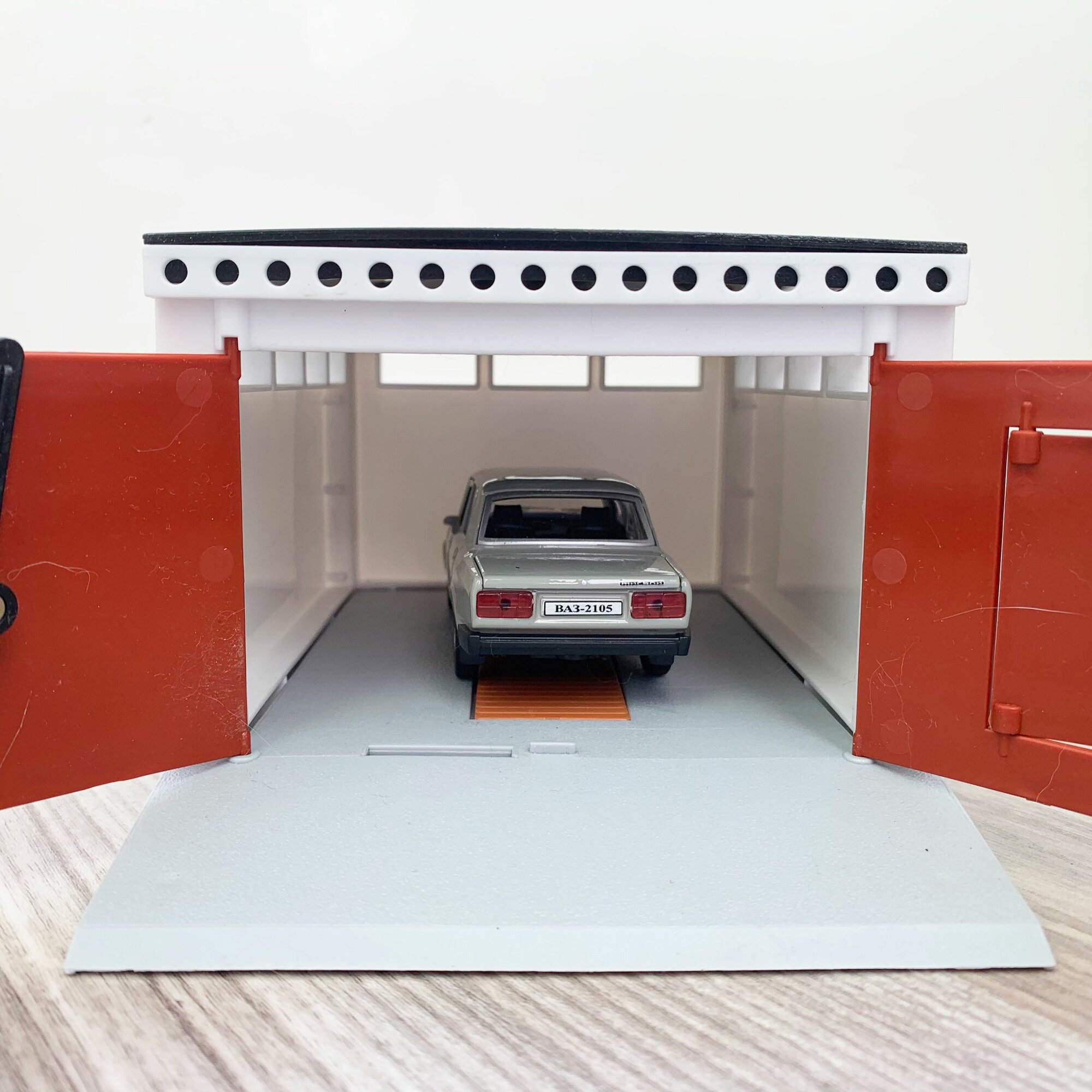 Гараж с распашными воротами и металлическая машинка 12 см модель ВАЗ 2107 (инерция, 2 откр. двери и багажник) - серая