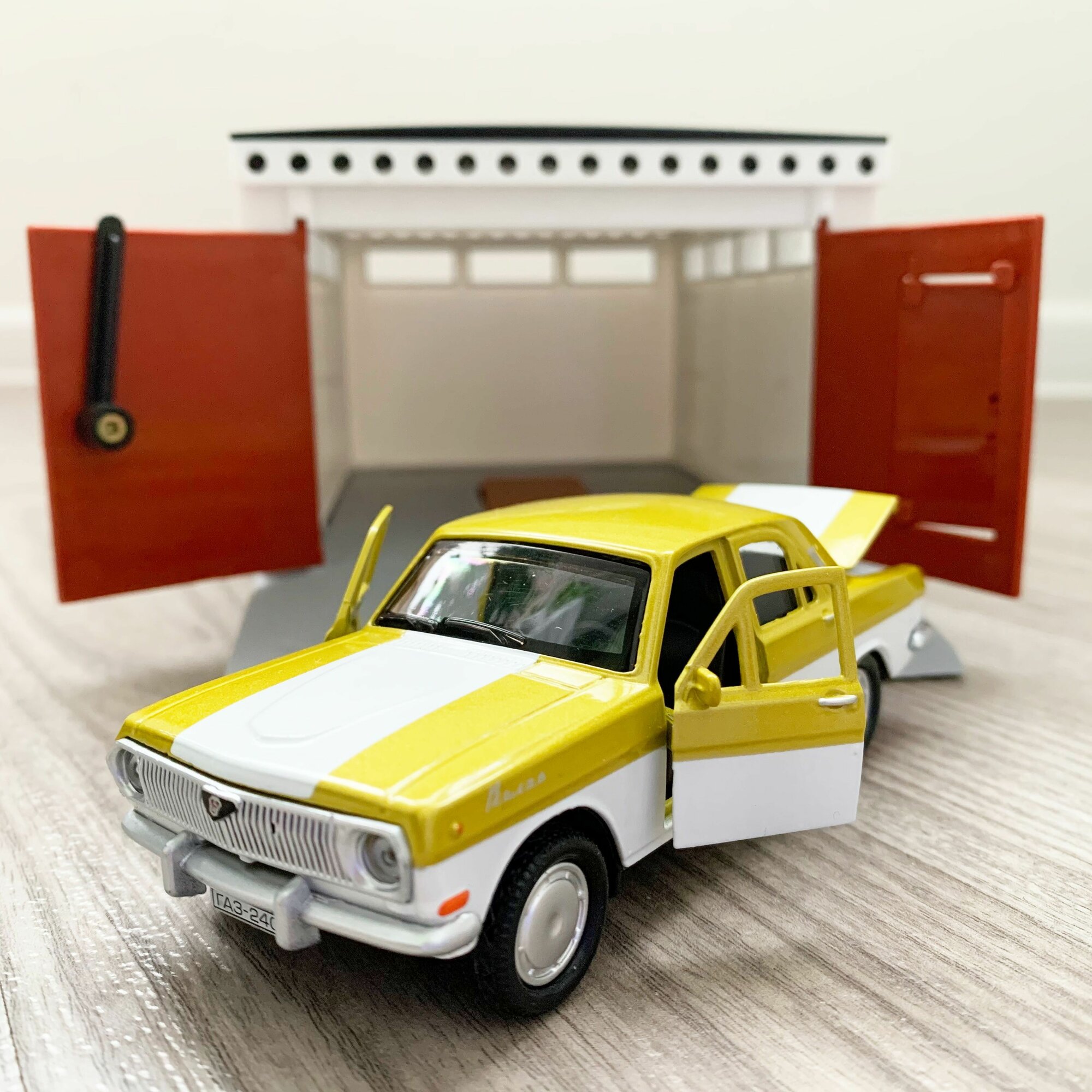 Купить Гараж + Волга ГАЗ 2401 (седан, 12 см, метал, инерц, откр. дверей и багажника) - золотой