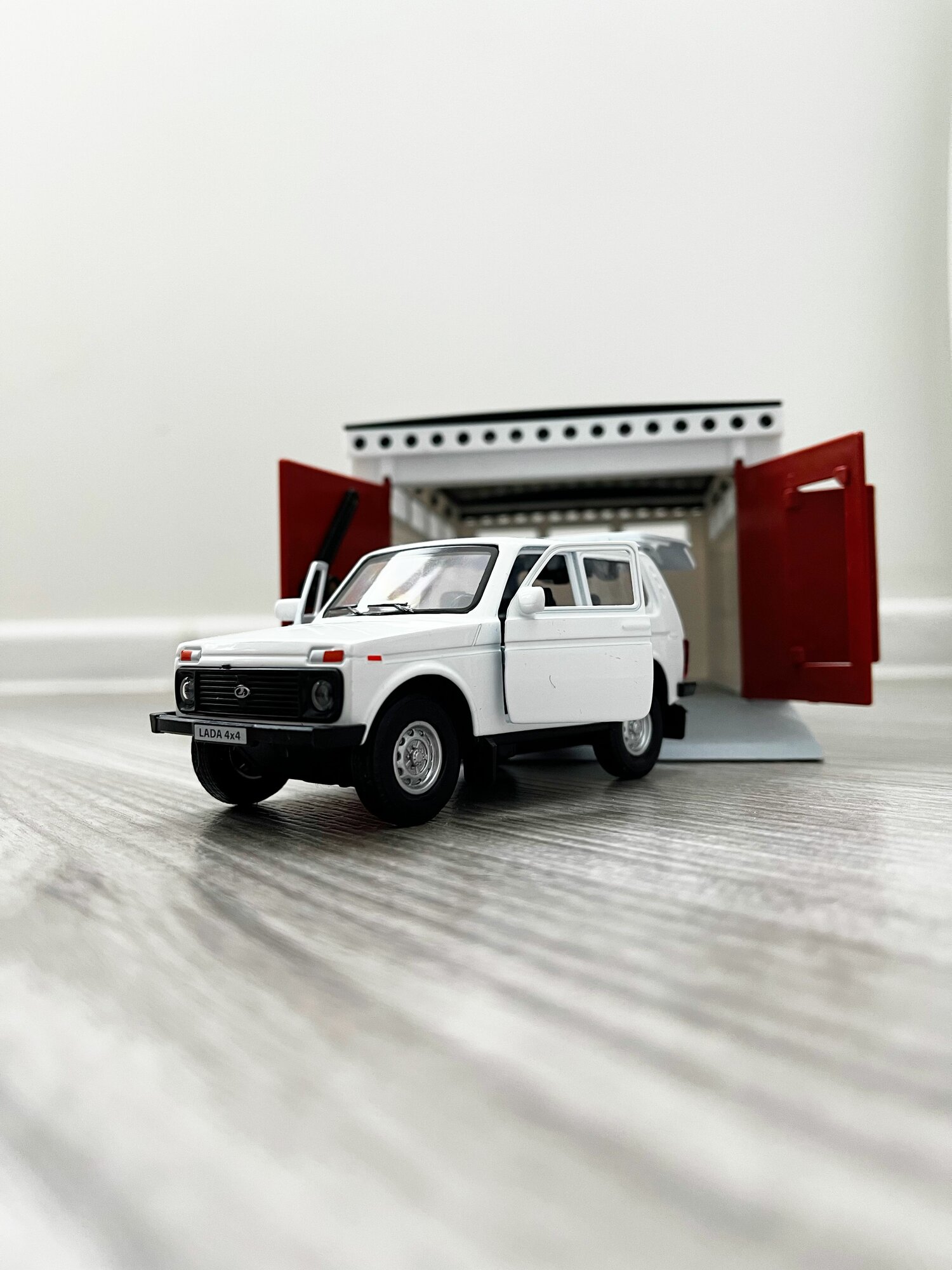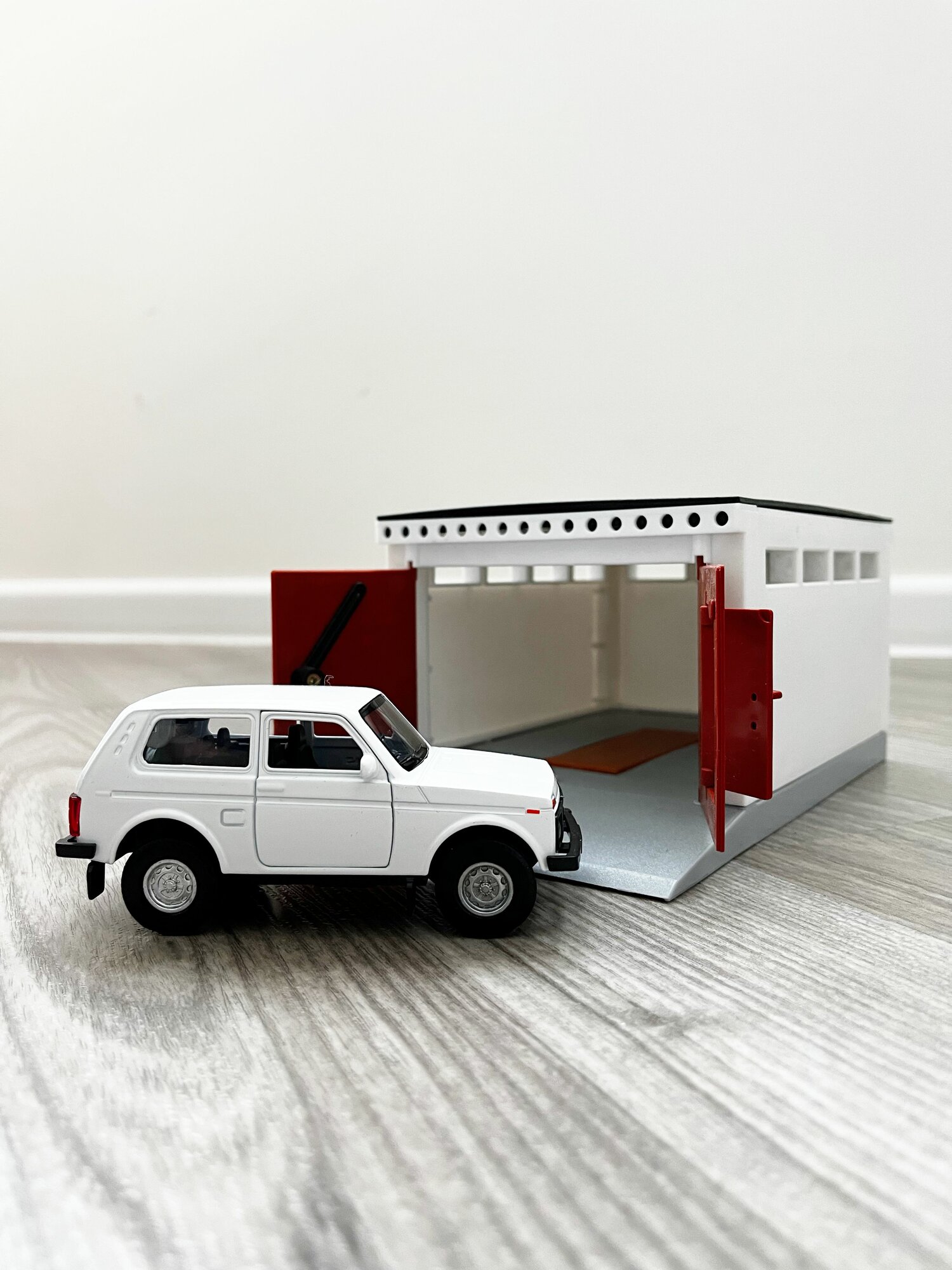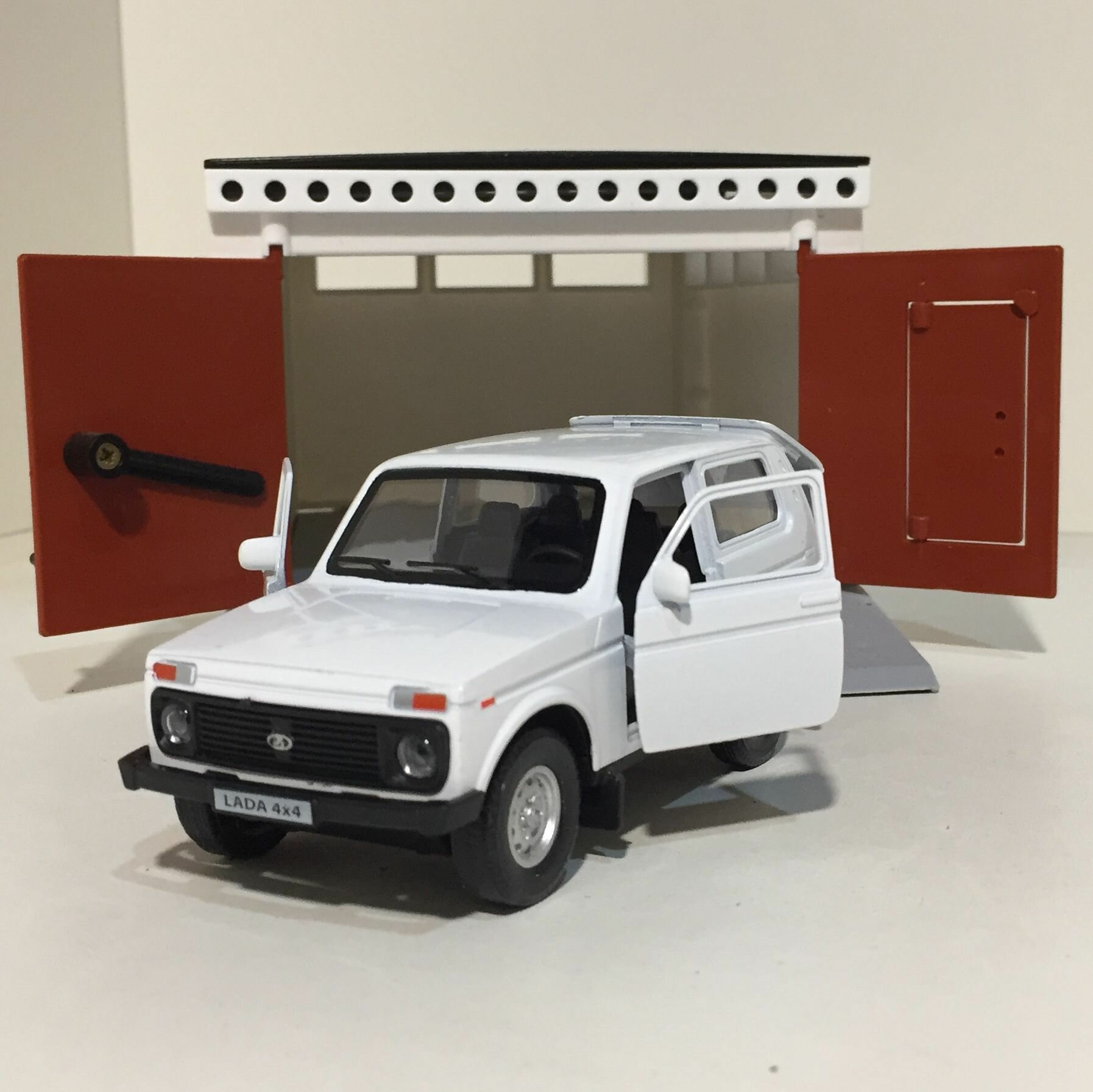 Гараж + Lada Niva 2121 (белая) - 12 см, металл, инерция, открытие 2-х дверей и багажника интересное: