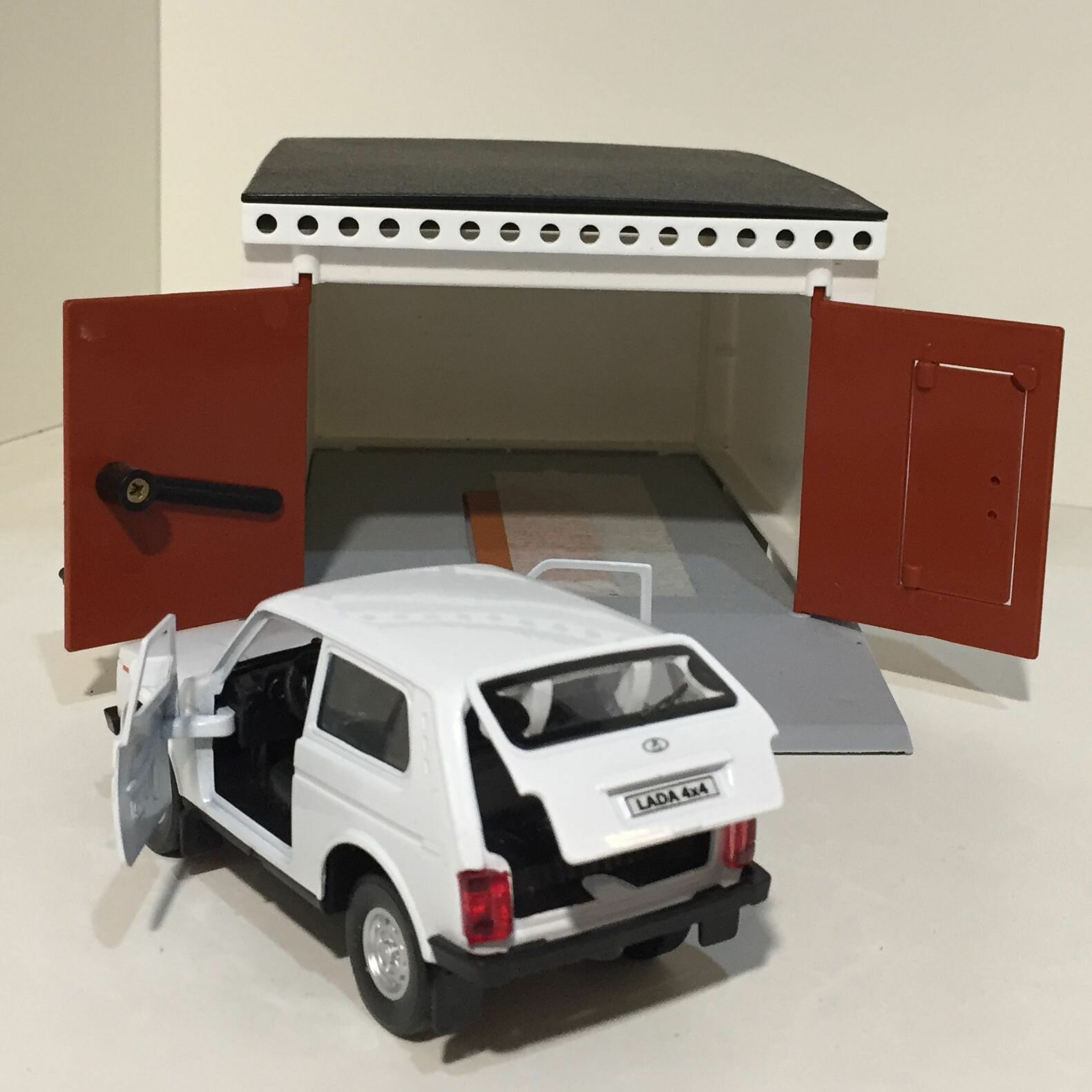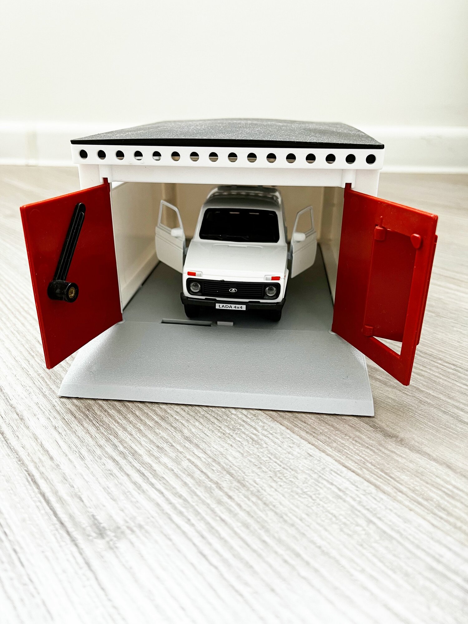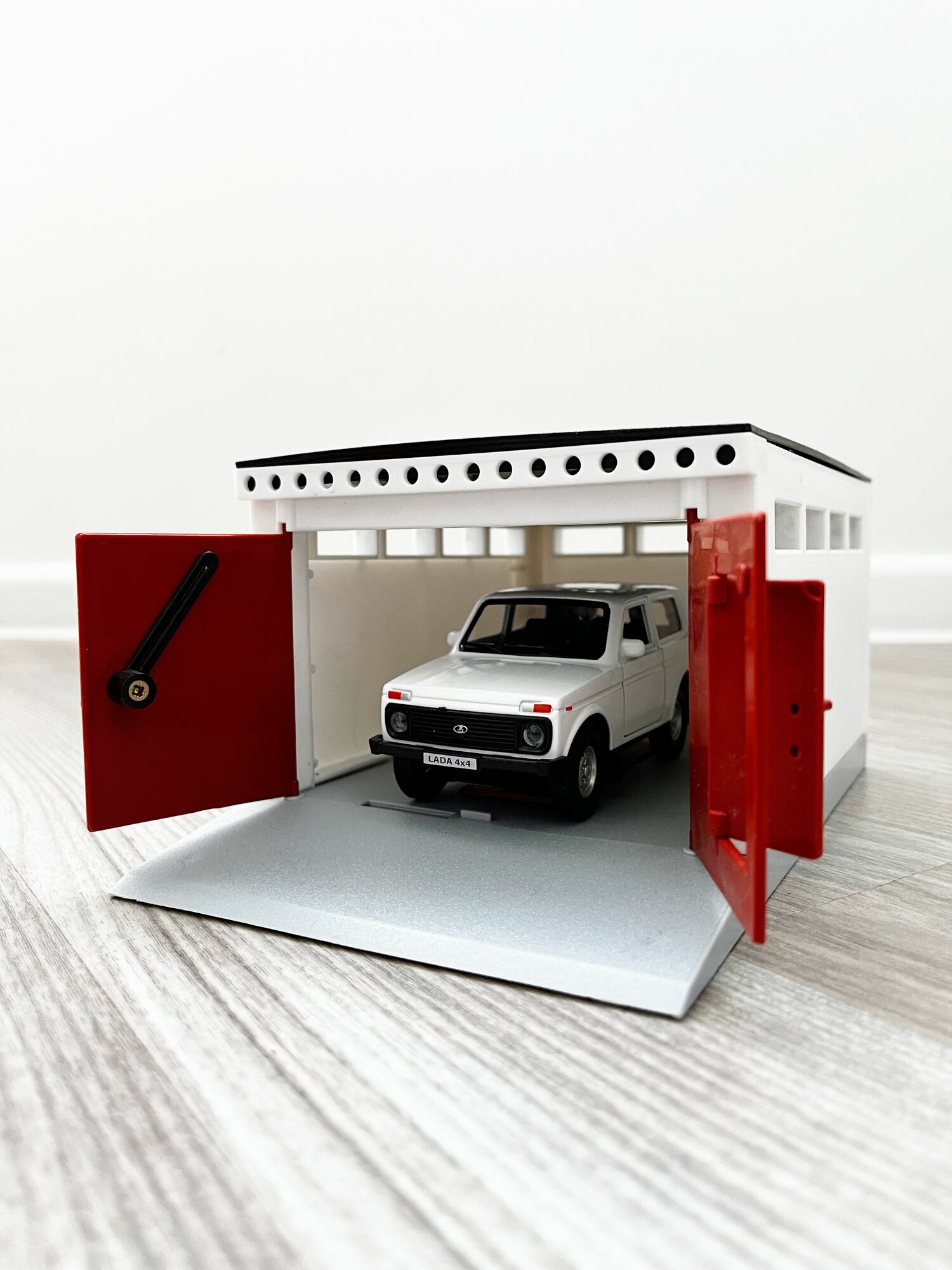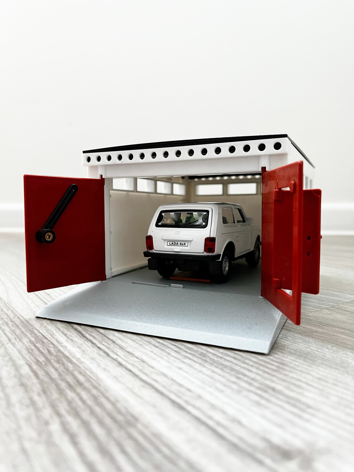 Гараж + Lada Niva 2121 (белая) - 12 см, металл, инерция, открытие 2-х дверей и багажника интересное:
