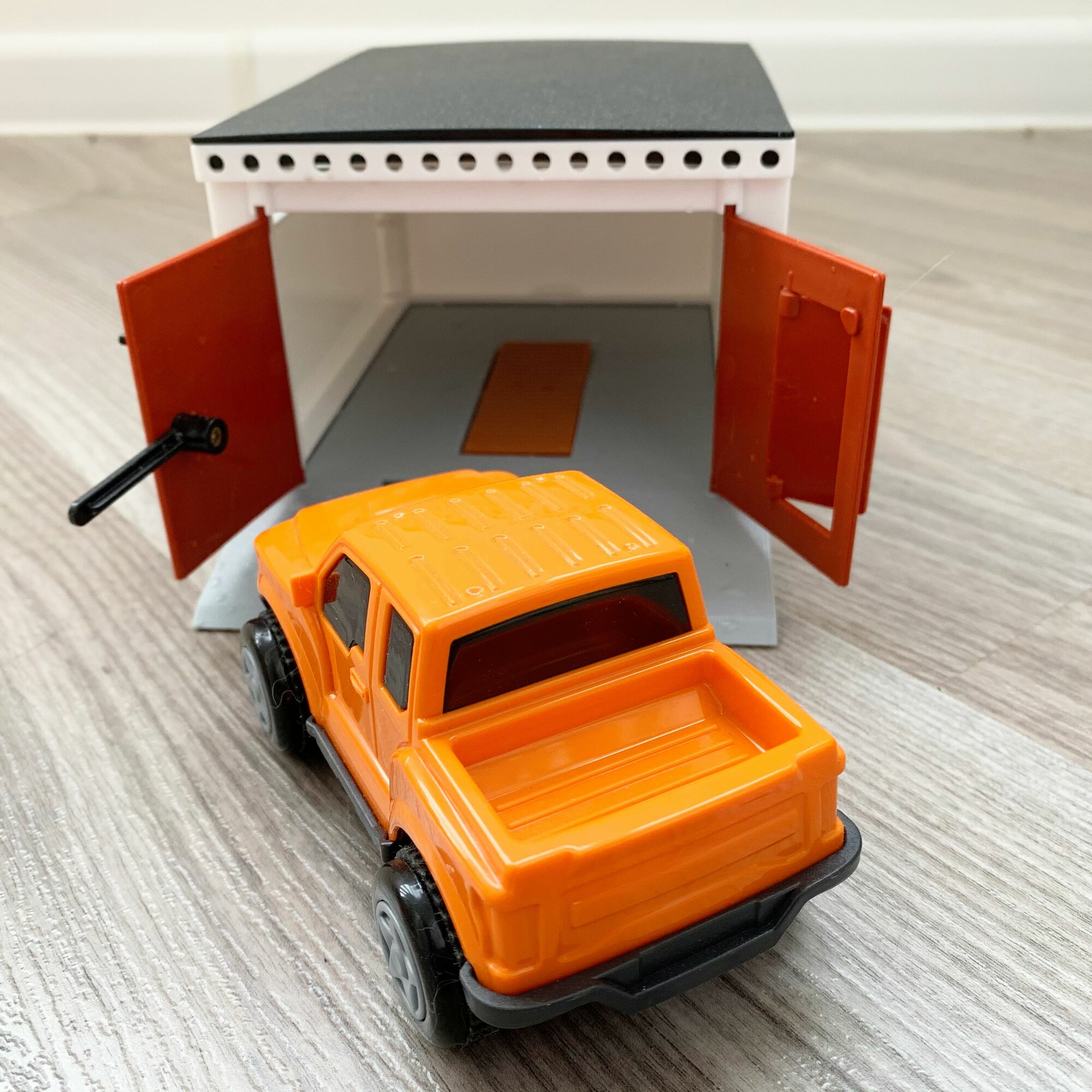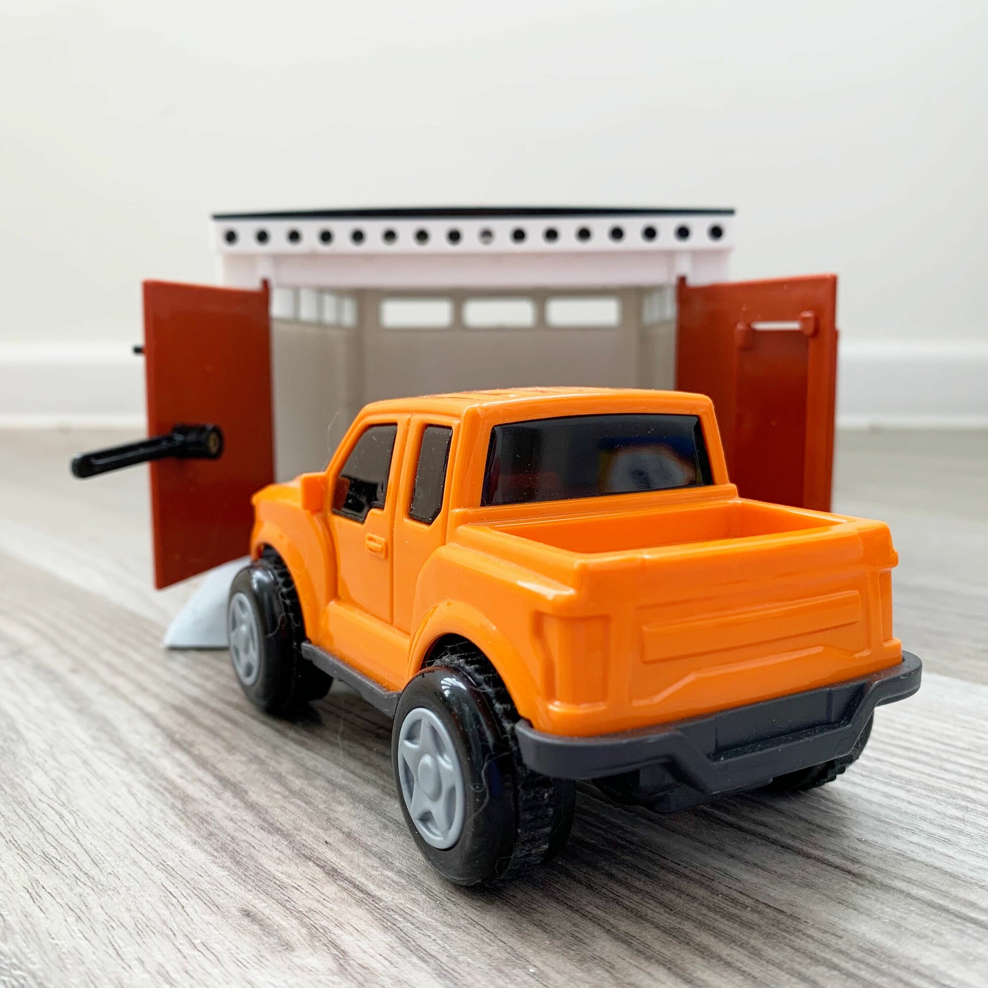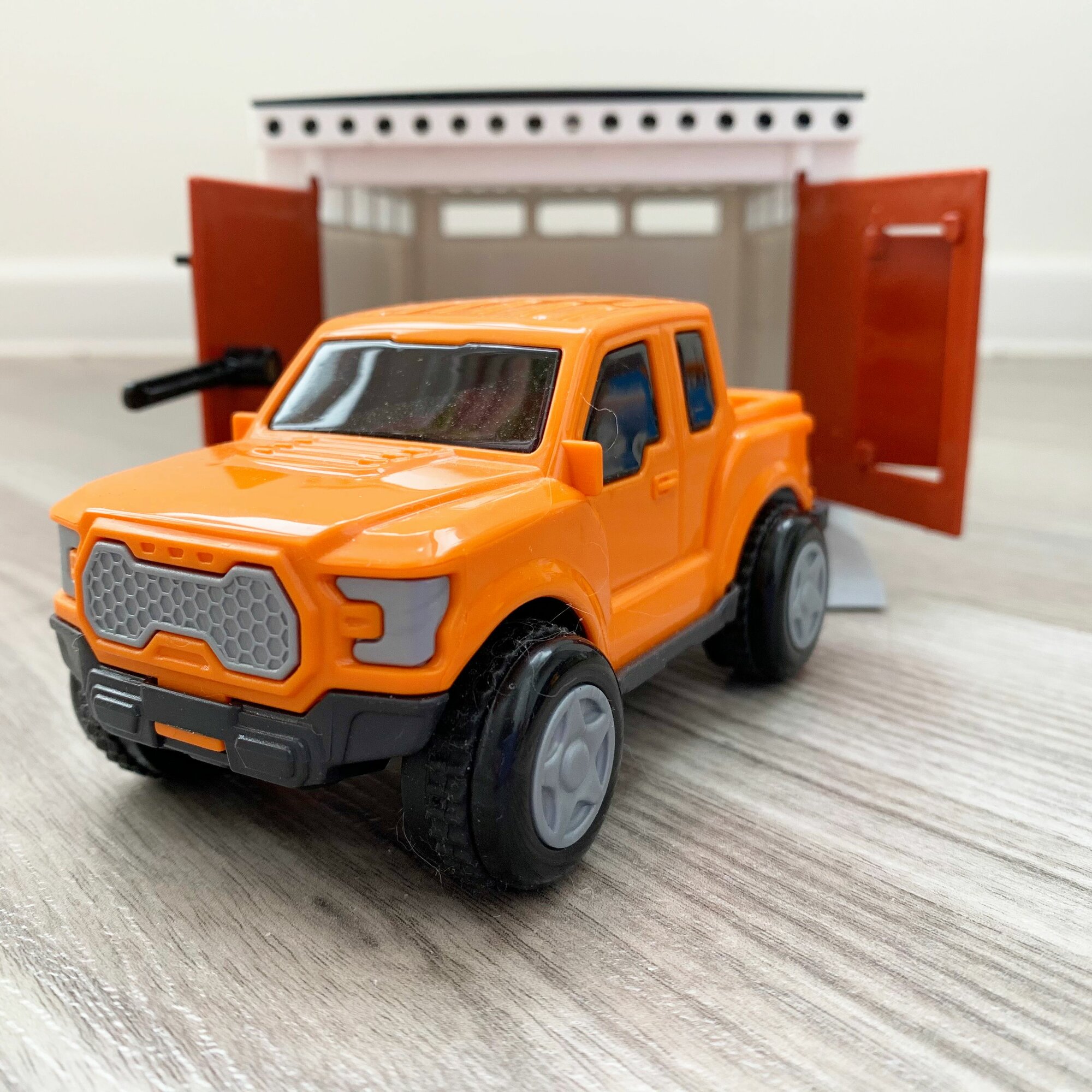 Гараж с распашными воротами + пластмассовая инерционная машинка пикап 12 см / Полесье оранжевый интересное: