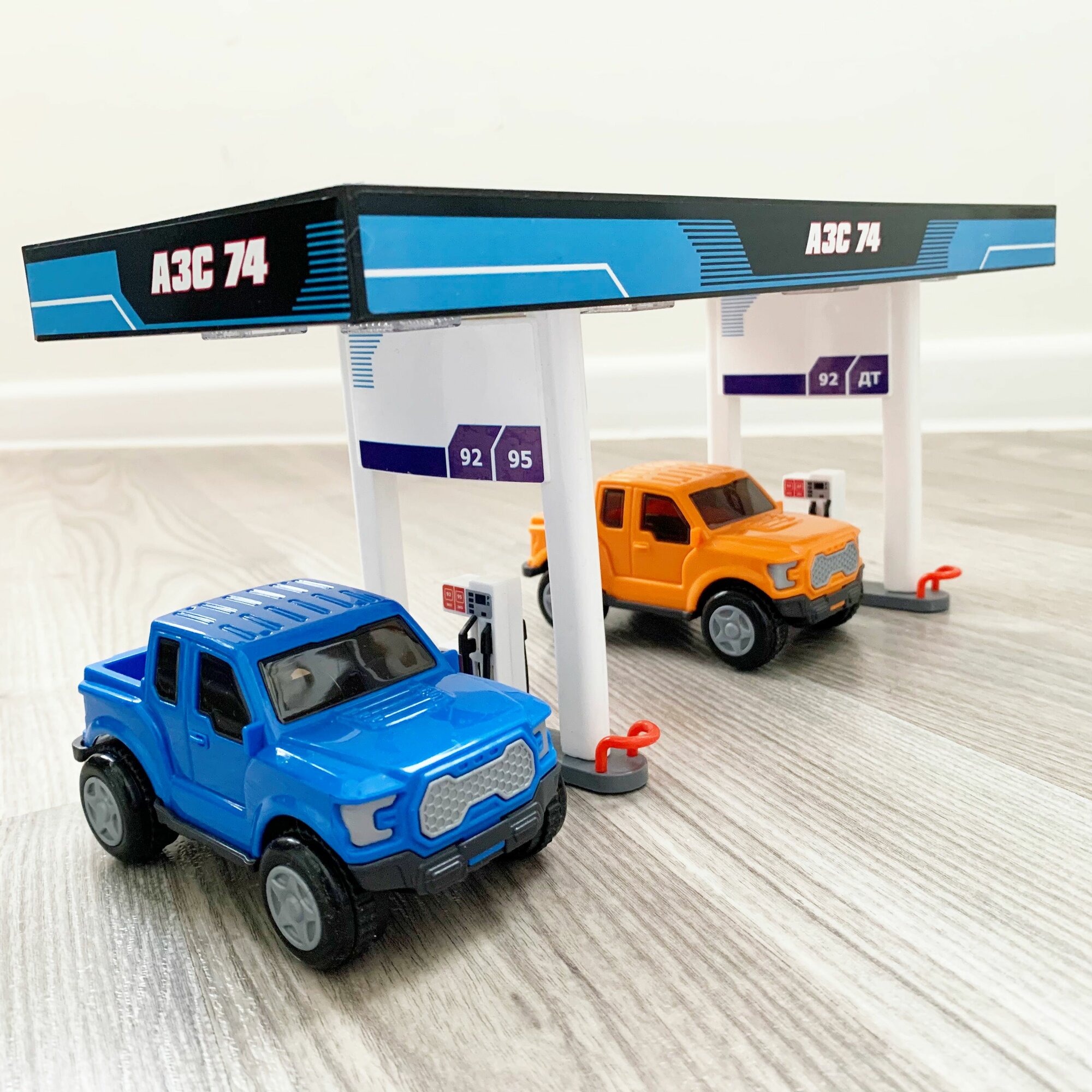 Автозаправка + 2 машинки пикап (12 см, пластик, инерция) / Полесье синий интересное: