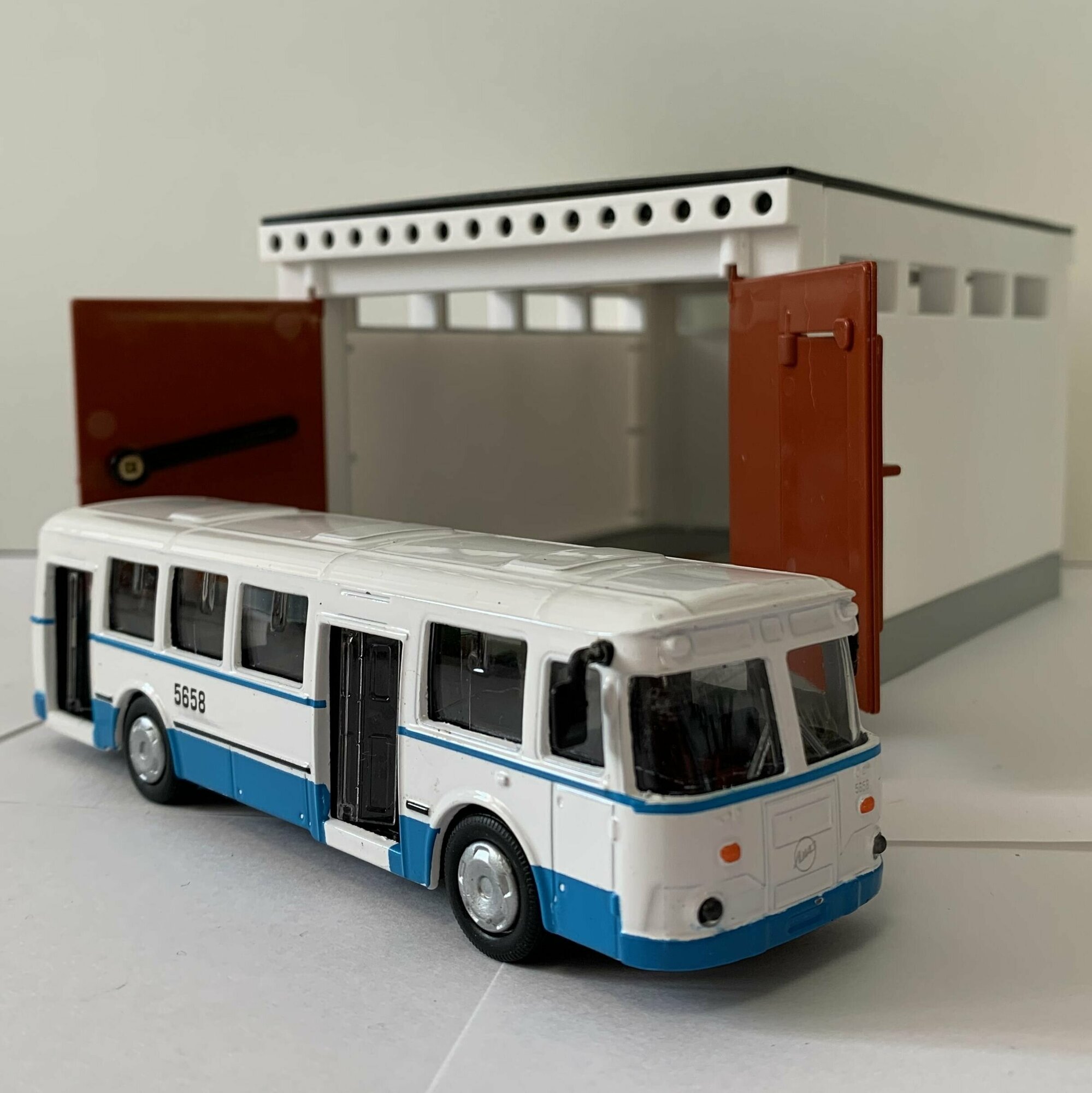 Гараж с воротами + автобус лиаз 677 (15 см, метал, инерция, откр. дверей) - сине-белый интересное: