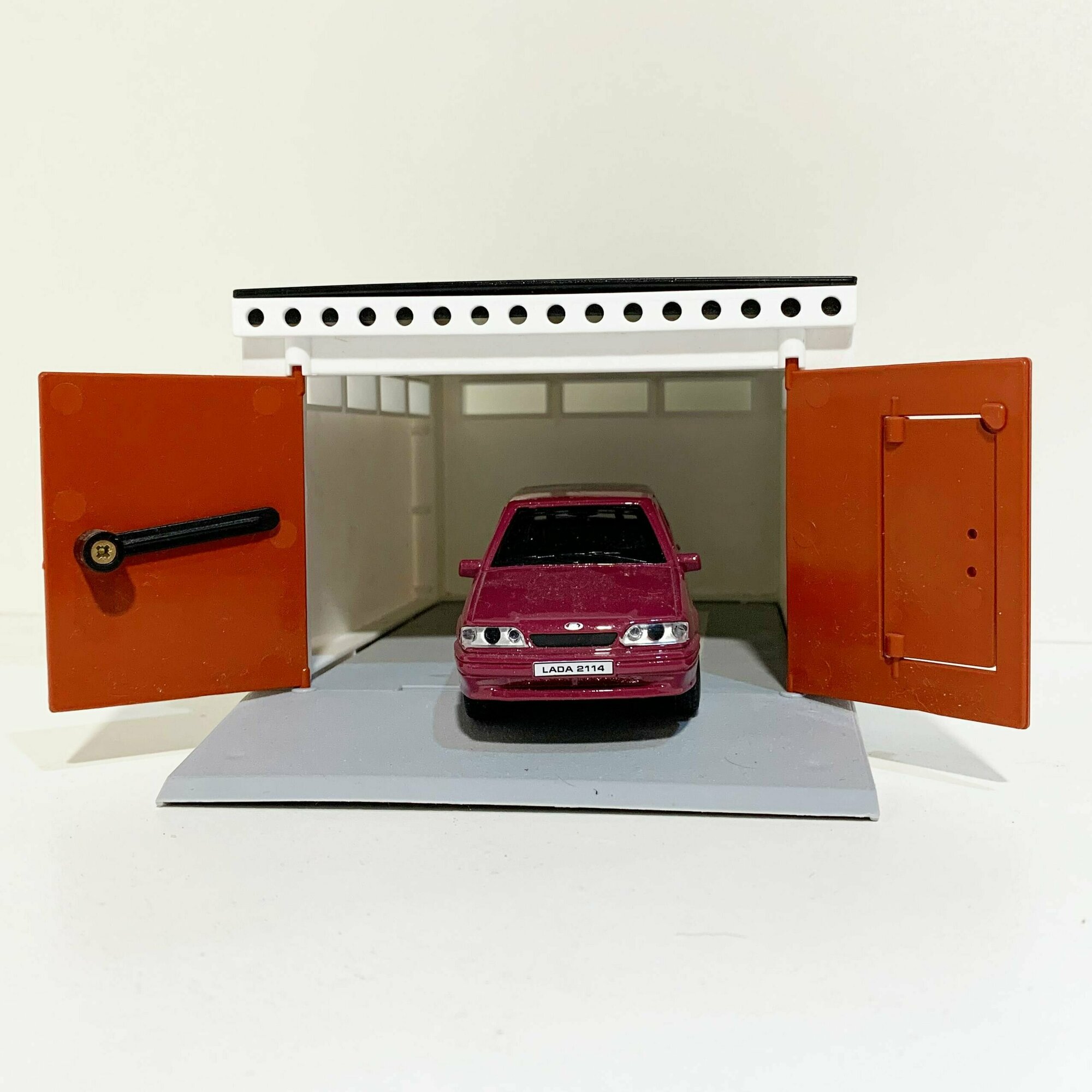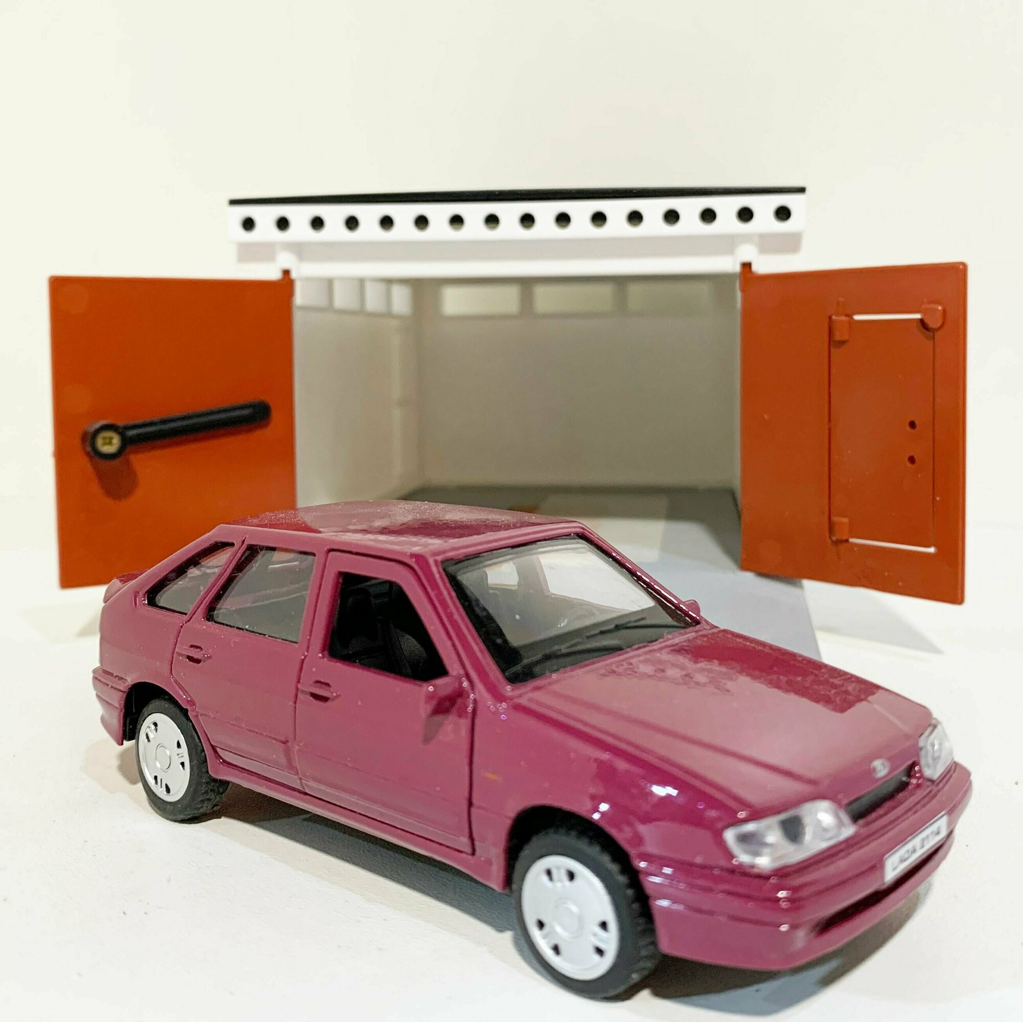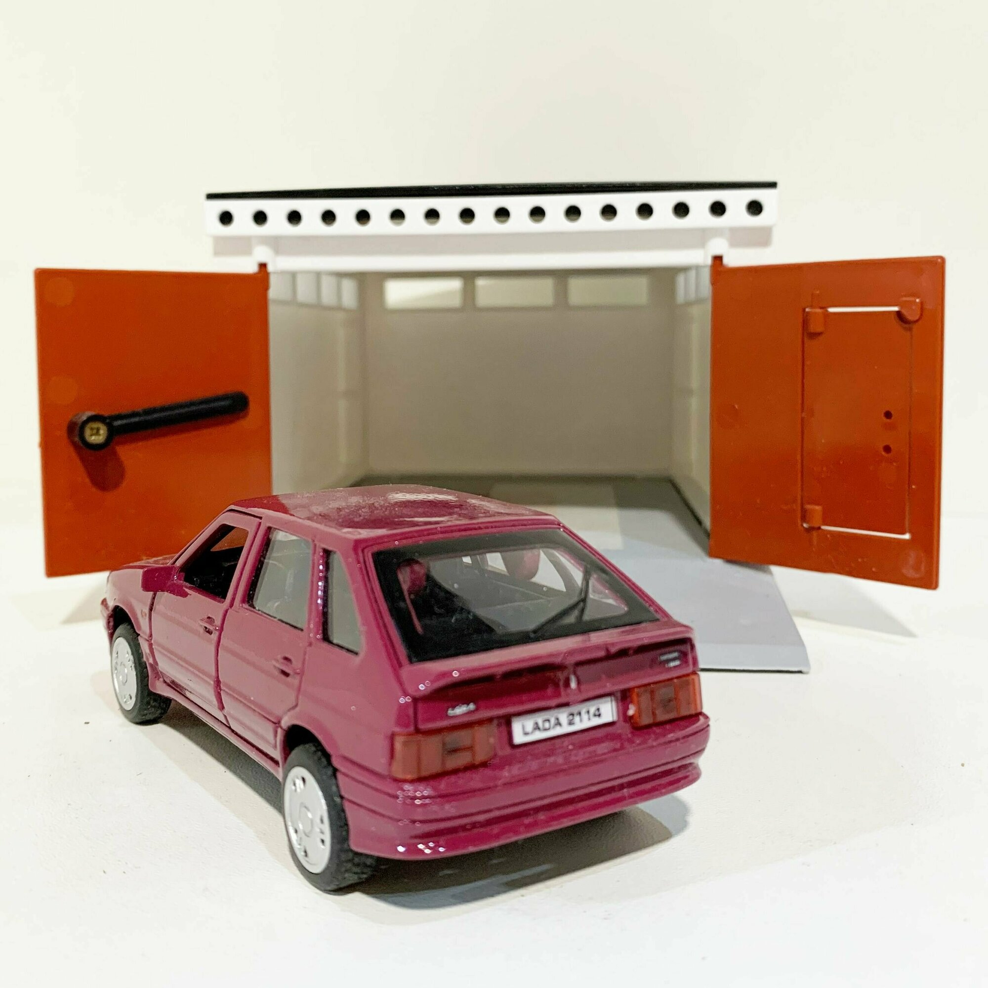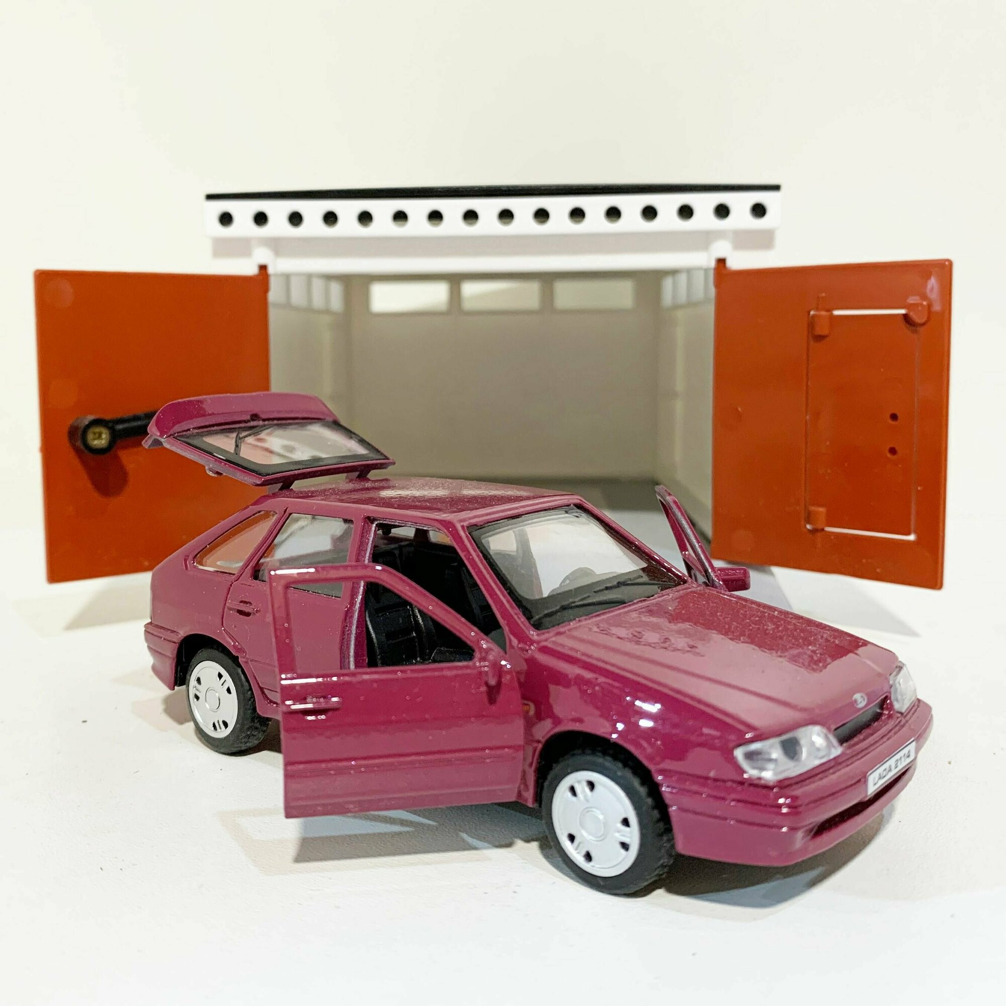 Купить Гараж ретро и металлическая инерционная машинка ВАЗ 2114 (инерция, 12 см, откр. 2-х дверей и багажника) -бордовая