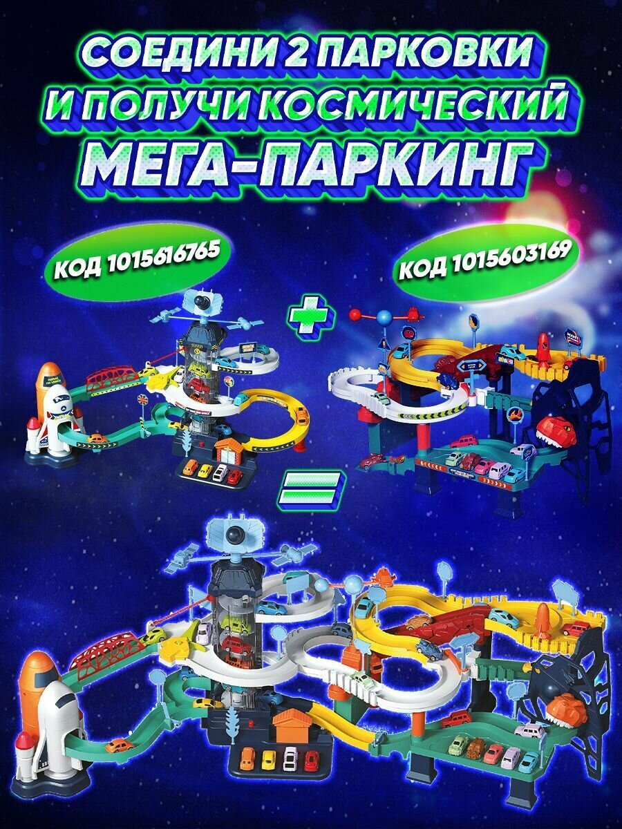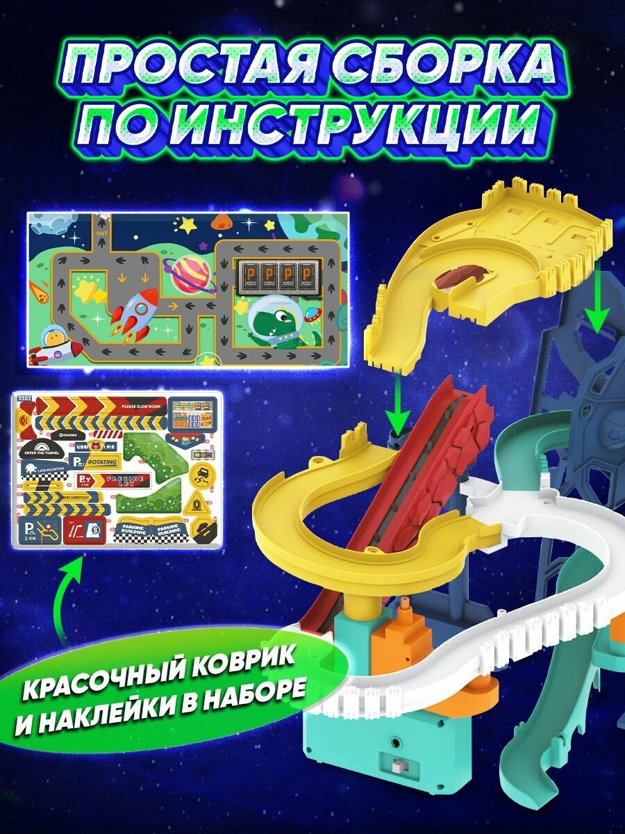 Парковка для машинок с музыкой Play Okay "Динозавры в космосе", Гараж детский с горкой, Игровой набор, Конструктор паркинг интересное: